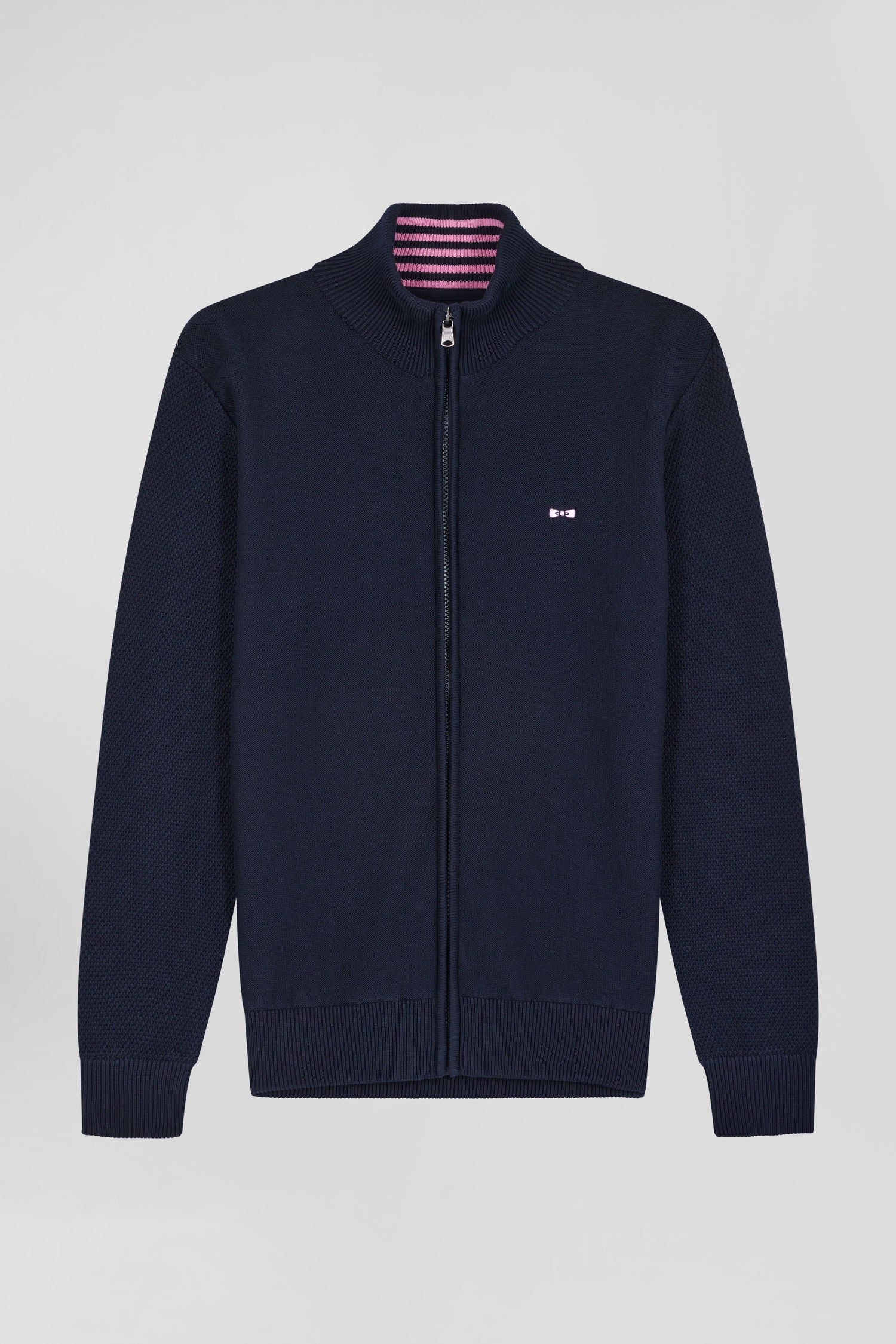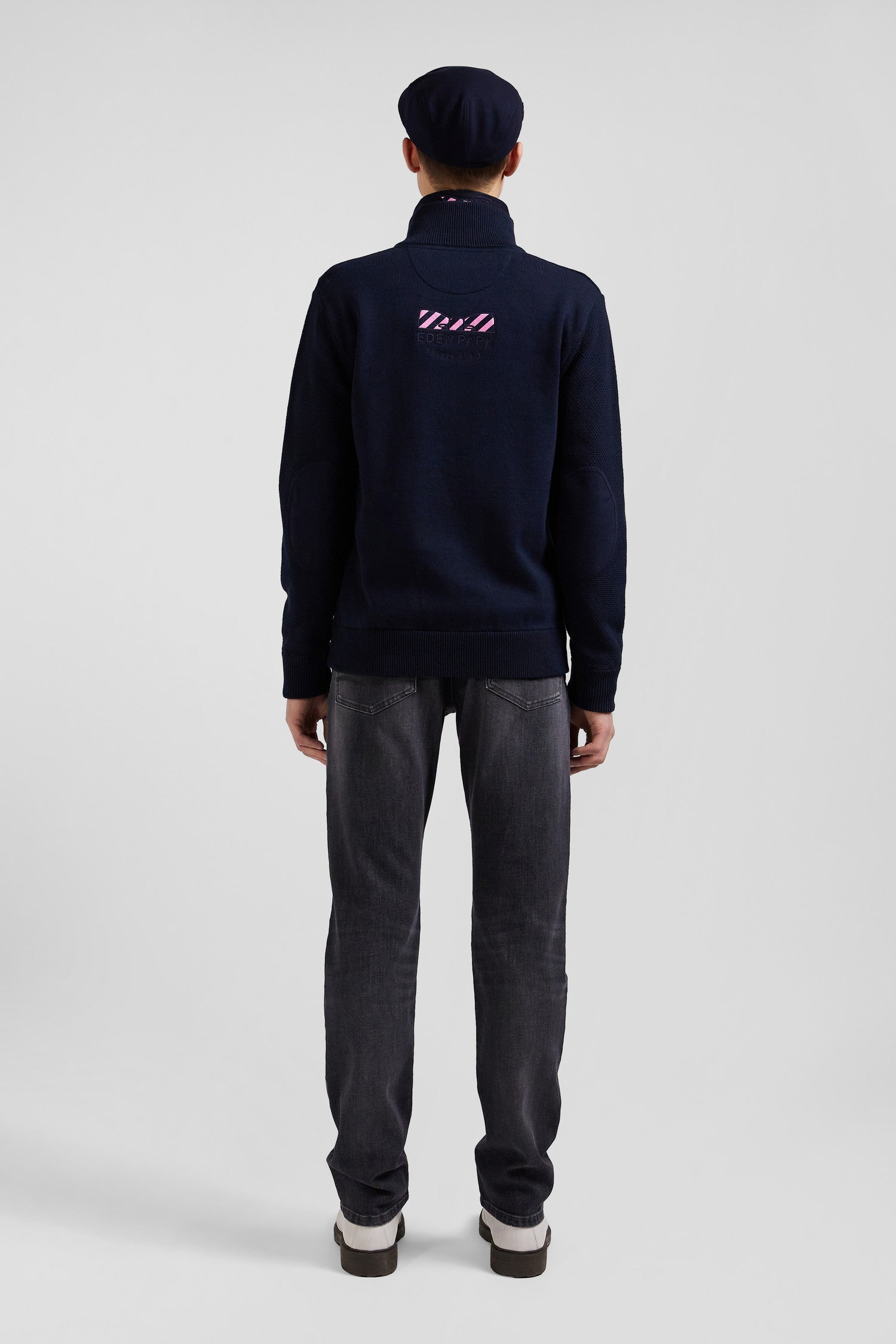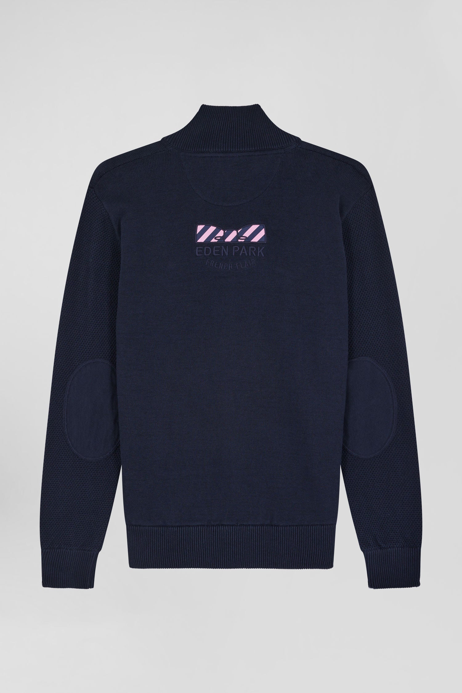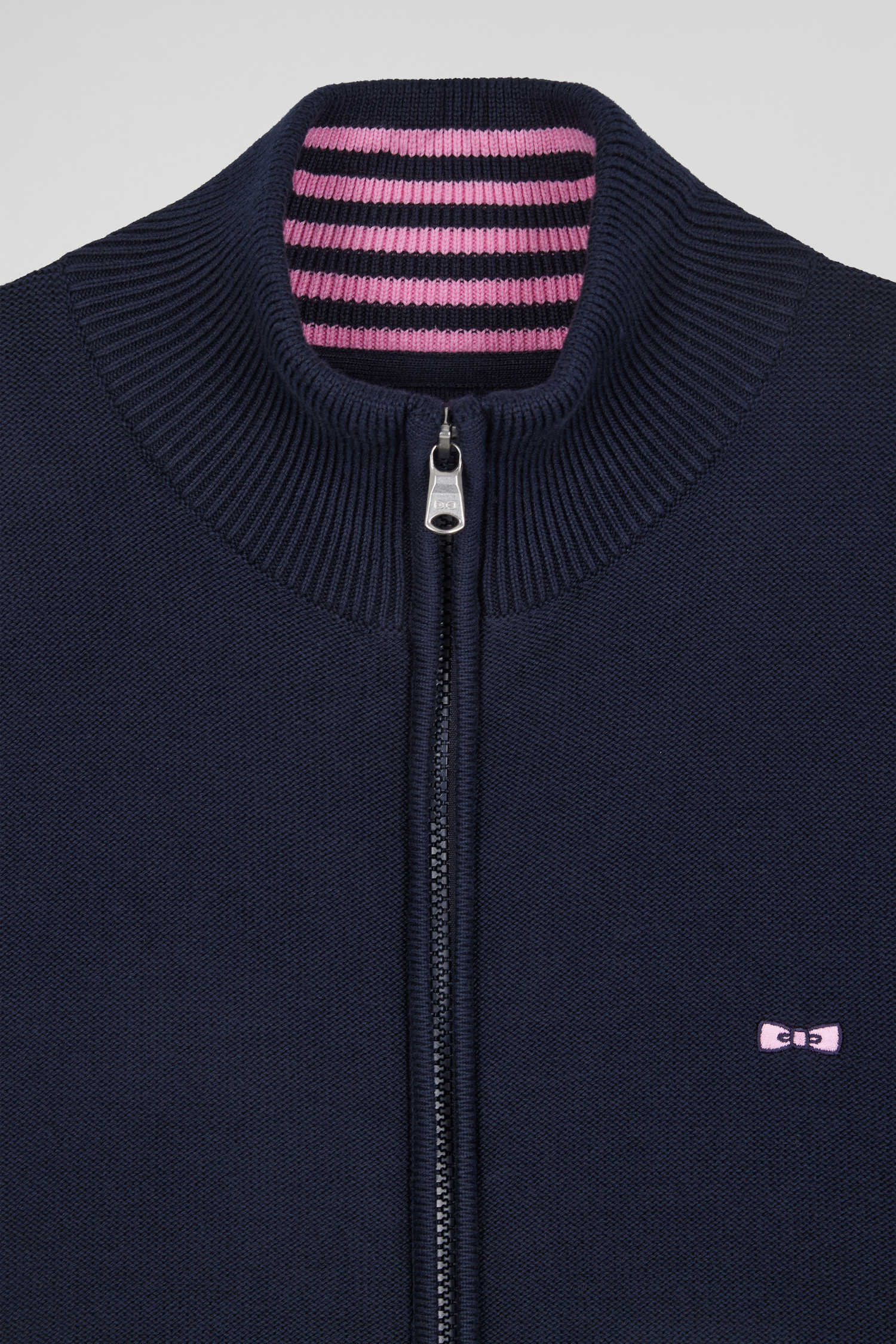 Ce cardigan zippé en coton doux et léger se dote de codes iconiques de notre Maison dans une version marine et rose. Son intérieur de col à rayures tricolores se révèlera porté ouvert tandis que sur la poitrine et au dos notre emblème nœud papillon est retravaillée avec originalité.