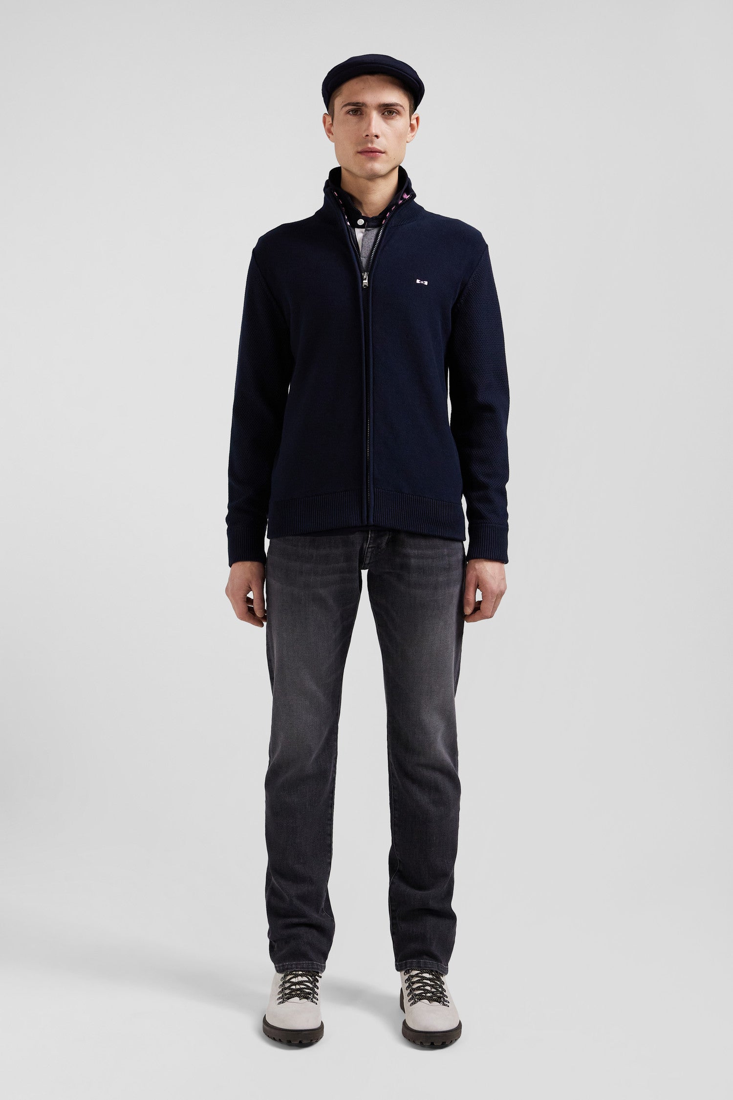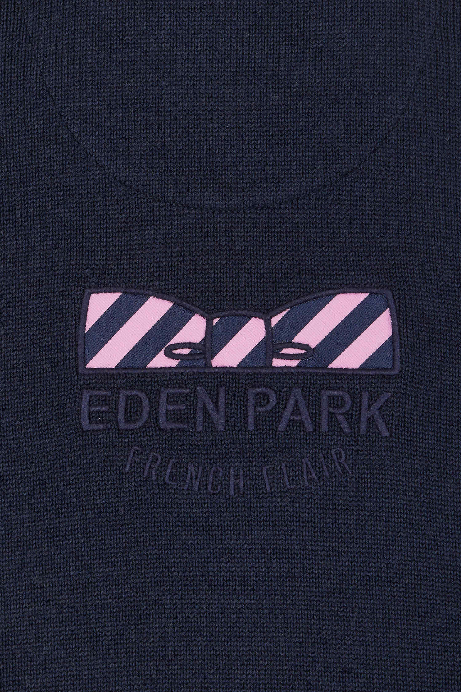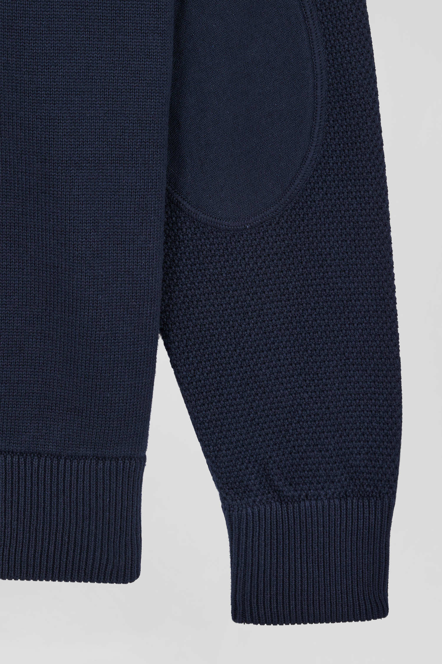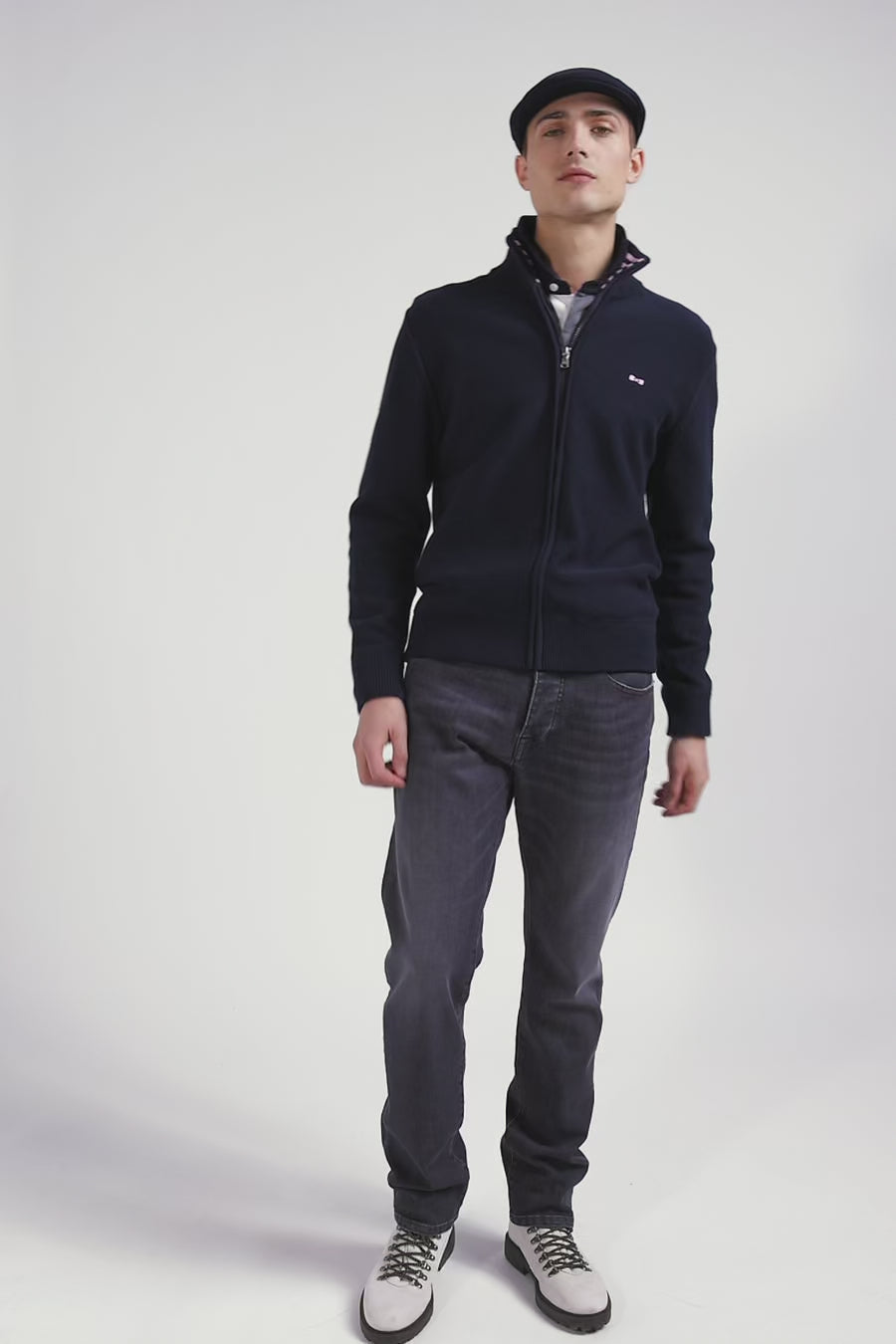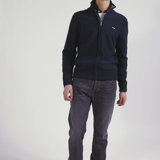 Ce cardigan zippé en coton doux et léger se dote de codes iconiques de notre Maison dans une version marine et rose. Son intérieur de col à rayures tricolores se révèlera porté ouvert tandis que sur la poitrine et au dos notre emblème nœud papillon est retravaillée avec originalité.
