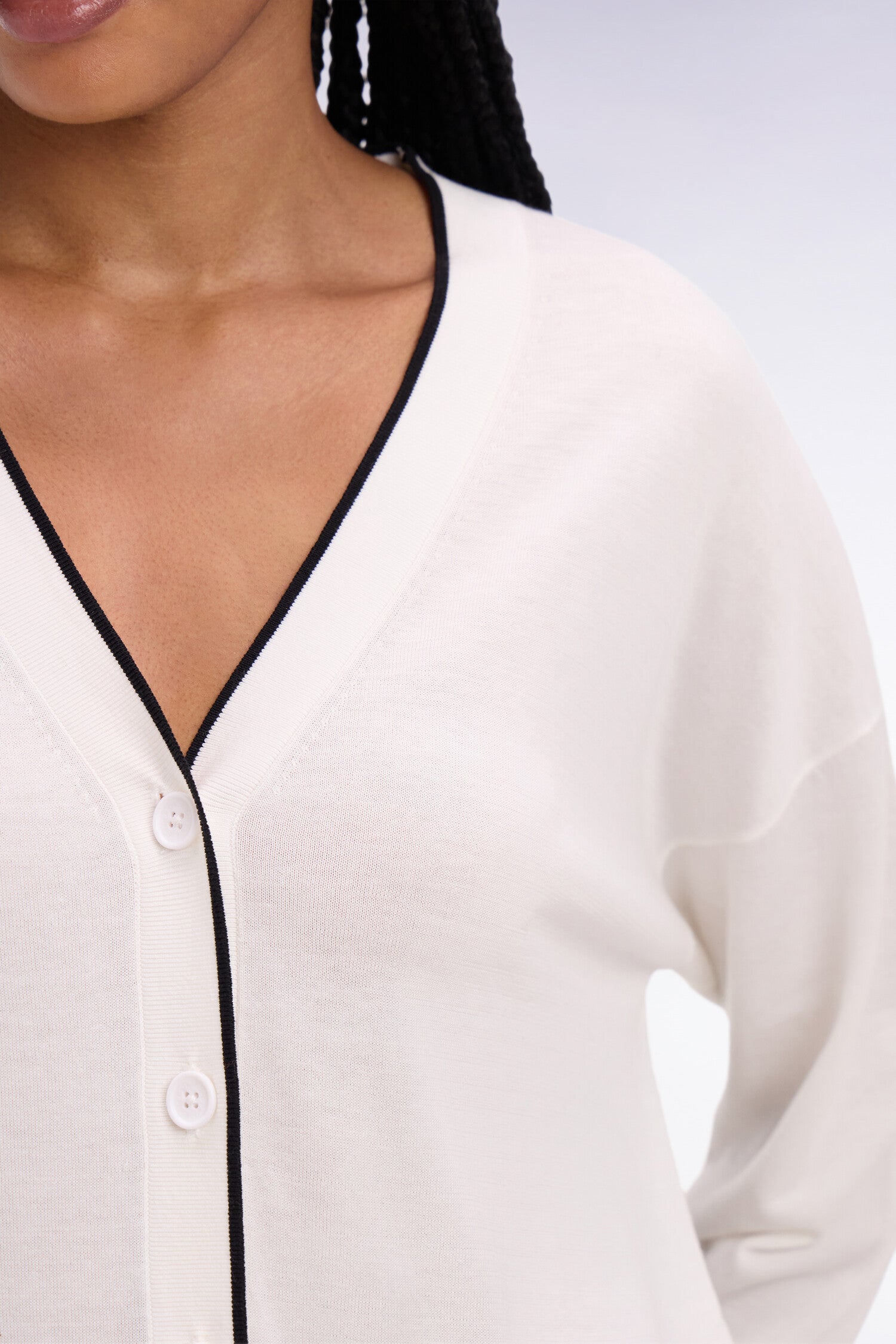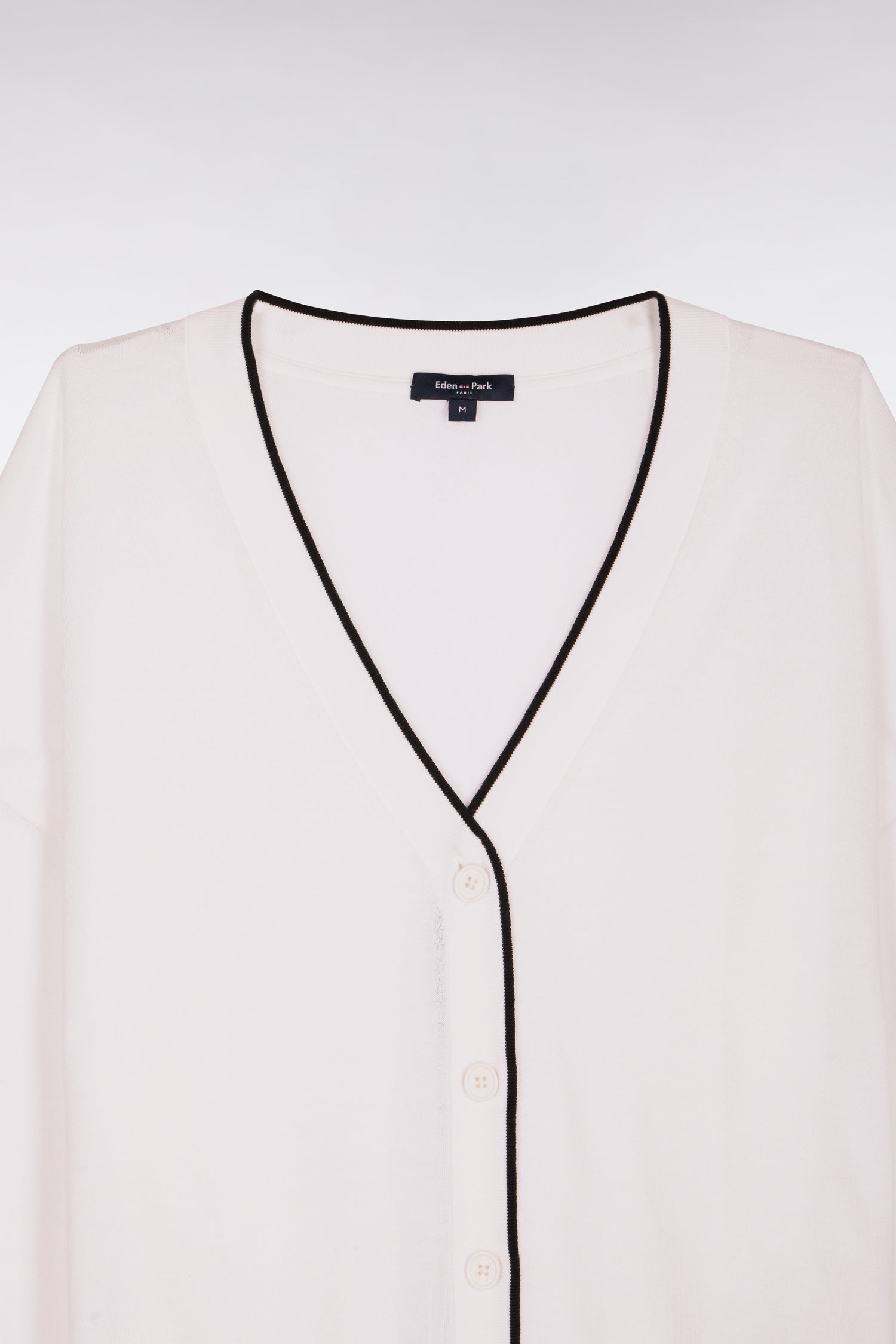 Notre cardigan col V, confectionné dans un mélange fluide et léger de Tencel, coton et soie, séduit par sa douceur exceptionnelle et son tomber. Sa coupe relaxed assure une allure effortless, tandis que le liseré contrasté en bordure d'encolure et patte de boutonnage structure délicatement la silhouette, se déclinant en noir ou en blanc selon le coloris choisi pour renforcer le caractère graphique de ce cardigan. À porter sur un débardeur près du corps, son pull à manches courtes dans l'un ou l'autre des coloris ou à même la peau pour apprécier toute sa douceur. Cardigan femme offert en coloris noir ou blanc.