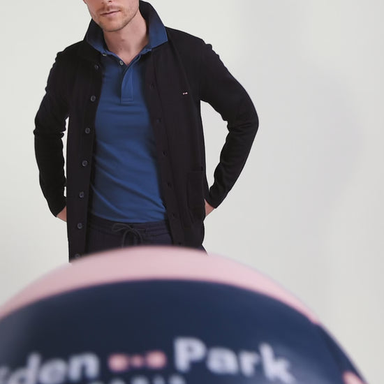 Notre luxueux cardigan boutonné en laine mérinos allie chaleur et raffinement. Sa patte de boutonnage, finement tricotée, s'associe à un col de style maillot de rugby, rehaussé d'un effet pied de col en tricotage milano, pour une touche plus sportive. Ses finitions tricotées et ses deux poches plaquées ajoutent une élégance fonctionnelle à ce cardigan masculin. Cette pièce, parfaite pour les superpositions automnales, est un incontournable pour une allure à la fois classique et contemporaine.