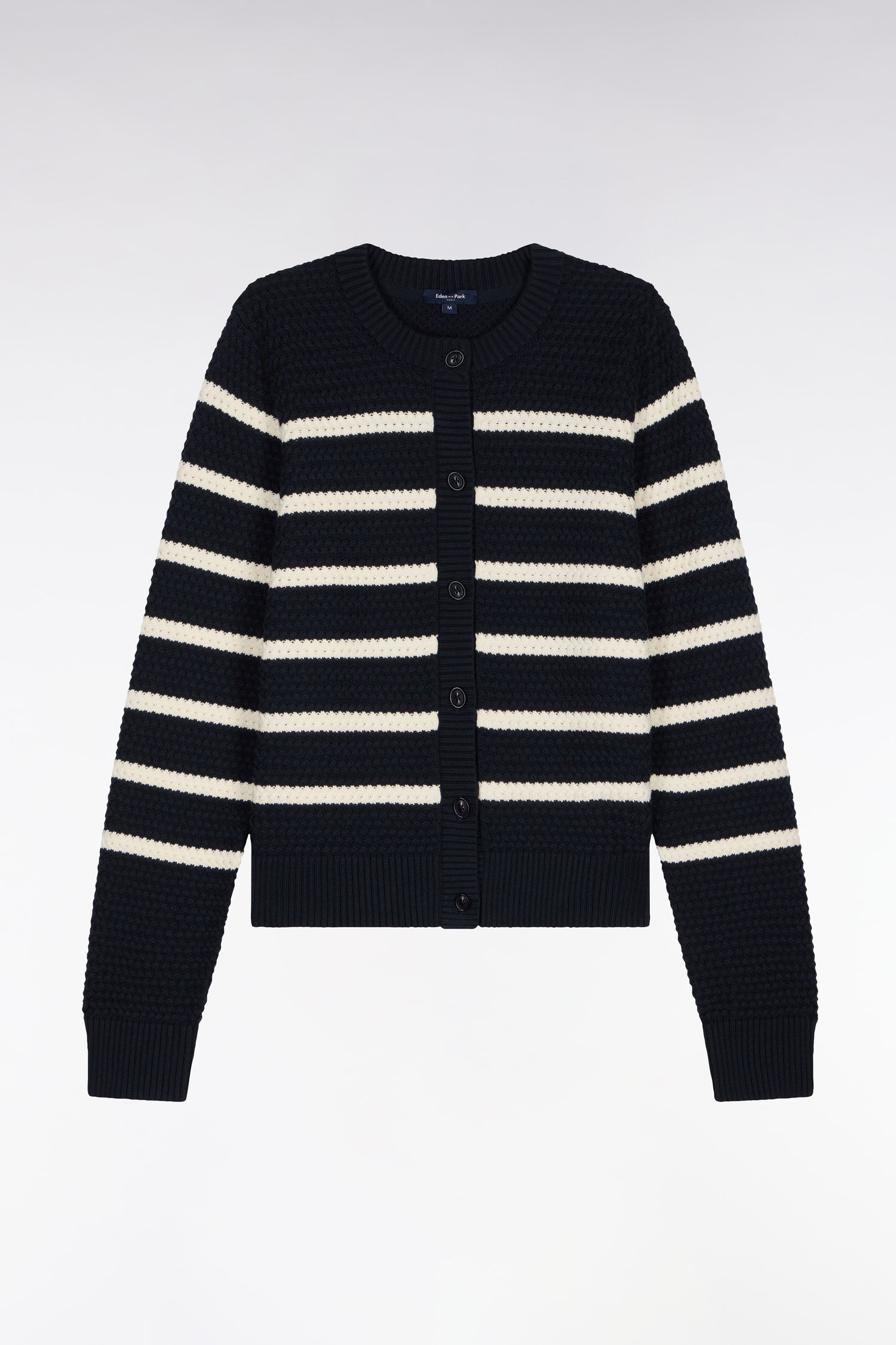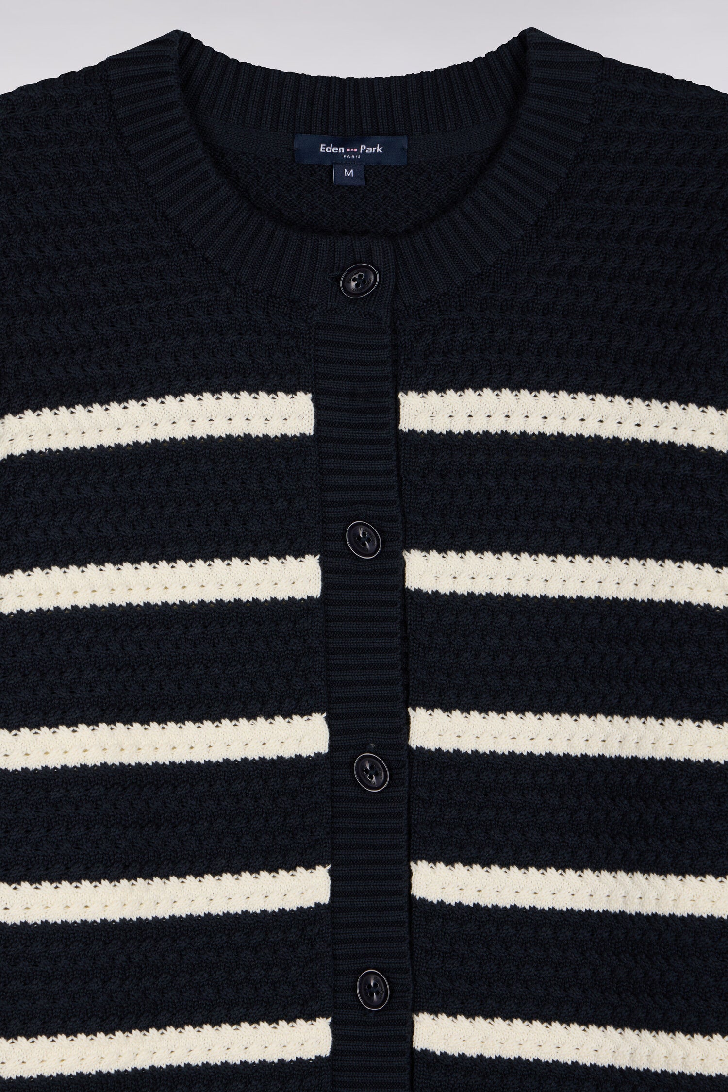 Ce cardigan d'inspiration marinière confectionné par nos ateliers en maille tressée en pur coton revisite un classique du vestiaire féminin avec une touche graphique et contemporaine plus estivale. Décliné en beige ou en marine, il séduit par son jeu de textures et ses rayures subtilement contrastées qui apportent profondeur et relief. Sa coupe confortable et ses finitions en bord-côtes structurent la silhouette féminine avec élégance. Porté ouvert sur le pull manches courtes assorti ou fermé avec un jean flaire, ce cardigan rayé compose des tenues féminines à la fois modernes et intemporels. Glissez ce cardigan dans votre valise pour réchauffer une soirée d'été venteuse.