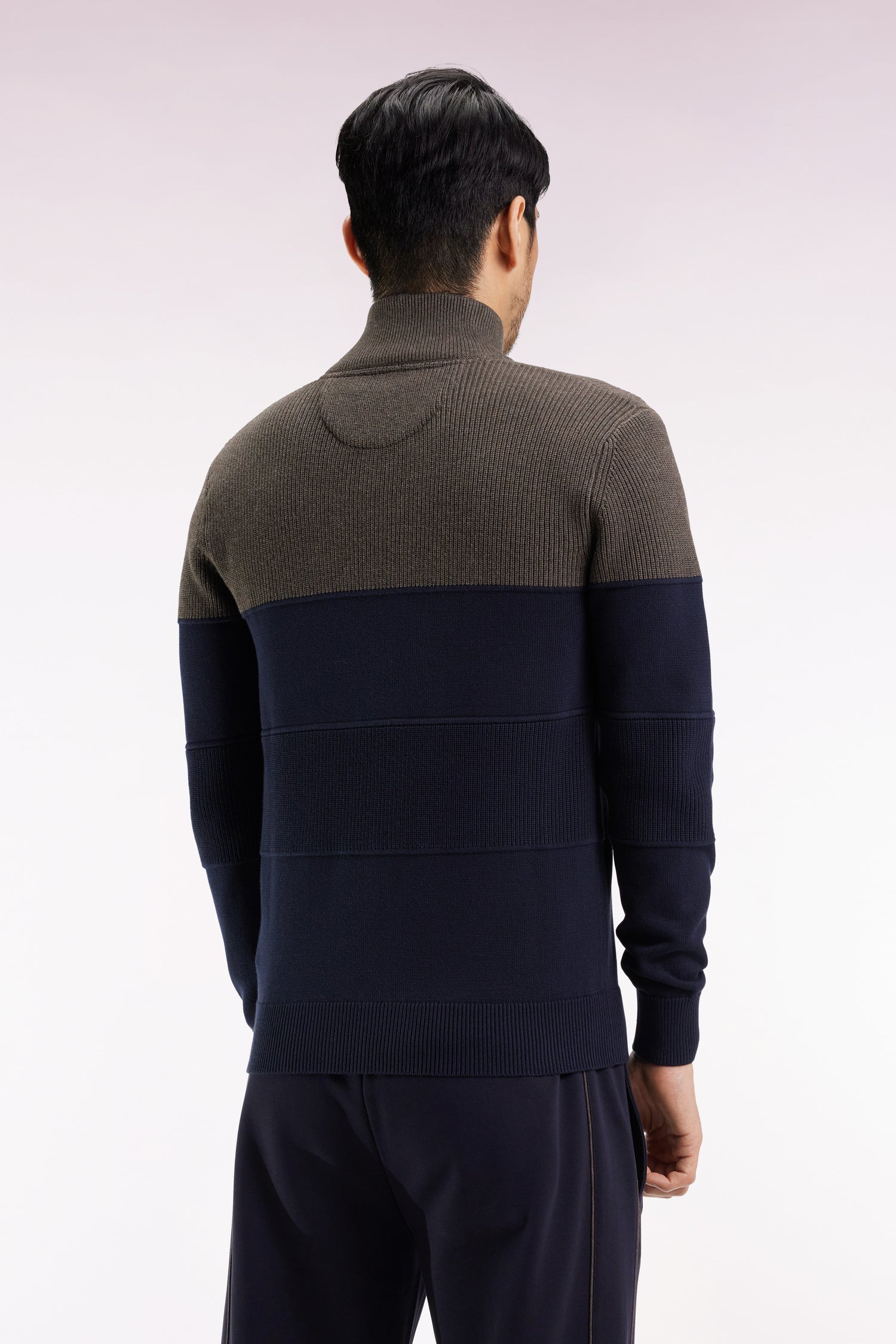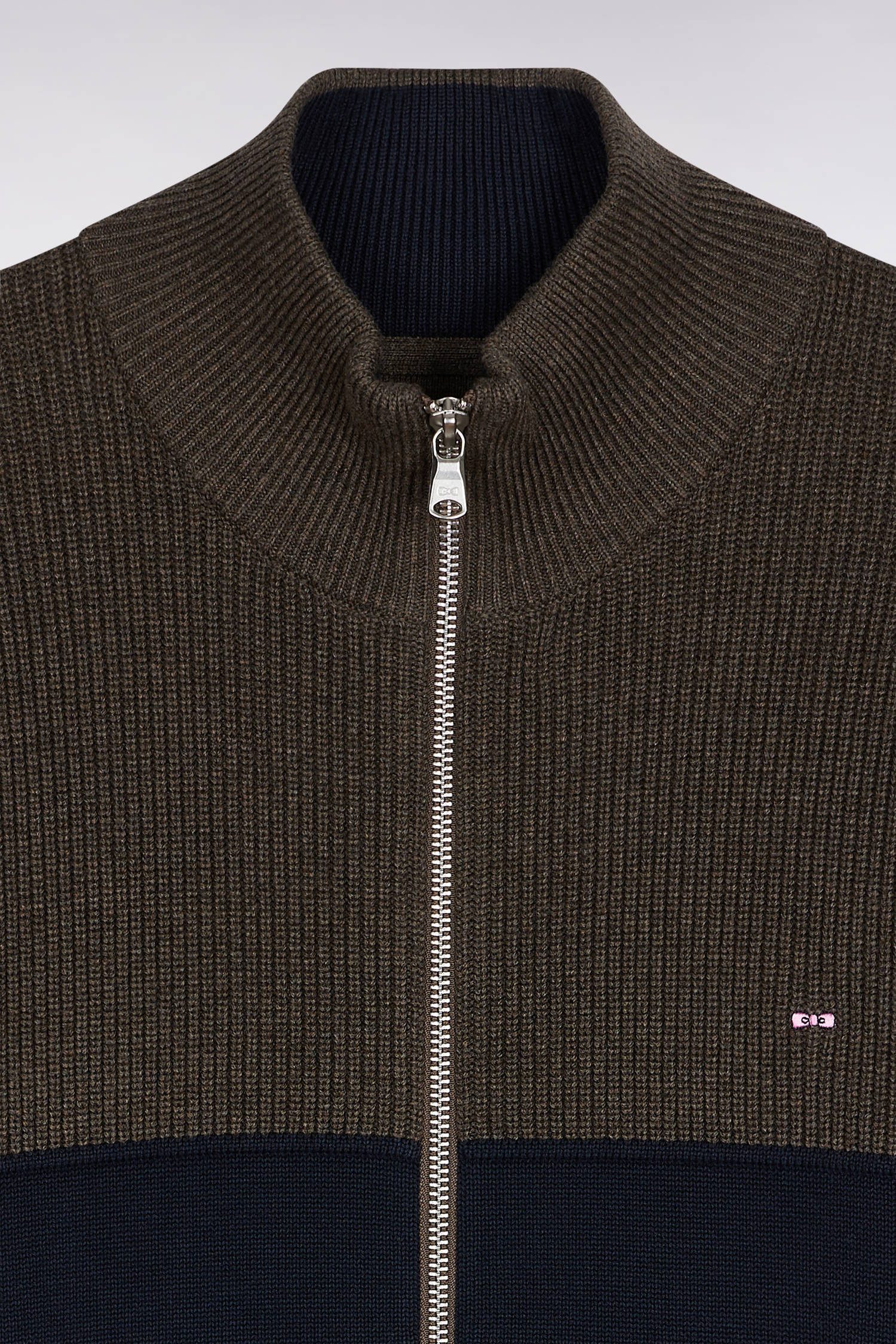 Cardigan zippé en coton bicolore marine et marron coupe droite