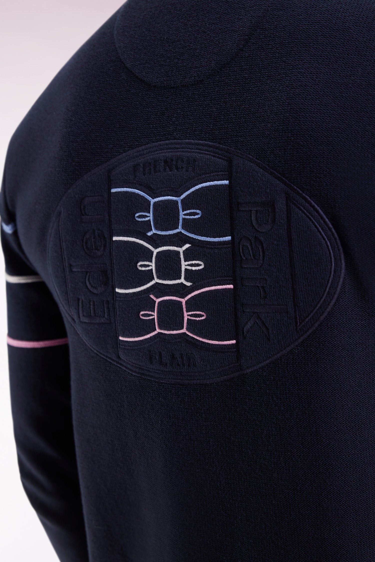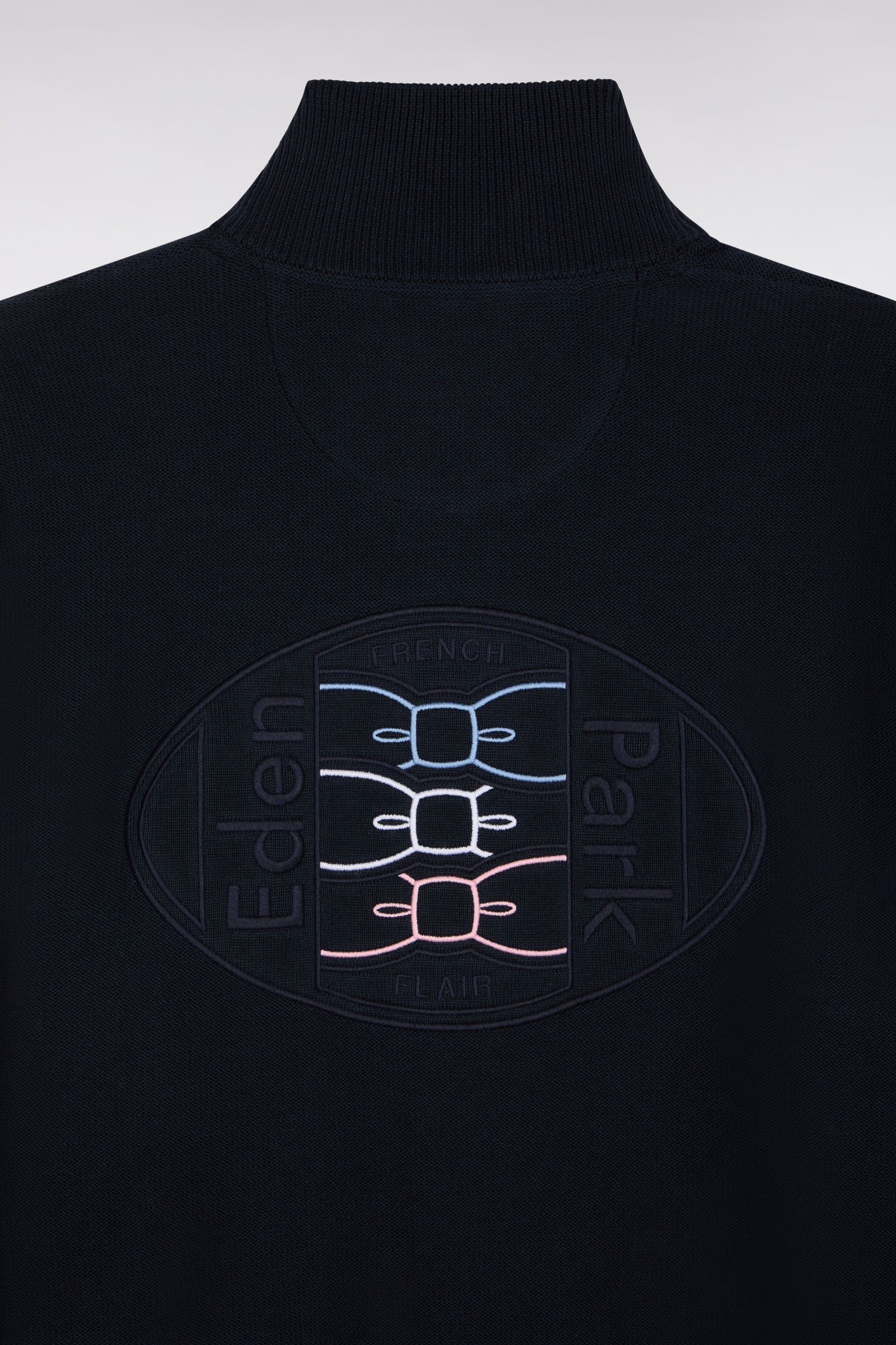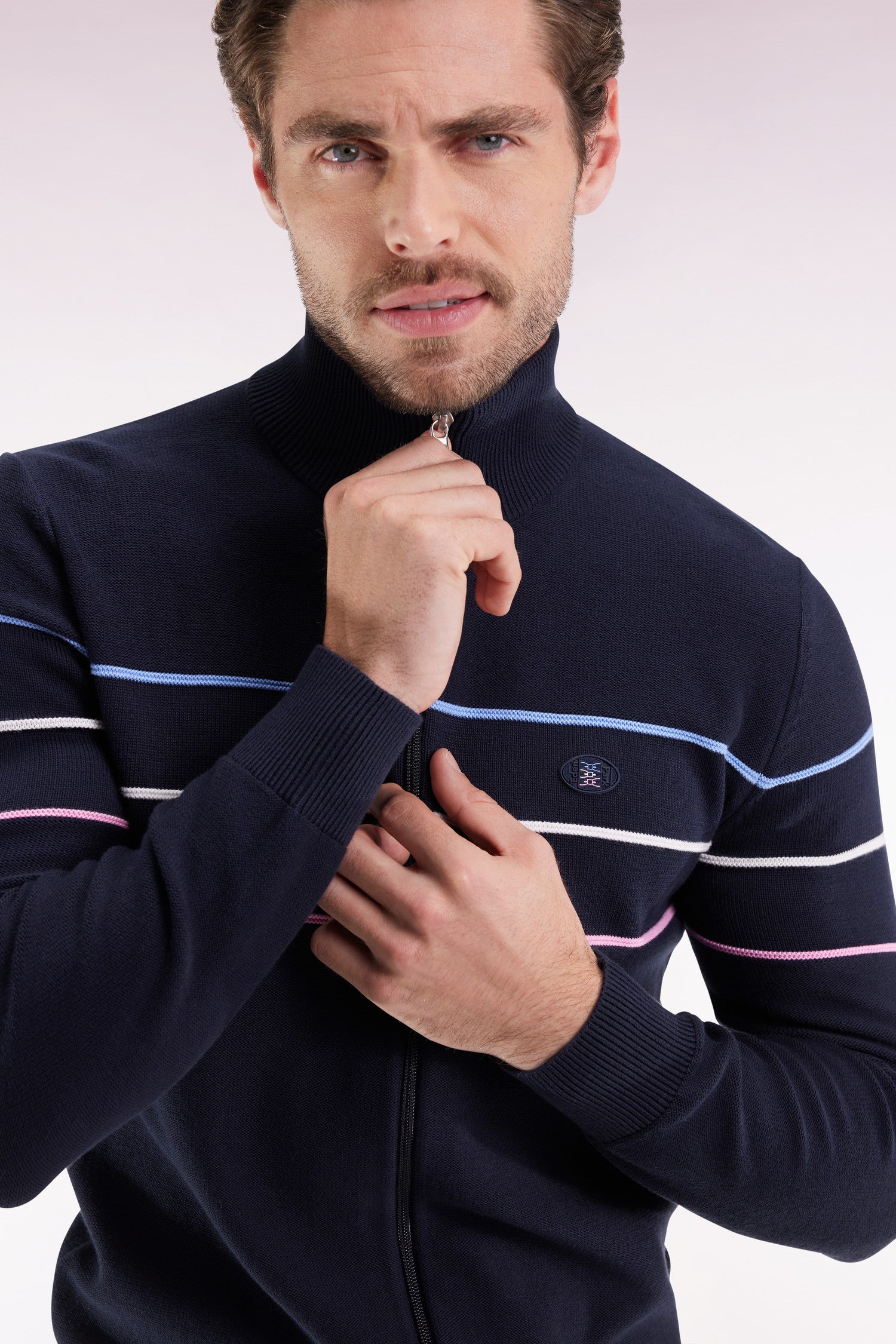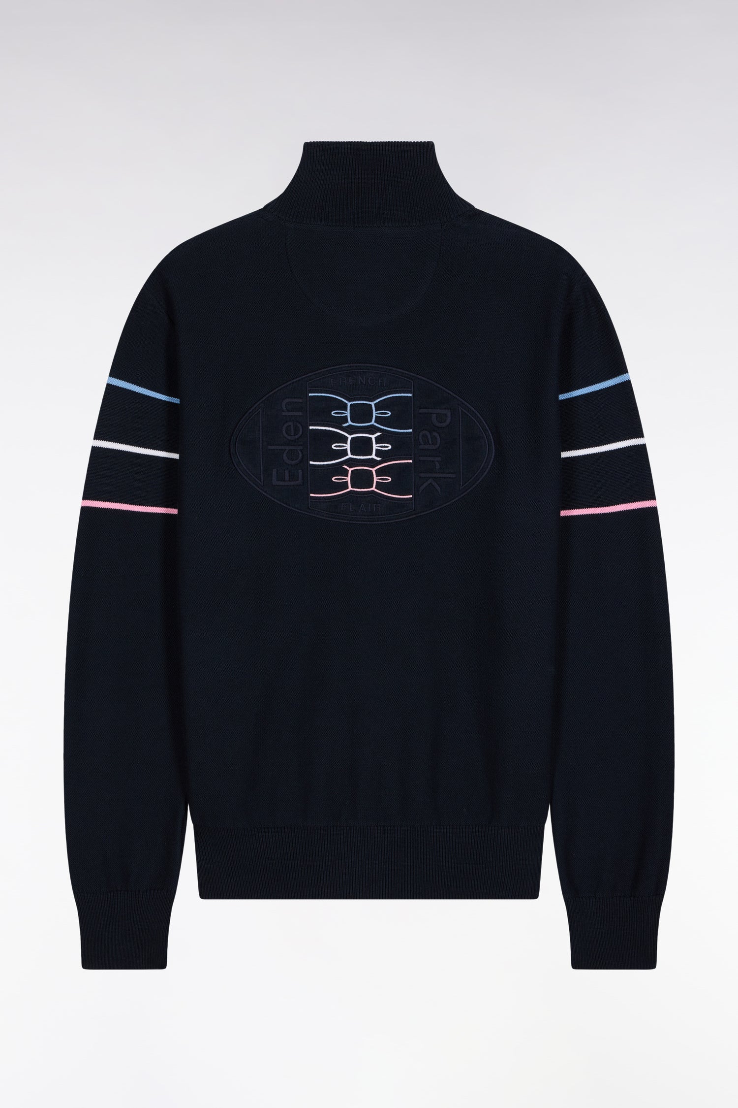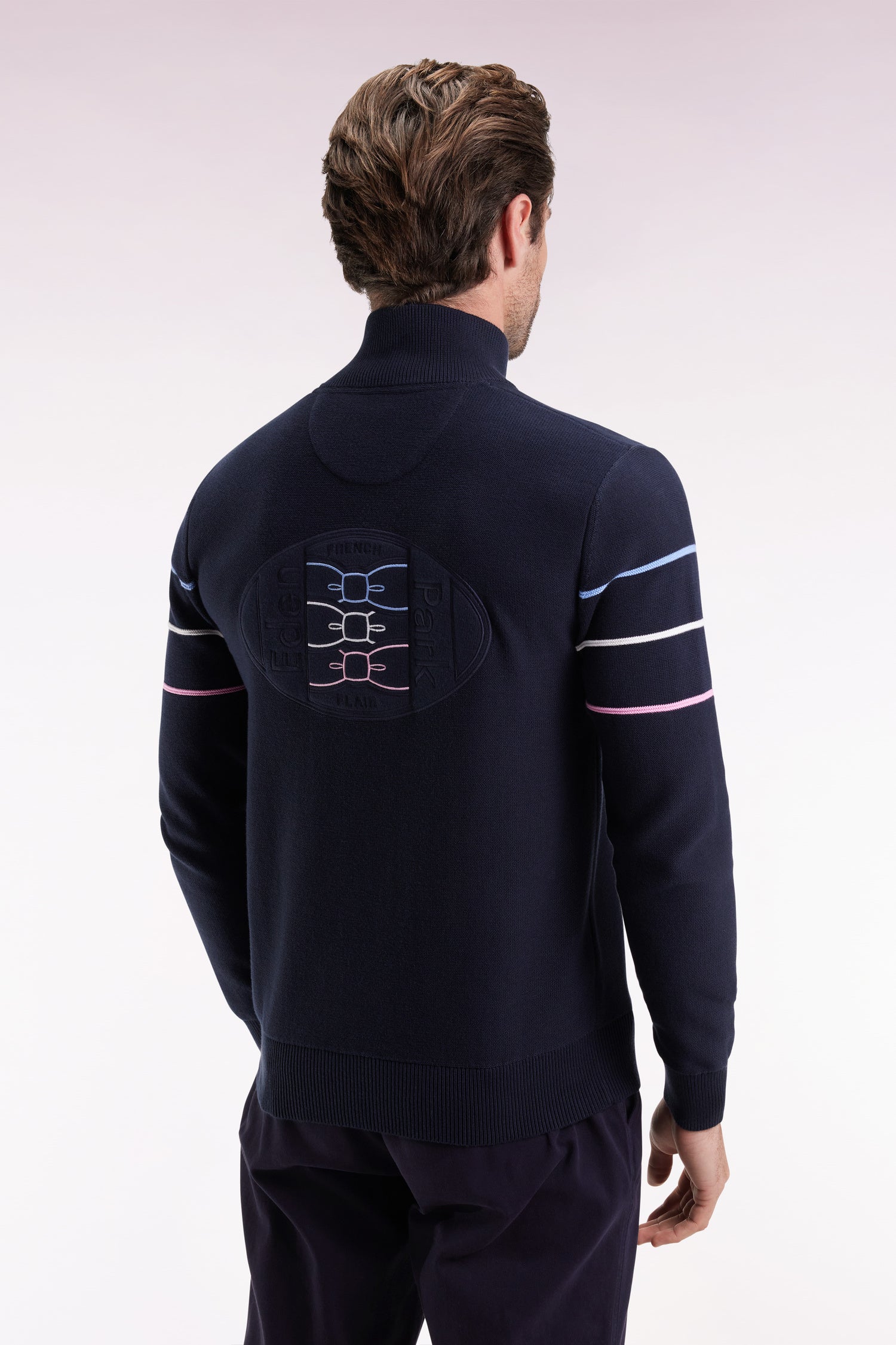 Ce cardigan à col montant zippé revisite les classiques du vestiaire sport-chic avec ses jeux de contrastes maîtrisés. Réalisé en point jersey envers, il se distingue par un liseré tricolore graphique qui se prolonge jusqu’aux manches. Une large broderie ovale dans le dos signe l’héritage rugby de notre maison, tandis qu’un badge en feutre et silicone sur la poitrine apporte à ce pull en coton une touche contemporaine. Une pièce de caractère à adopter dès l'arrivée de l'automne. Ce pull homme est proposé en coloris noir ou bleu marine