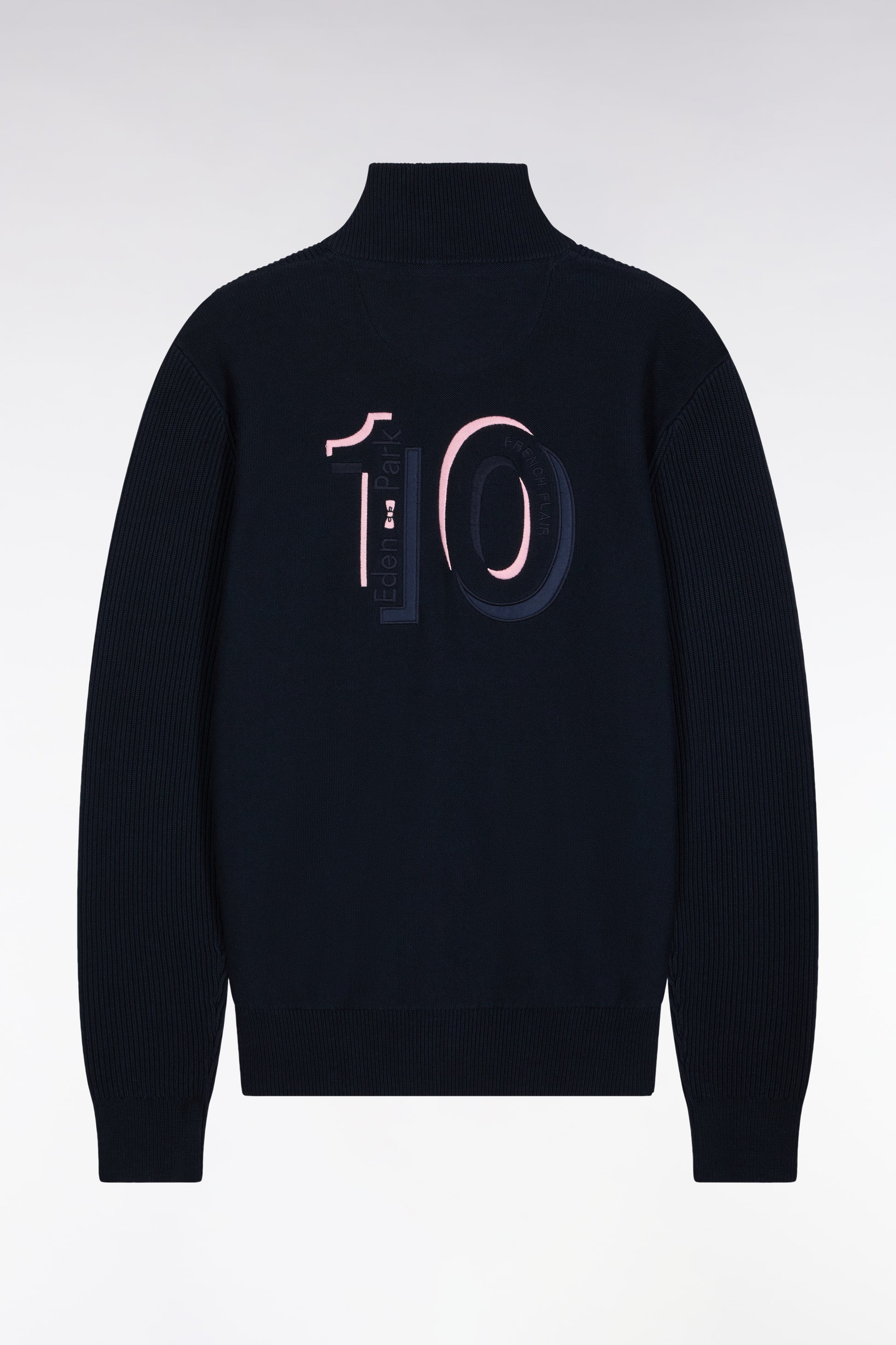 Ce cardigan zippé à col montant à l'intérieur contrasté, révélé porté ouvert, impose son style graphique avec son jeu de rayures horizontales contrastées sur la poitrine. Tricoté en coton, il mêle maille côtelée sur les manches et jersey sur le corps pour une allure structurée et confortable. Au dos, ce pull à col montant zippé présente une large broderie, hommage subtil au maillot de rugby de notre fondateur, Franck Mesnel. Une allure singulière, reconnaissable : la marque d’une élégance sport-chic à la française