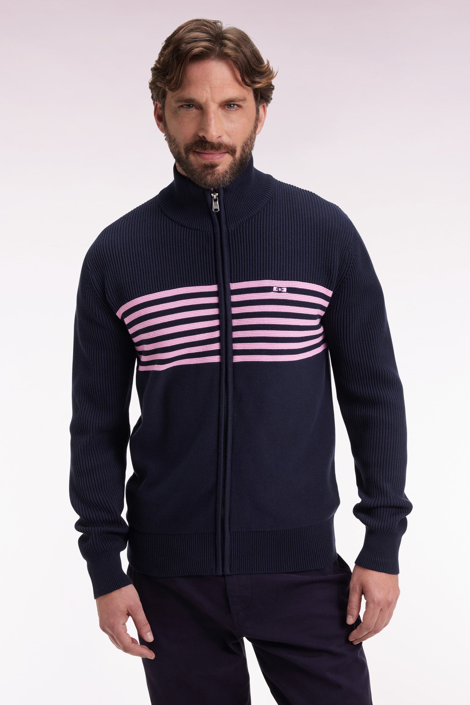 Cardigan zippé en coton marine à rayures roses coupe droite