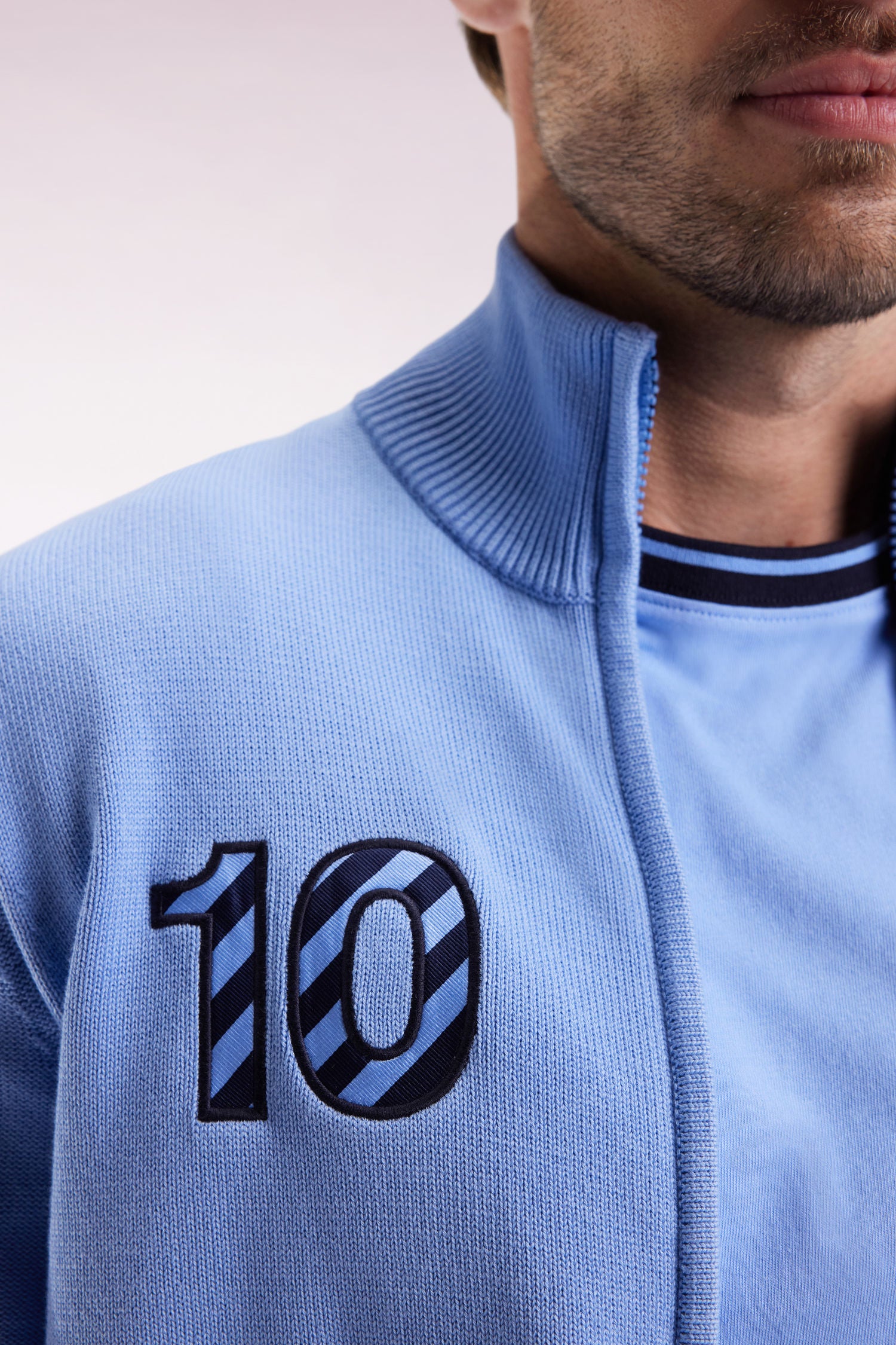 Ce cardigan zippé à col montant affirme son caractère sport-chic à travers ses jeux de textures entre point jersey et jersey envers. Ses bords-côtes manches et sa broderie 10 rehaussée d'une application de tissu cravate apporte une touche graphique discrète. Une pièce confortable et soignée, pensée pour rythmer les silhouettes du quotidien