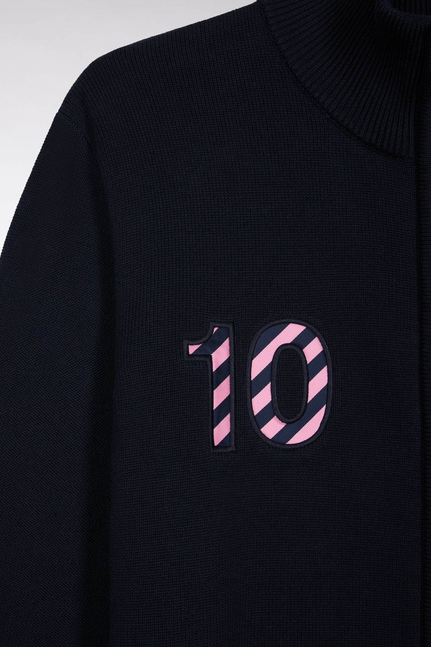 Ce cardigan zippé à col montant affirme son caractère sport-chic à travers ses jeux de textures entre point jersey et jersey envers. Ses bords-côtes manches et sa broderie 10 rehaussée d'une application de tissu cravate apporte une touche graphique discrète. Une pièce confortable et soignée, pensée pour rythmer les silhouettes du quotidien