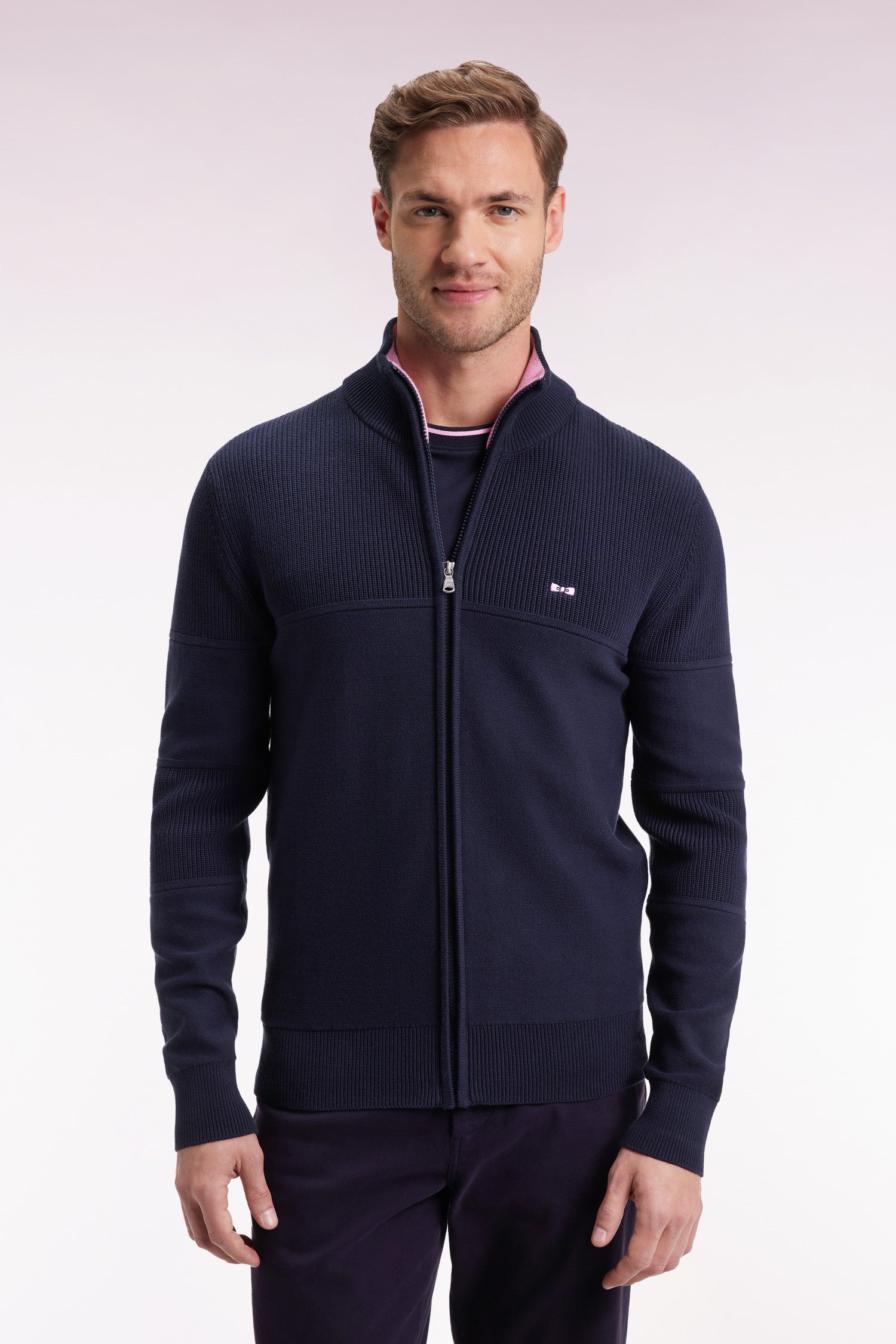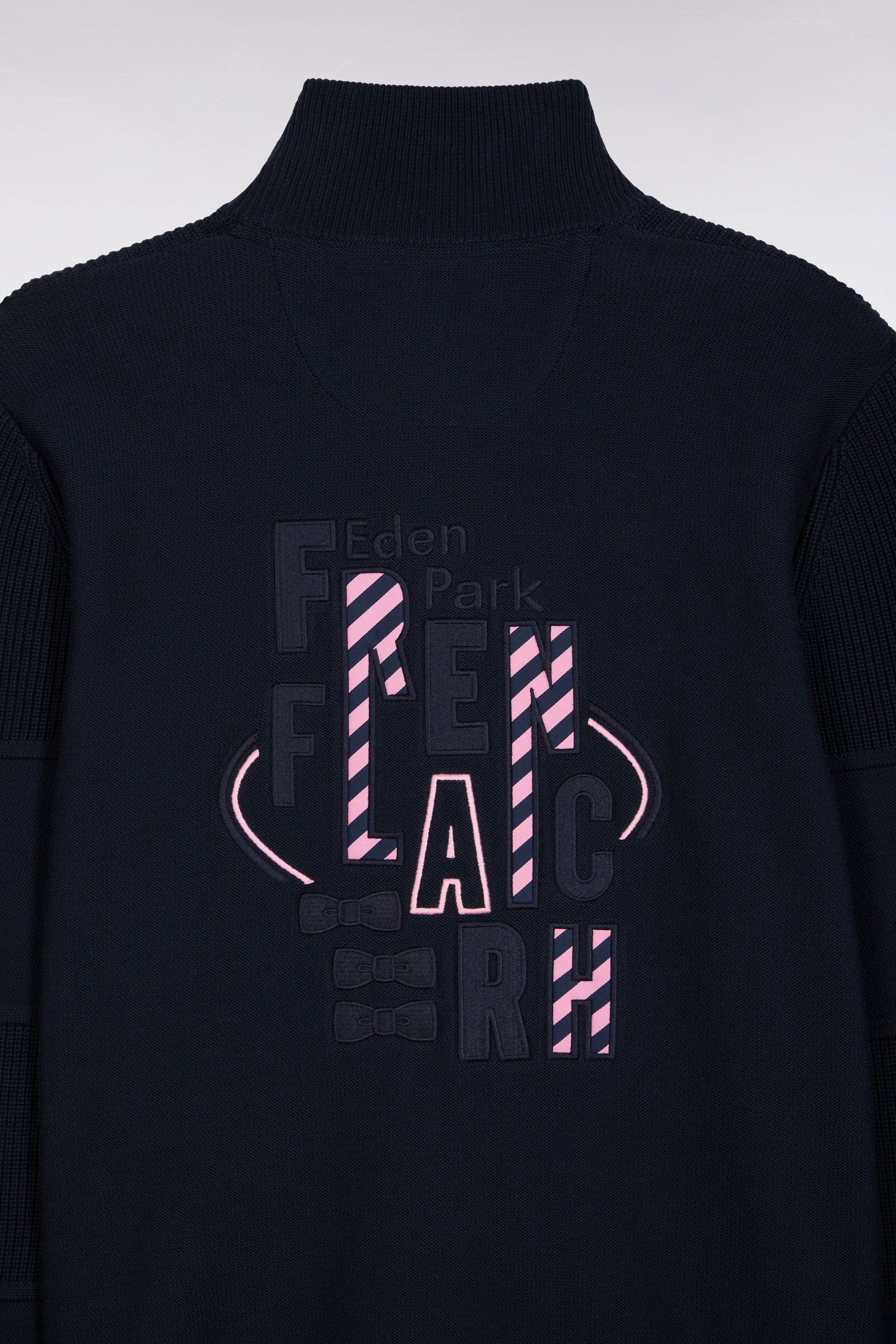 Ce cardigan à zip droit en pur coton tricoté dans un mélange de jersey et côtes anglaise incarne l’esprit sport-chic si propre à Eden Park. Au dos, sa large broderie French Flair est rehaussée d'un tissu cravate rayé : un détail typique du vestiaire de notre maison de mode