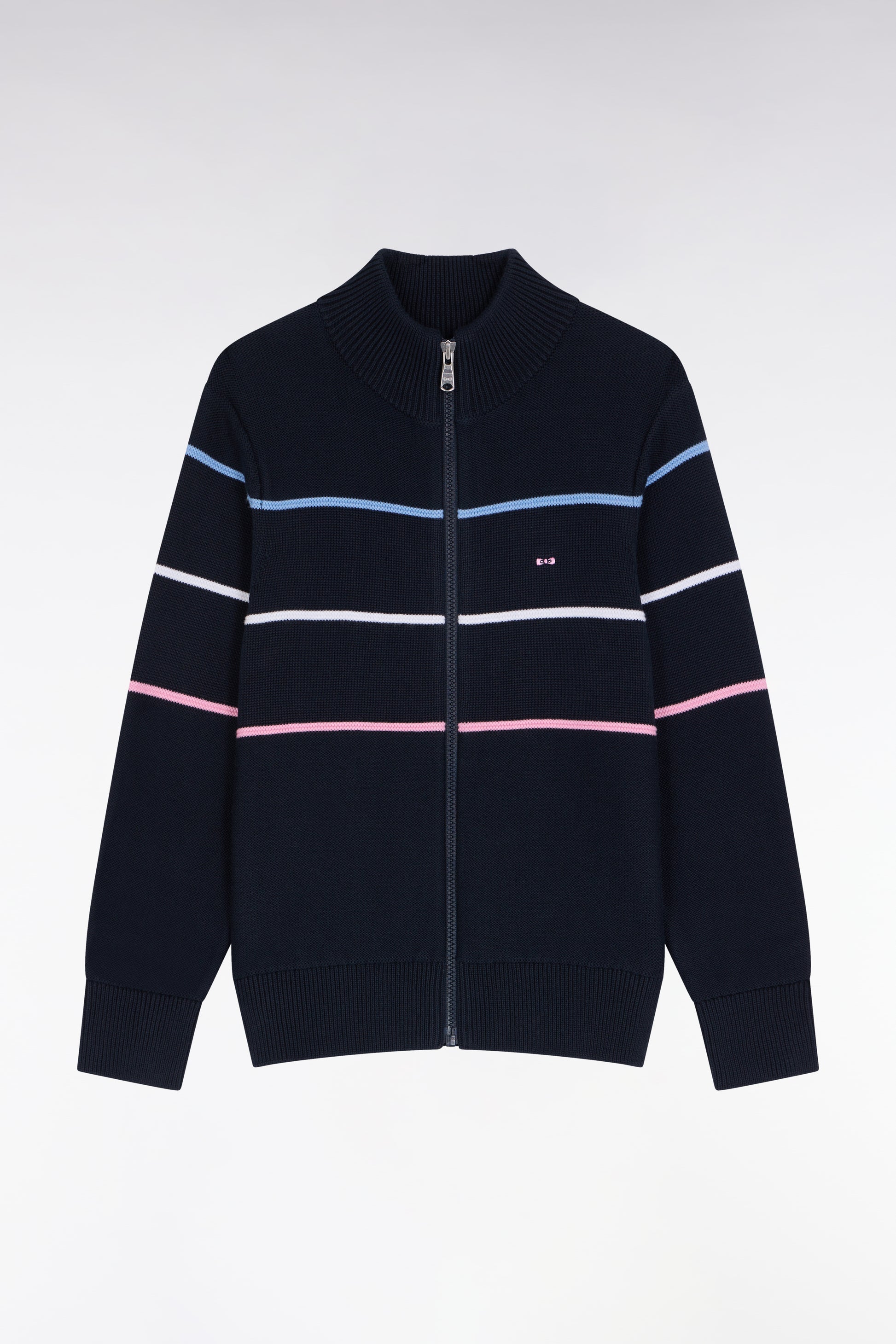 Notre cardigan zippé marine joue sur les contrastes avec ses jeux de points raffinés et ses finitions tricolores. Doté d’un col montant, il se distingue par sa broderie poitrine nœud papillon et sa large broderie dans le dos, rassemblant trois nœuds emblématiques d’Eden Park dans nos coloris signature. Pensée pour accompagner les enfants avec style porté en sweatshirt ou en veste à la mi-saison