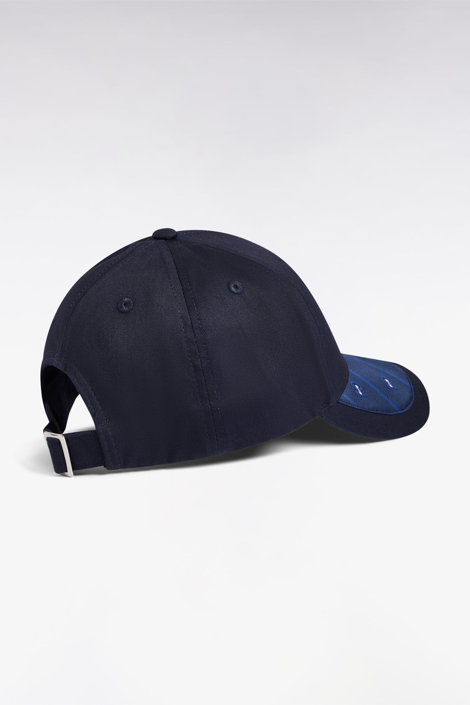 Réalisée en piqué coton marine cette casquette homme ajustable se distingue par sa broderie emblème rose et sa visière habillée par un motif nœud papillon et de fines rayures diagonales. Son ajustement facile et son design sobre en font une pièce sport-chic par essence