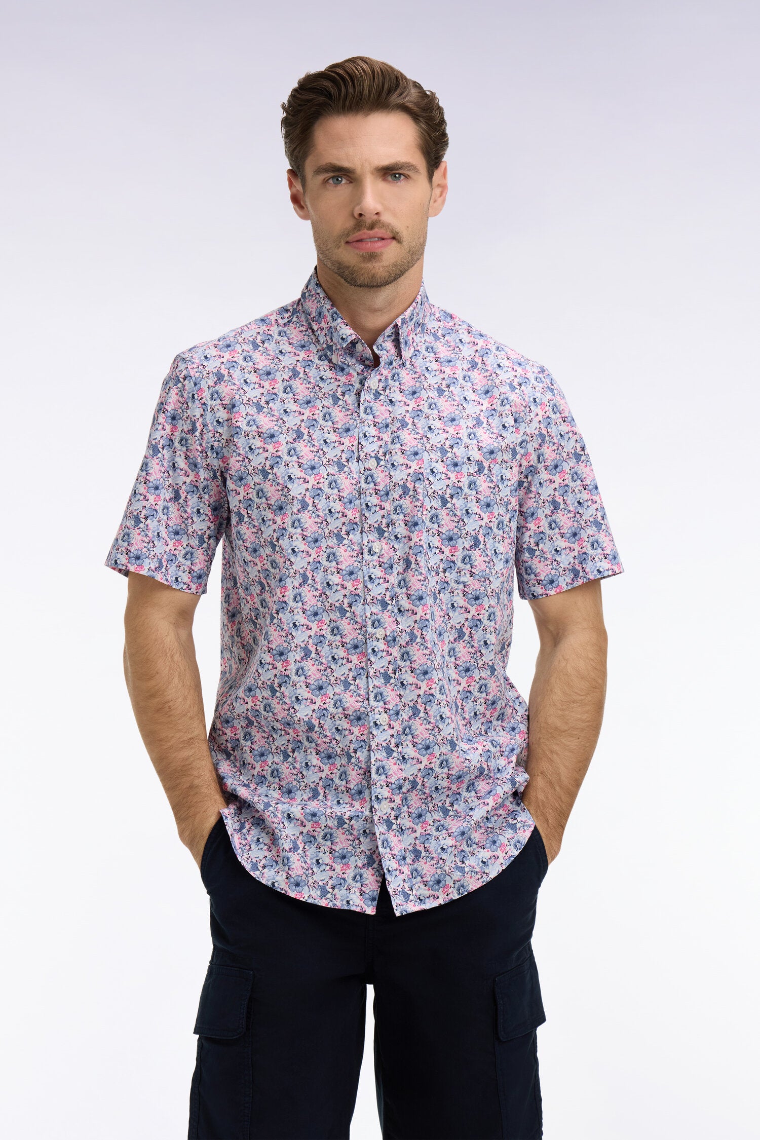 Chemise à manches courtes en coton à motif floral rose et bleu
