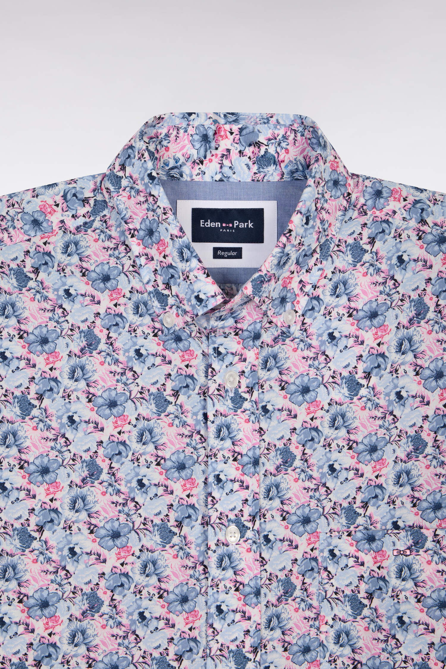 Cette chemise manches courtes, proposée sur fond blanc est ornée d’un imprimé fleurs aux nuances ciel et rose, nos coloris signature. Avec sa poche poitrine brodée et son col à pointes boutonnées, cette chemisette allie originalité et élégance décontractée pour un style estival affirmé en toutes occasions.
