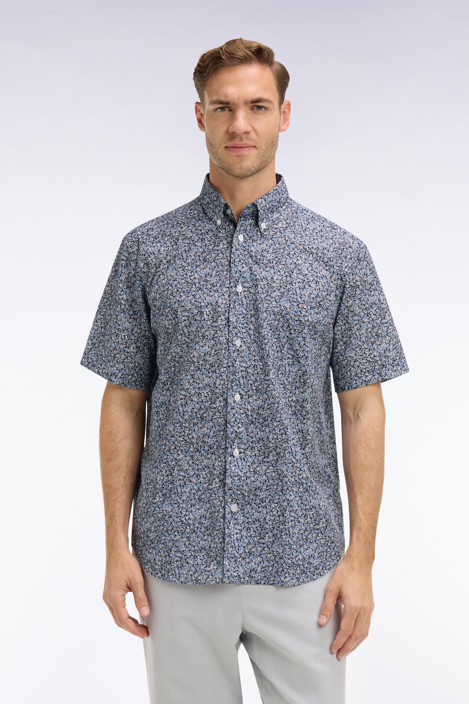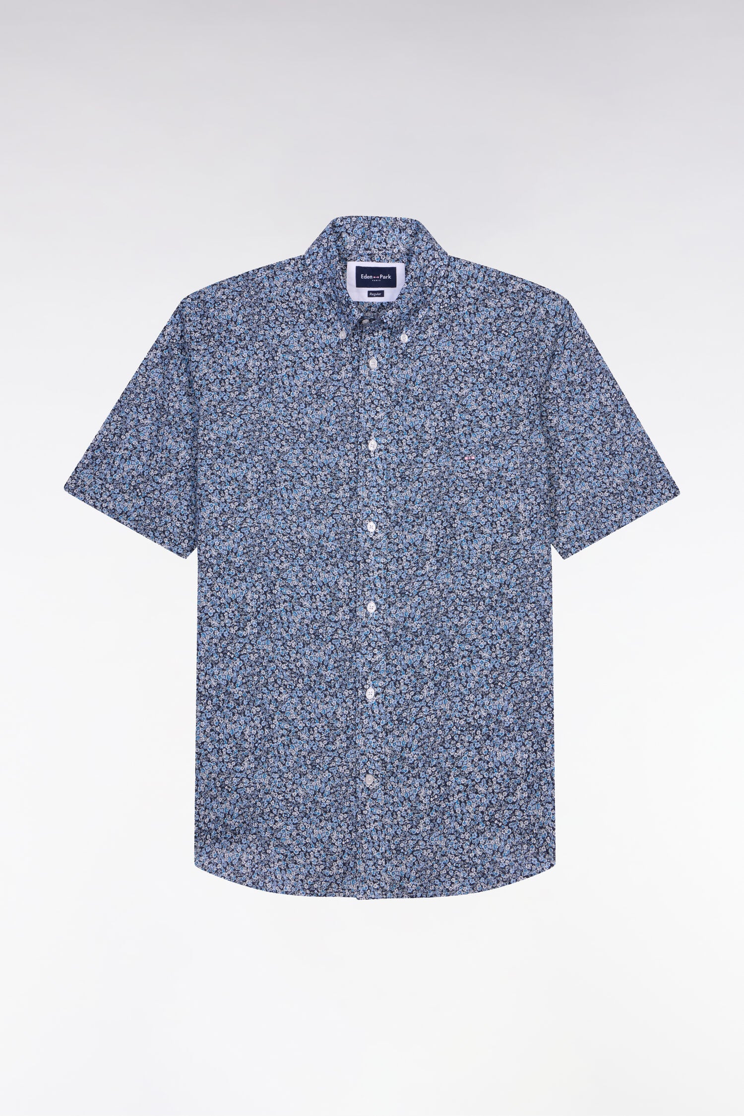Chemise à manches courtes en coton bleu à micromotif floral