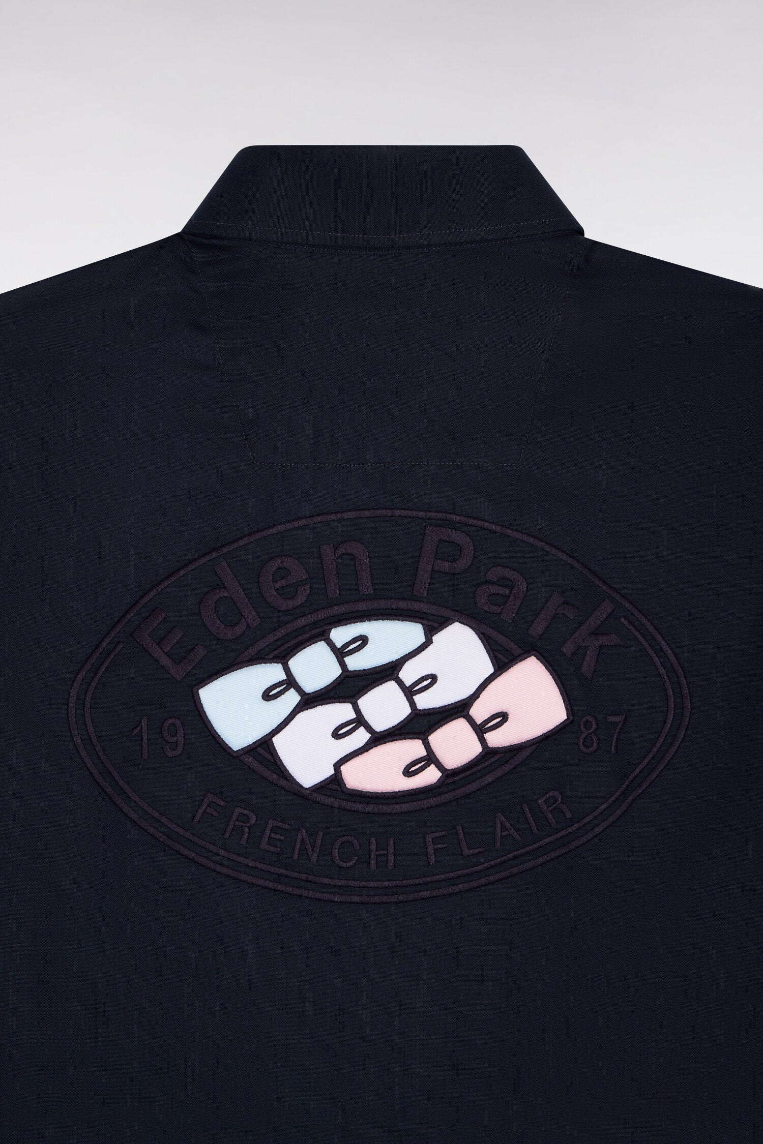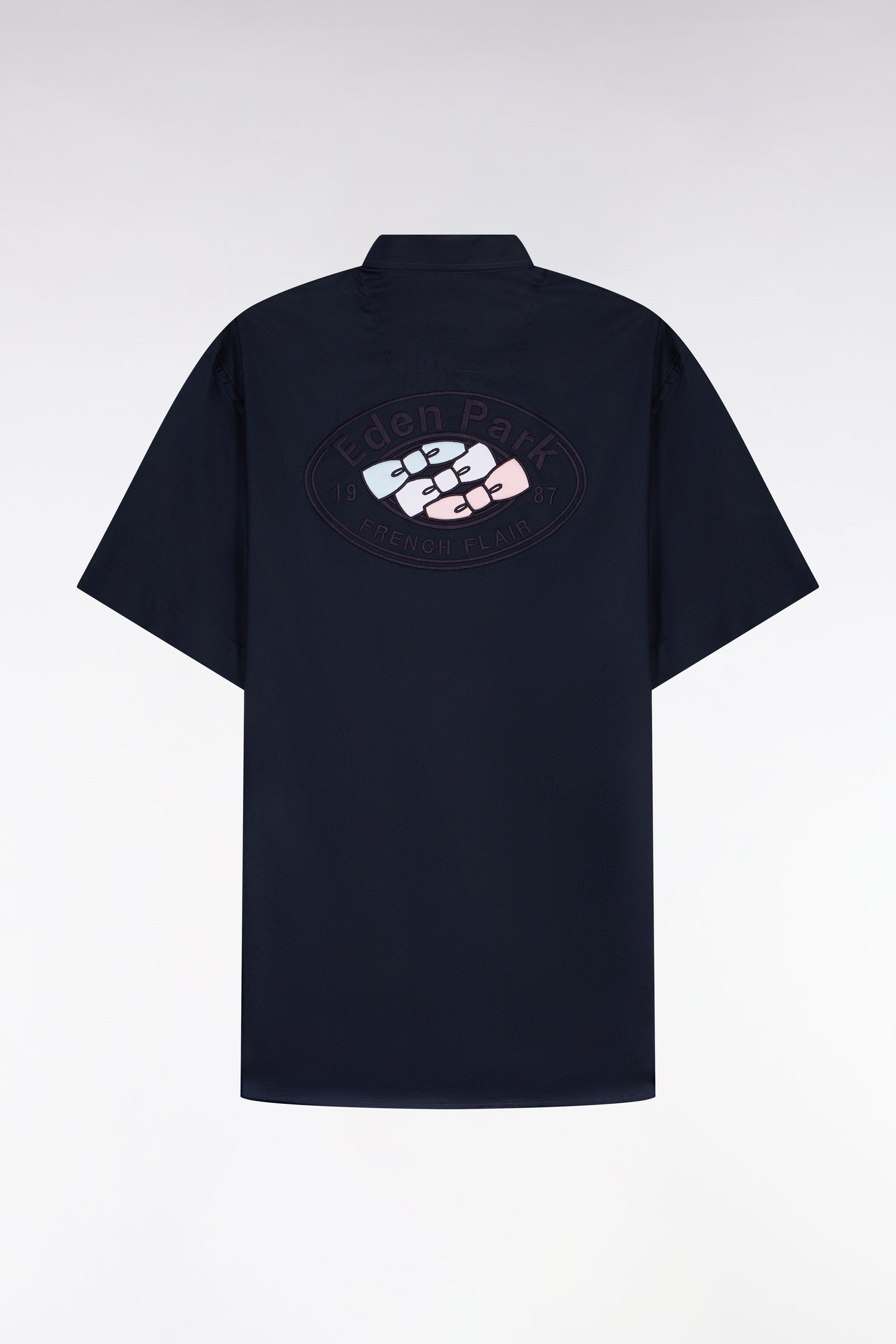 Cette chemise à manches courtes en coton marine adopte une coupe slim qui structure la silhouette tout en étant agréable à porter. Dans le dos, une broderie graphique inspirée du rugby revisite l’héritage French Flair de notre Maison avec modernité. Les lignes dynamiques de sa broderie tricolore se mêlent aux codes identitaires de la Maison : rigueur, précision et élégance sportive. La broderie poitrine discrète, les finitions soignées et le col à pointes boutonnées complètent le design de cette pièce estivale forte et intemporelle, parfaite pour une allure contemporaine enracinée dans l’ADN Eden Park.