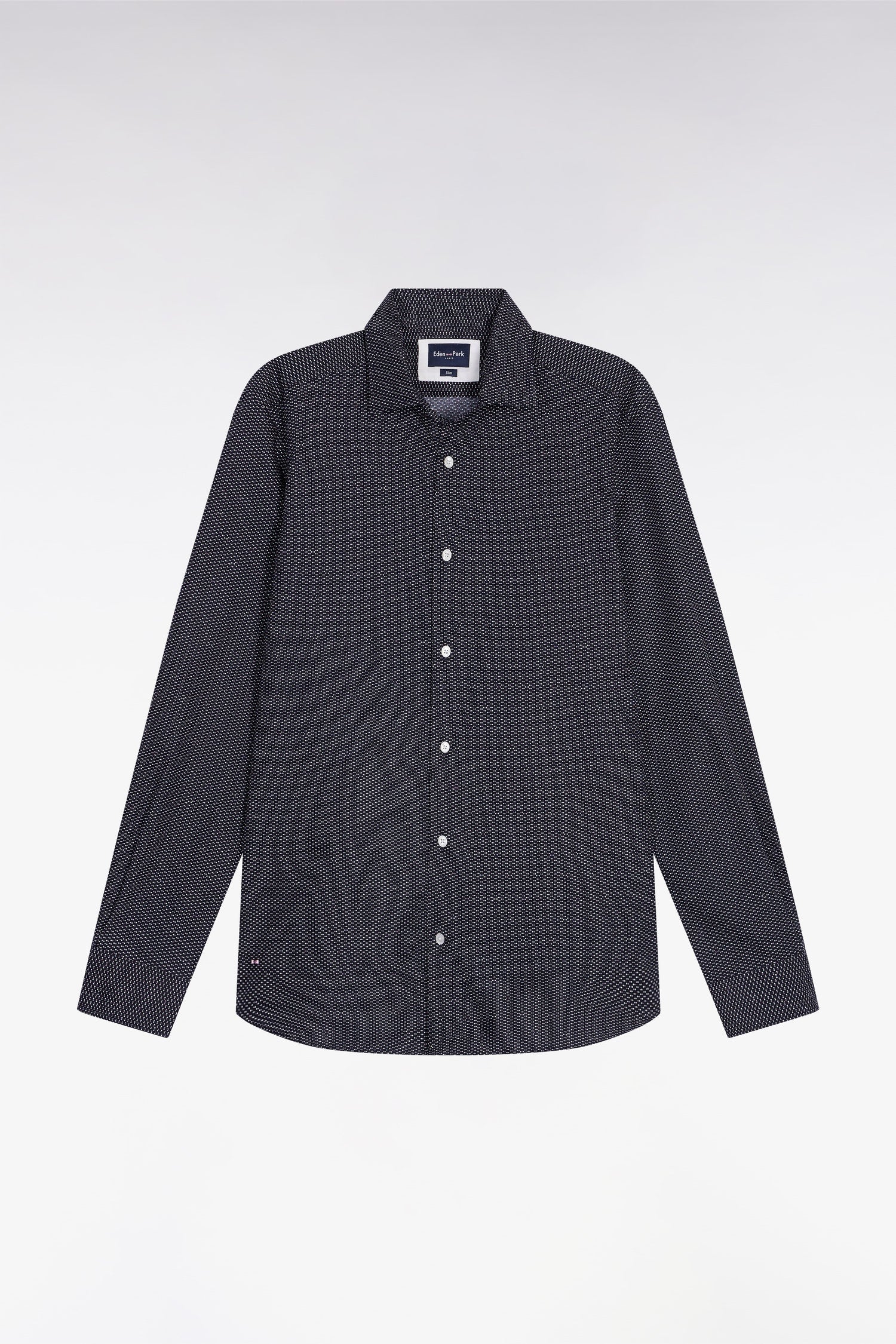 Avec son imprimé micro-pois discret rose ou bleu sur un fond marine, cette chemise à la coupe slim seyante affiche une allure moderne tout en respectant les codes de l’élégance Eden Park. Réalisée dans une popeline de coton douce et respirante, elle se distingue par l’absence de poche poitrine et par la broderie nœud papillon en bas de pièce, clin d’œil minimaliste à l’univers French Flair de la maison