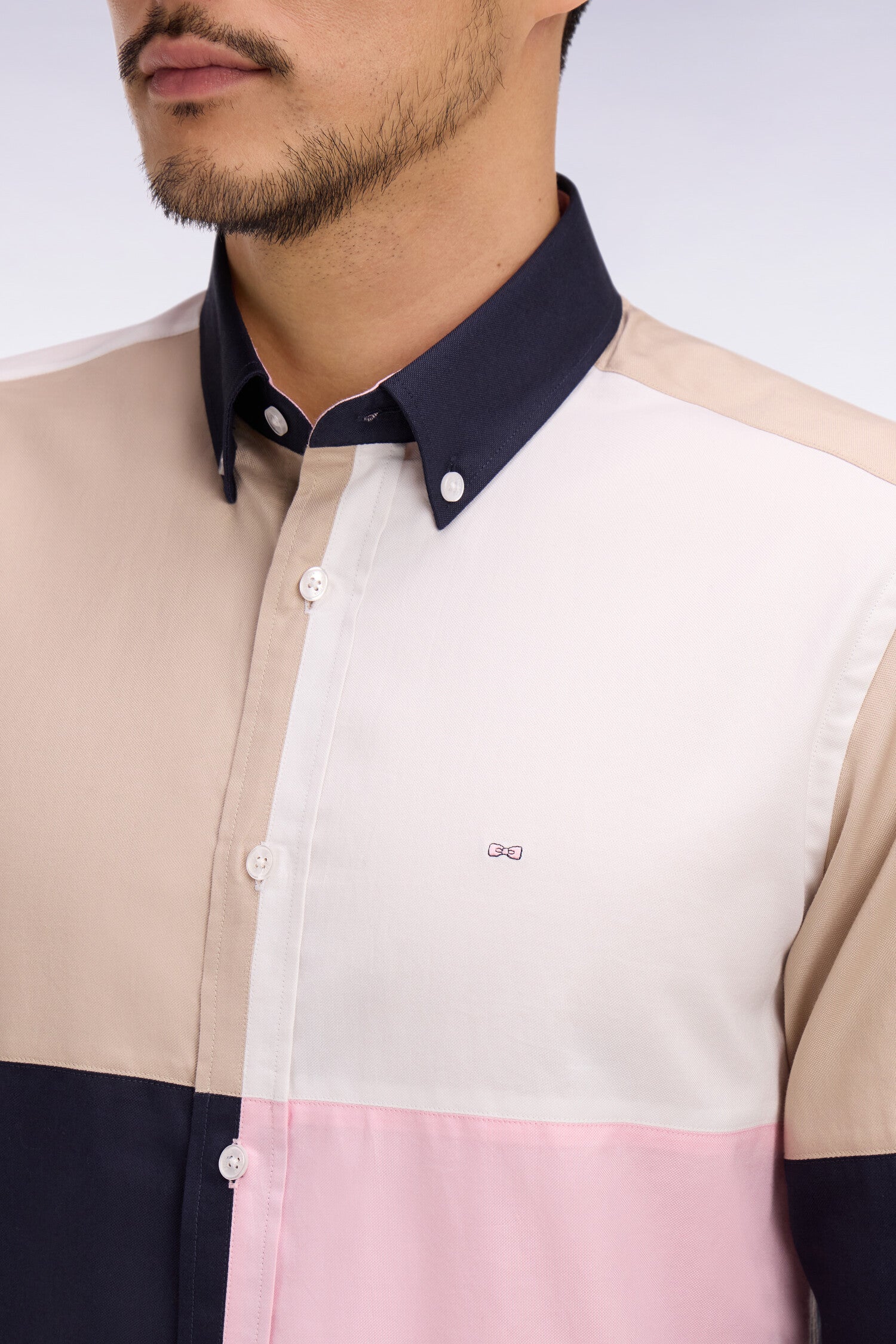 Cette chemise en coton Tolosa, un tissu haut de gamme tissé à partir de fils préalablement teints pour un toucher doux, une belle tenue, et une couleur durable, se distingue par son effet coupé-cousu, une construction en cadran inspirée des maillots de rugby apportant un relief subtil à la silhouette. Sa texture douce et sa coupe regular offrent un confort naturel, idéal pour la belle saison. Le col à pointes boutonnées et le nœud papillon brodé sur la poitrine témoignent de notre soin marqué pour les finitions. Portée seule ou sur un T-shirt blanc, elle compose une allure sport chic authentique, fidèle à l’esprit de notre Maison de mode française.