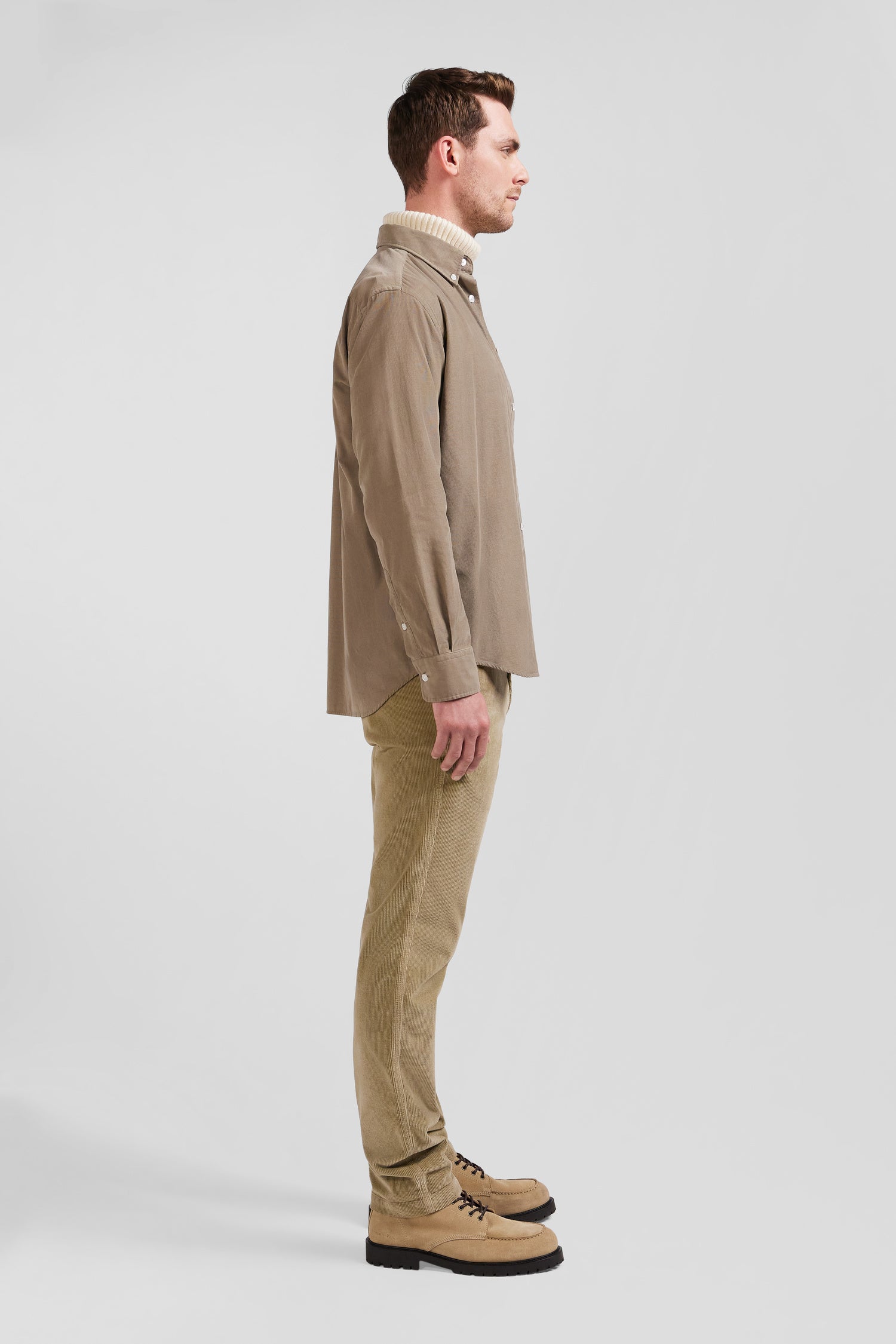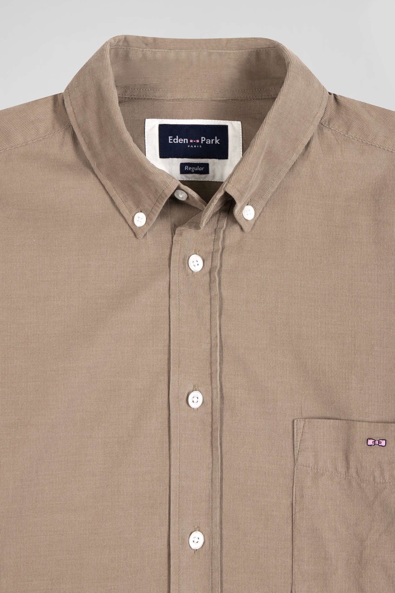 Chemise en velours côtelé uni beige col boutonné et poche poitrine coupe Regular