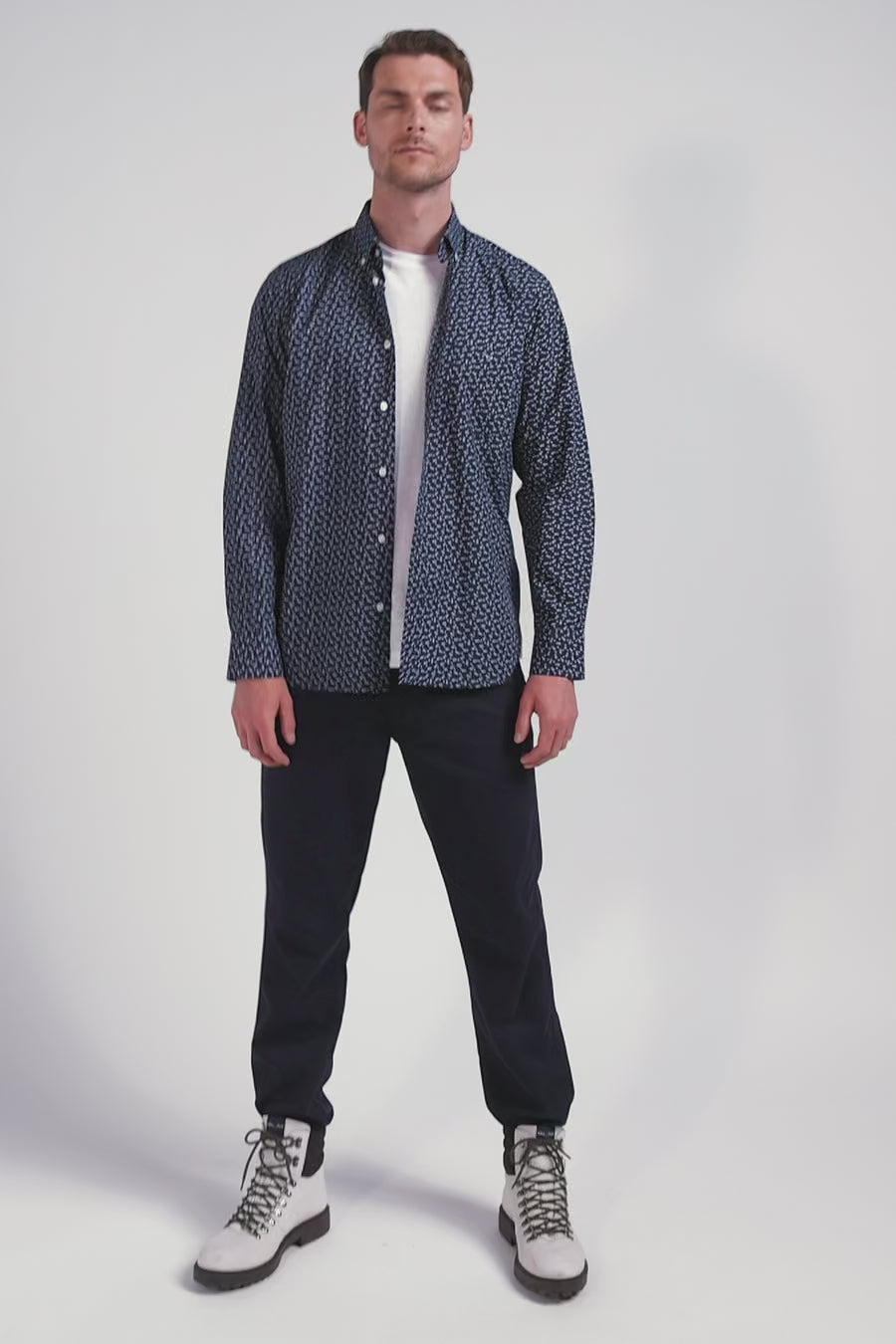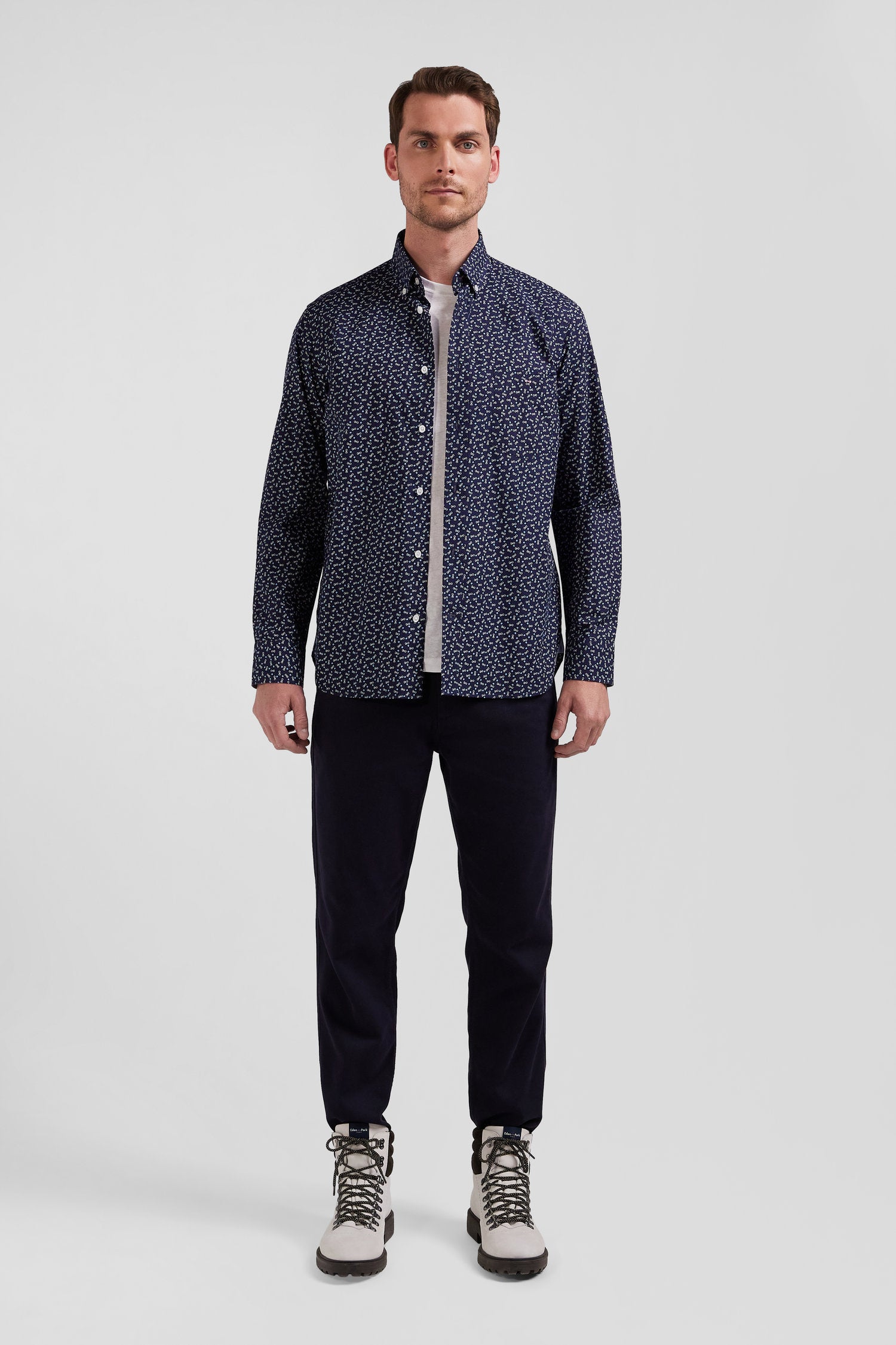 Pour une silhouette travaillée, nous vous proposons cette chemise en popeline de coton écrue ou marine, ornée d'un microimprimé nœud papillon intégrant subtilement l'emblème de notre Maison. Sa coupe Regular droite assure un ajustement confortable, tandis que la poche poitrine et le col boutonné ajoutent une touche de sophistication raffinée à cette chemise imprimée.