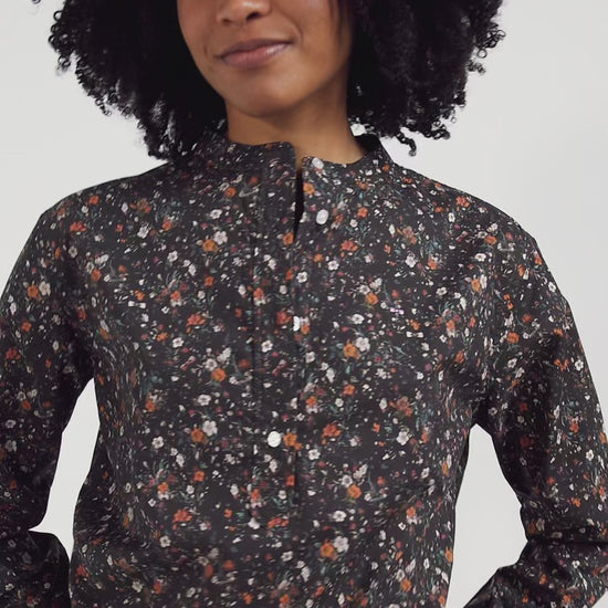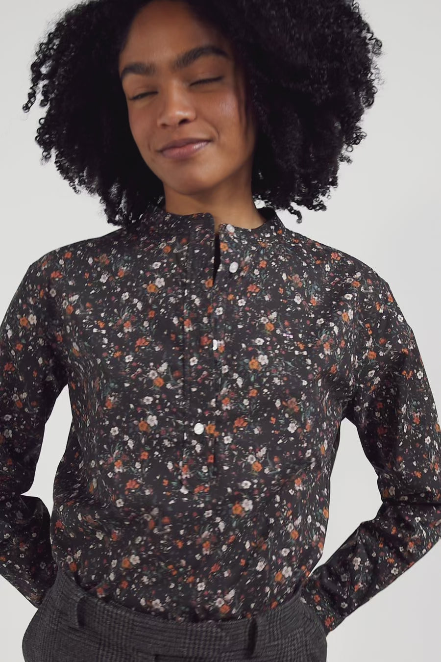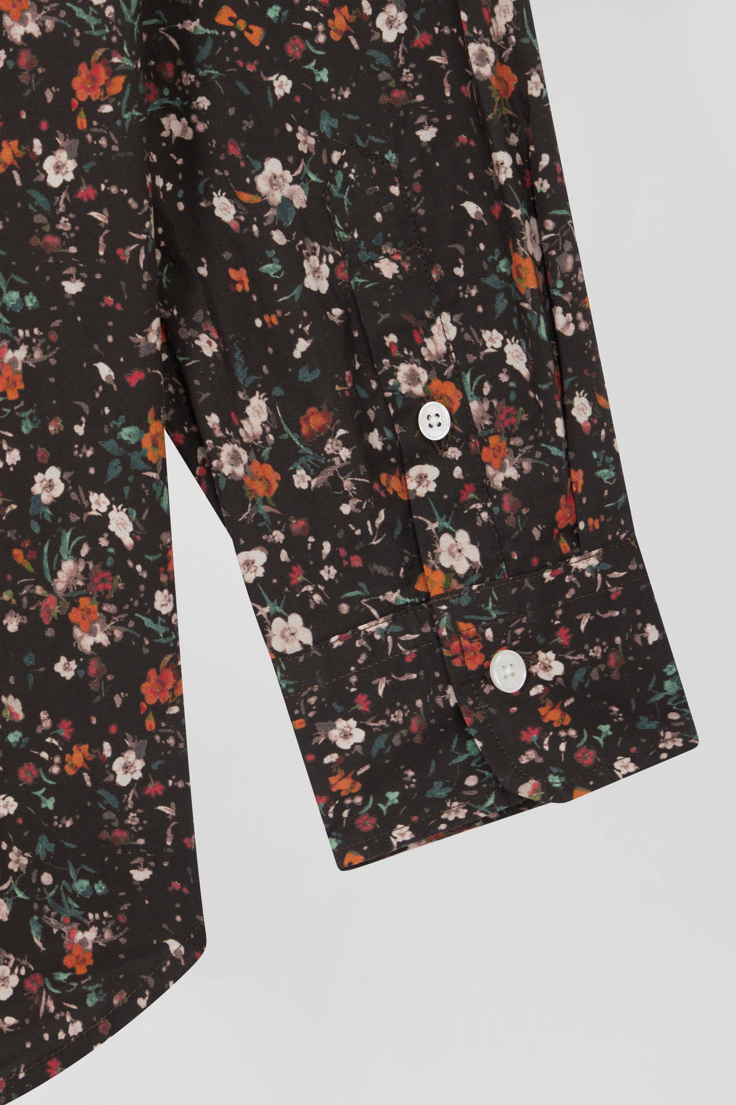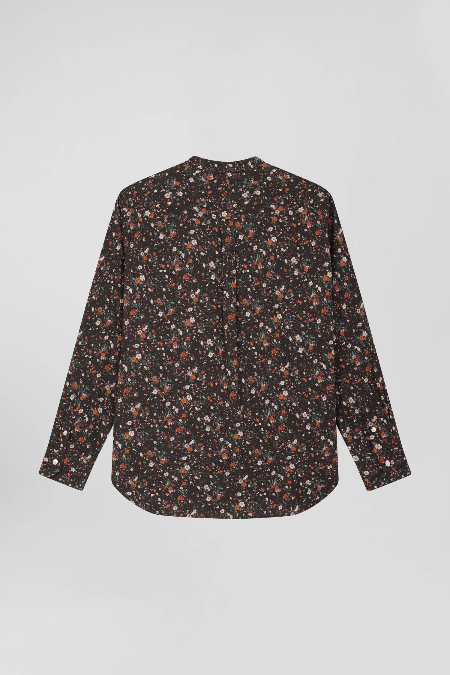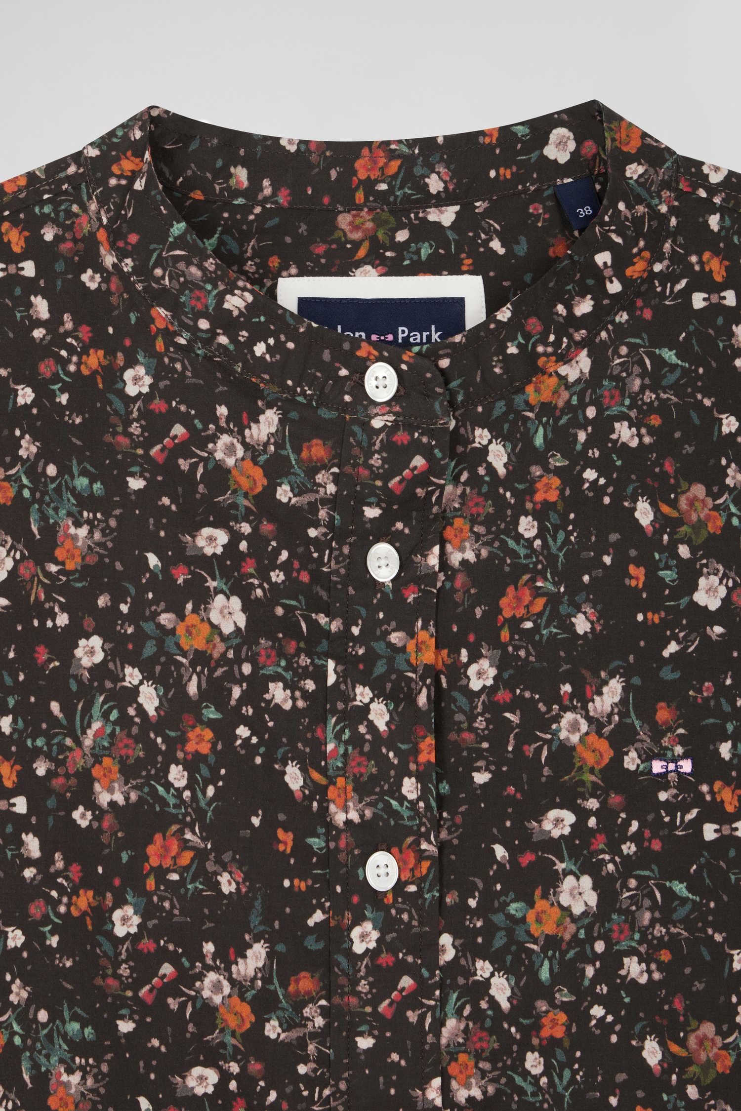 Chemise sans col en popeline de coton noir microimprimé floral coupe Regular