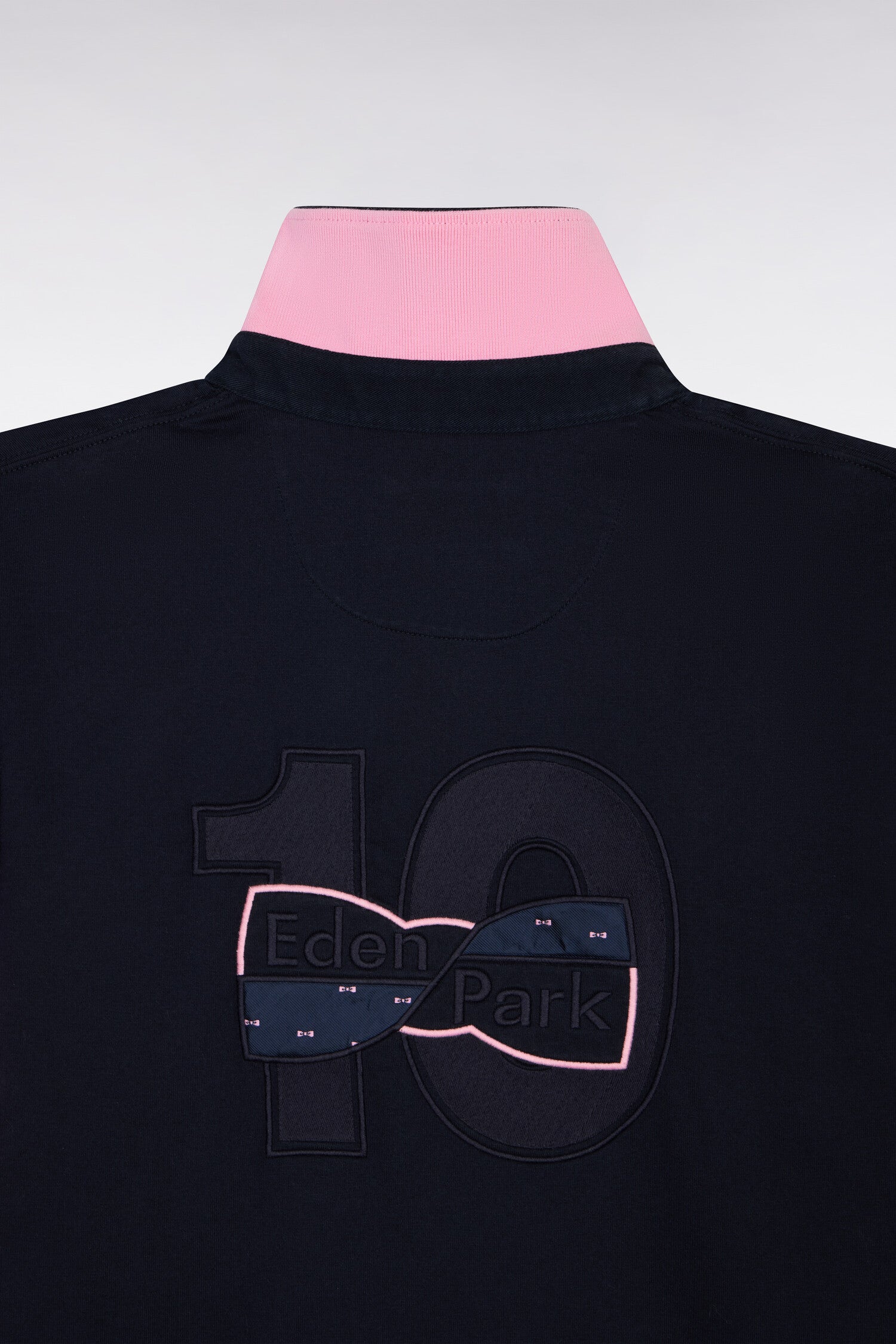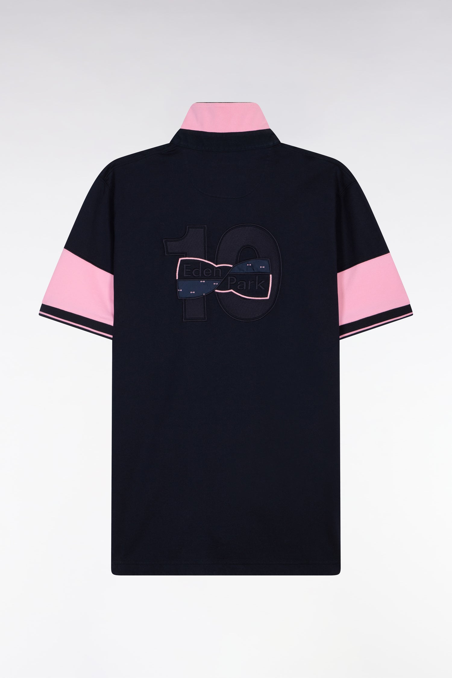 Indissociable de nos collections de mode, le maillot inspiré des codes du rugby est proposé pour la saison dans un jersey de coton doux marine et blanc aux accents roses. Allié d'un style masculin subtilement décontracté, il se distingue par son col maillot à dessous de col rose, un détail perceptible porté le col relevé et par ses manches bicolores s'achevant sur une bordure tricotés subtilement rayée. Au dos, ce maillot arbore la broderie 10 typique de nos collections, rehaussée d'un tissu cravate exclusif à Eden Park.