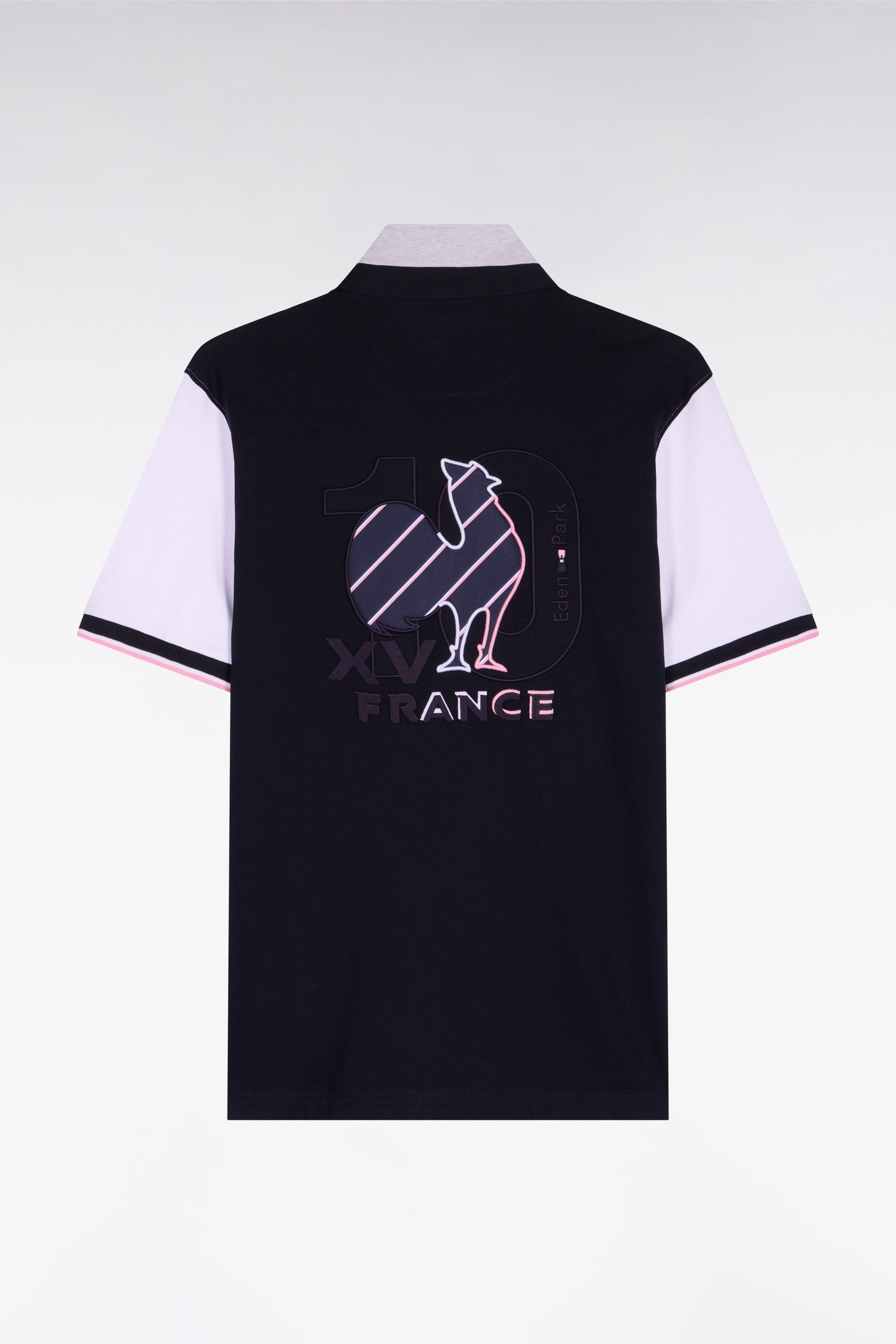 Ce maillot bicolore revisite l’héritage du XV de France avec un graphisme audacieux dans le dos, mêlant jeu de typographies, silhouette du coq et tissu cravate à bandes tricolores. Le contraste des manches blanches dynamise la silhouette, tandis que les finitions : col maillot structuré, boutons ovales rugby et bords-côtes rayés affirment l’ADN sport chic de notre Maison de mode française. Une pièce iconique pour une allure résolument rugby !