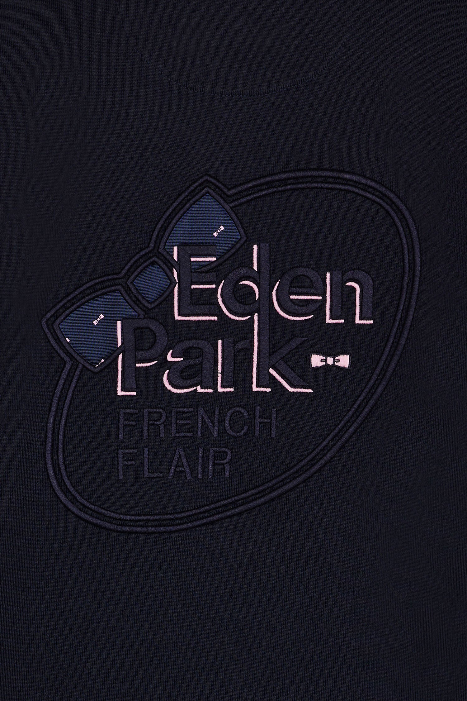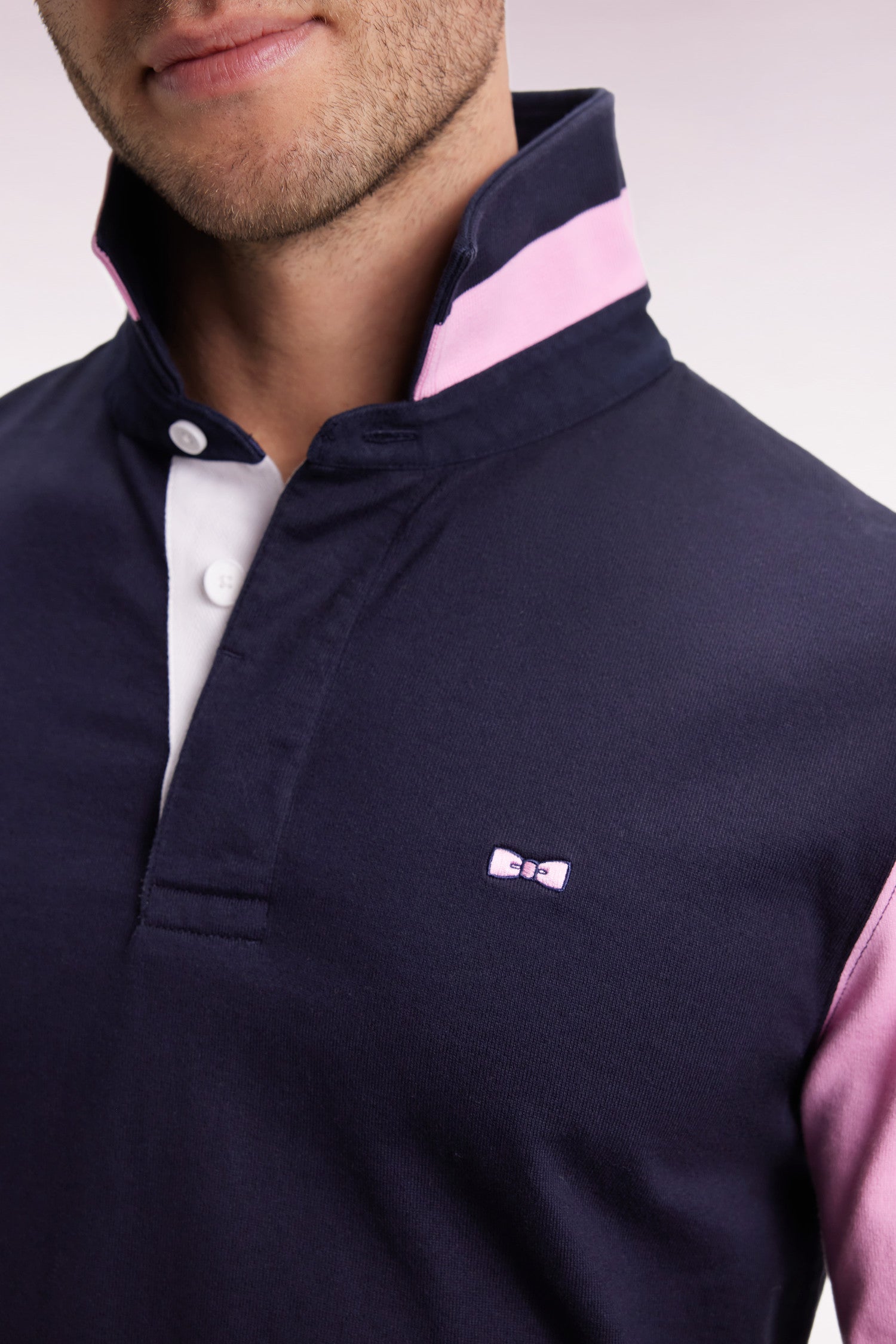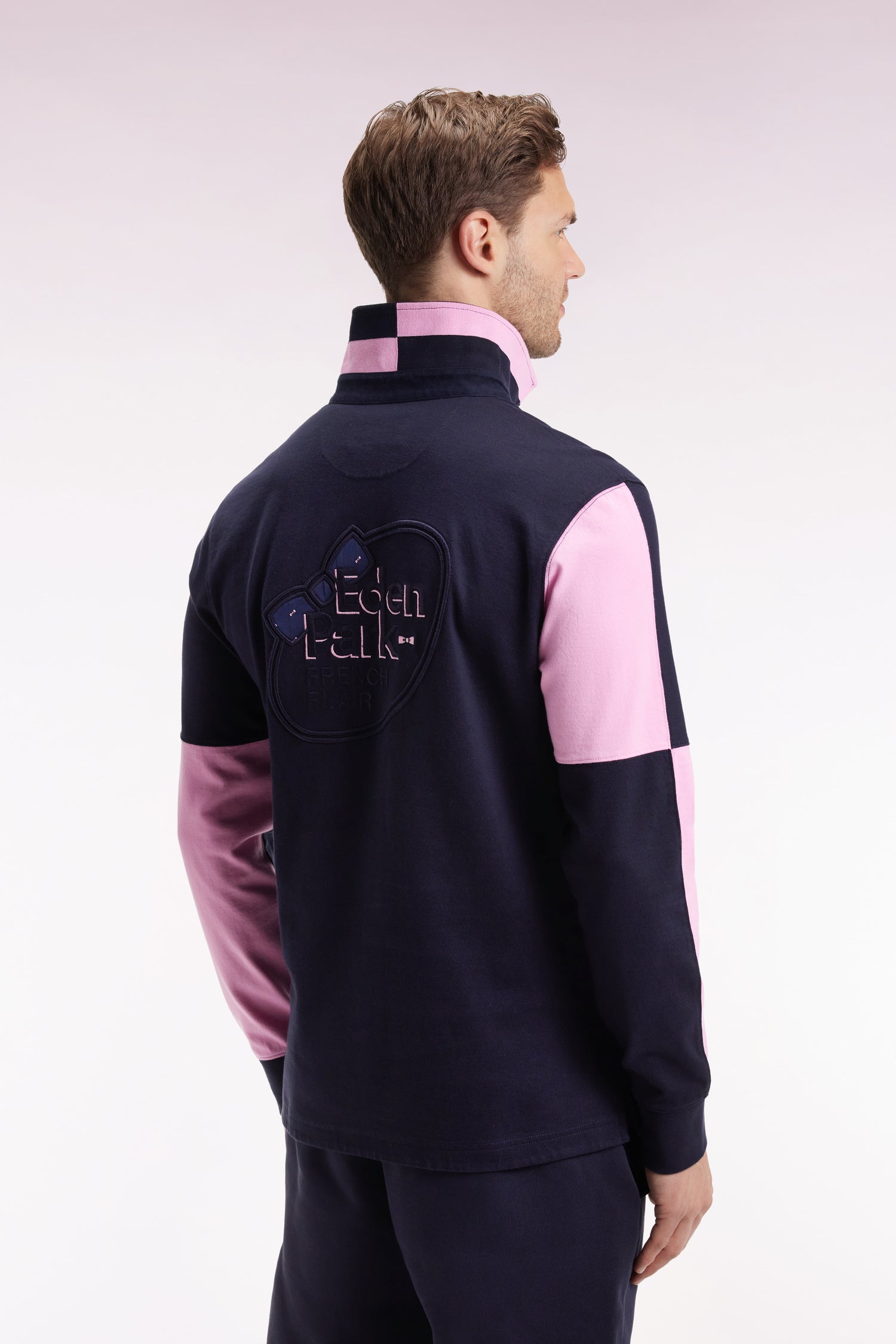 Inspiré des codes du rugby et du style propre à Eden Park, ce maillot manches longues en jersey épais joue la carte du contraste avec ses découpes colorées emblématiques sur les manches comme au col. Au dos, une broderie exclusive, avec incrustations de tissu cravate à micro-nœuds papillon, affirme le caractère de ce maillot sport-chic. Le col structuré mêle twill et tricot animé de colorblock, un contraste renforcé par une bande de propreté assortie