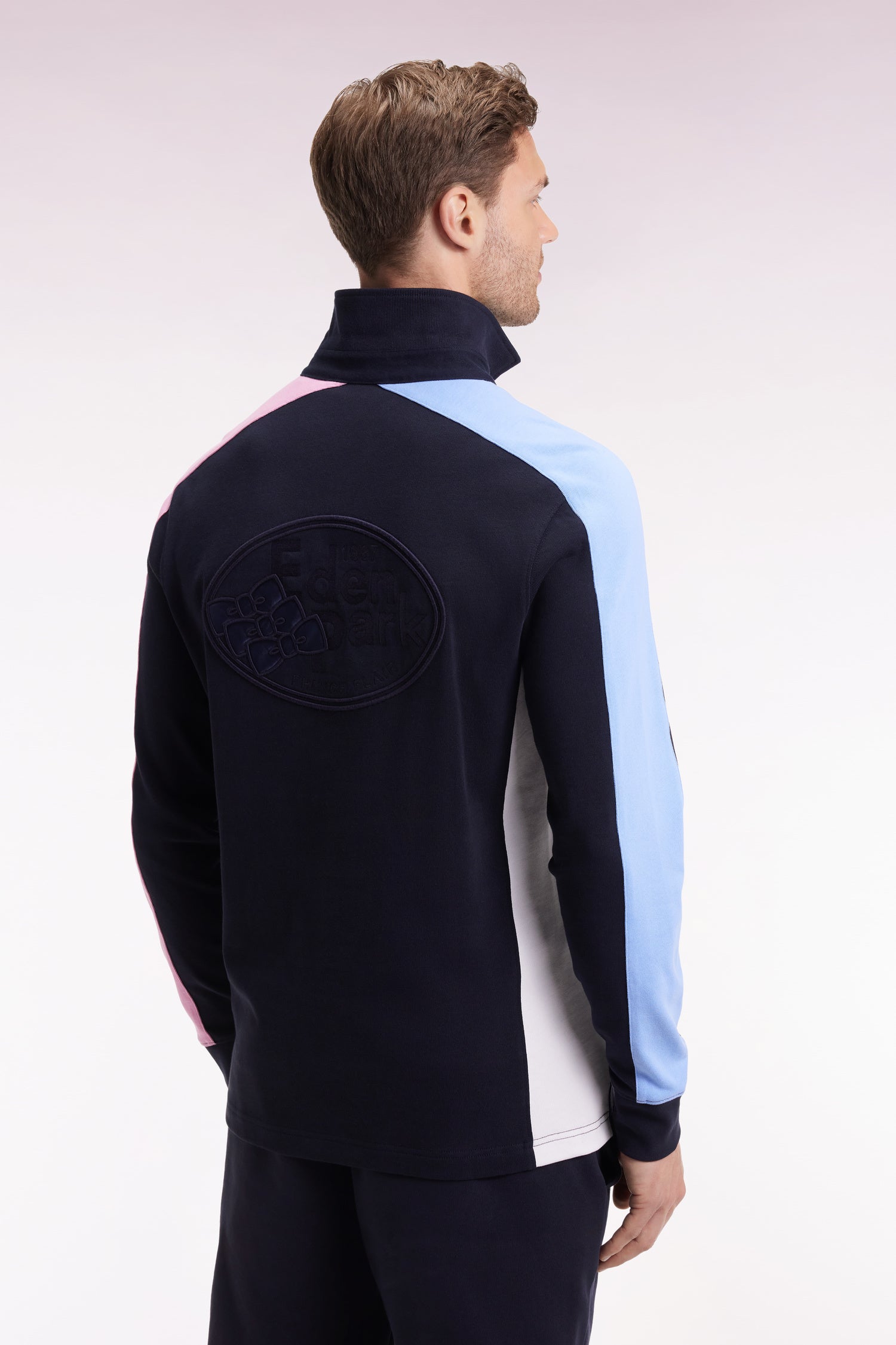 Ce maillot à manches longues en jersey épais se distingue par ses découpes contrastées aux manches et sa broderie dans le dos, rehaussée d'incrustations de tissu cravate ton sur ton pour une allure sportive maitrisée. Le col en twill présente un dessous en maille plate, tandis que les poignets en bord-côtes assurent un ajustement confortable. Une pièce sport-chic essentielle alliant style et détails rugby soignés comme sa plaquette de boutonnage contrastée et ses boutons inspirés de l'ovalie