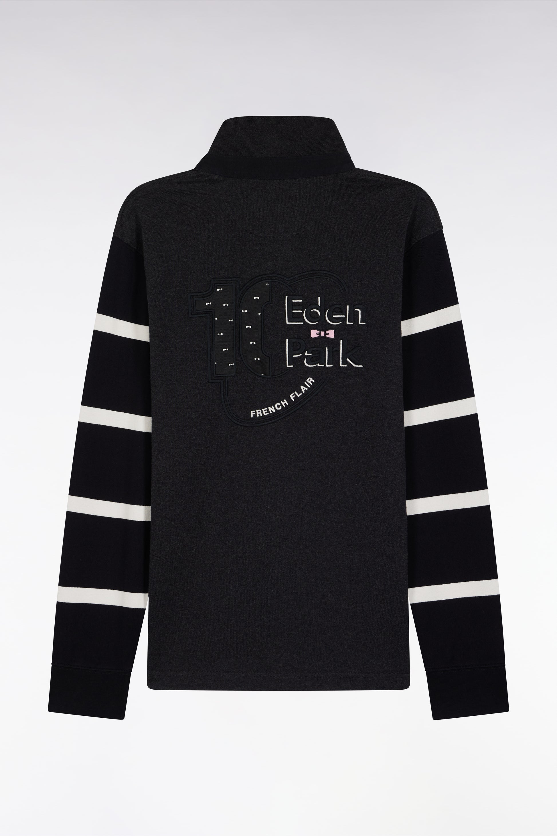 Les rayures sont devenues un signature de la maison Eden Park. Ici, elles habillent les manches de ce maillot en jersey de coton épais tandis que son dos se pare d'une spectaculaire broderie exclusive rehaussée par des inserts de tissu cravate imprimé de mini nœuds papillon. Un essentiel sport-chic aussi tendance que confortable