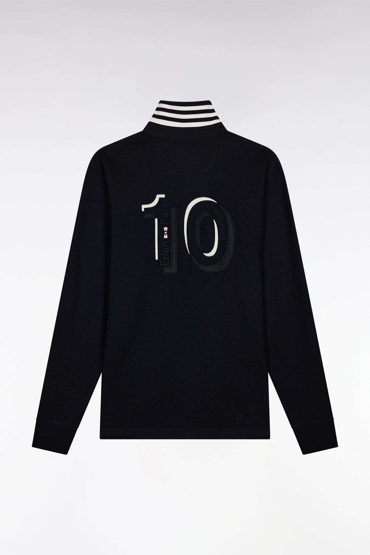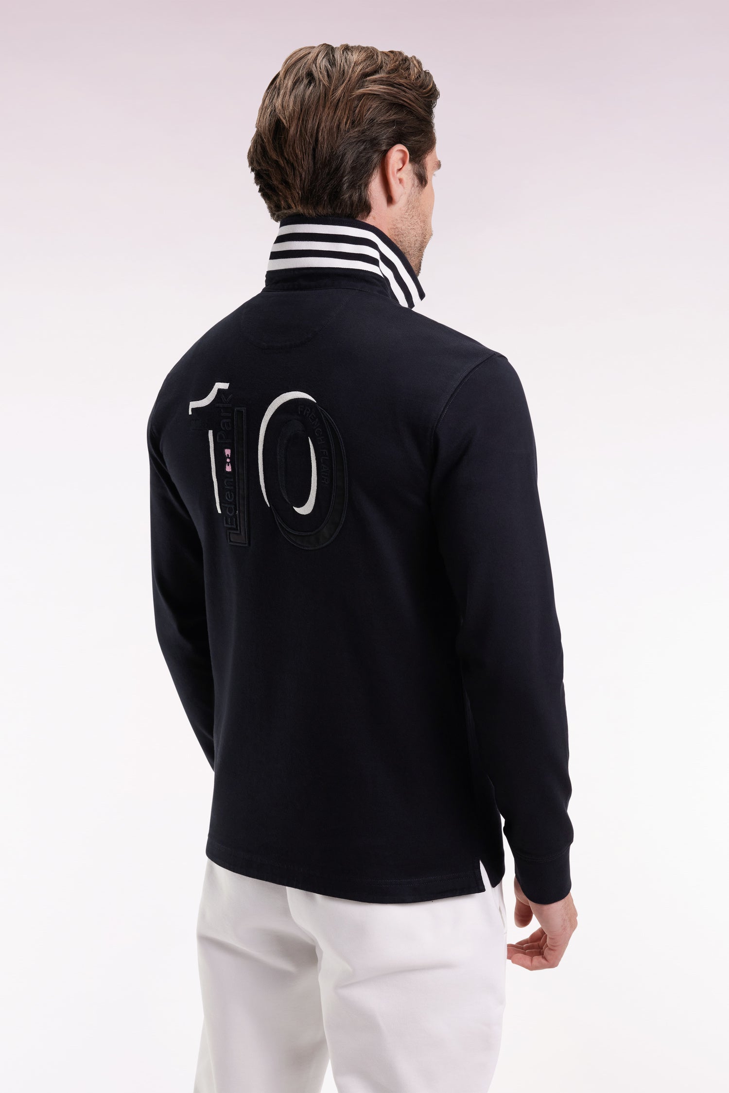 Inspiré des maillots de rugby iconiques de notre maison et de la marinière française, ce modèle à manches longues revisite les codes du vestiaire sport-chic avec des rayures contrastées placées à l’avant et une broderie dos en relief avec tissu cravate incrusté. Son col en twill doublé de bords-côtes rayé et ses finitions soignées renforcent le caractère graphique et structuré de ce maillot. Un essentiel contemporain pour une silhouette masculine dynamique et élégante