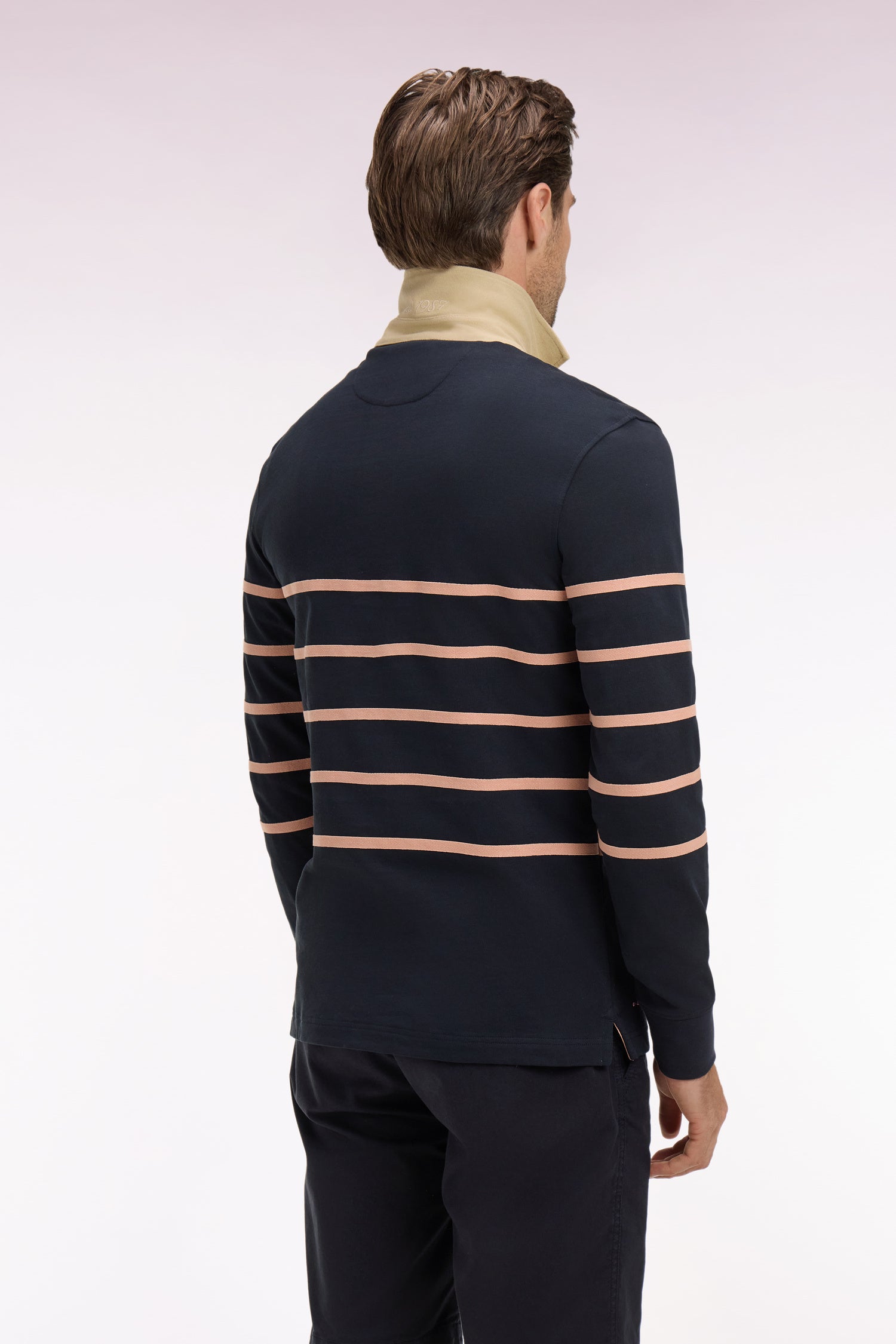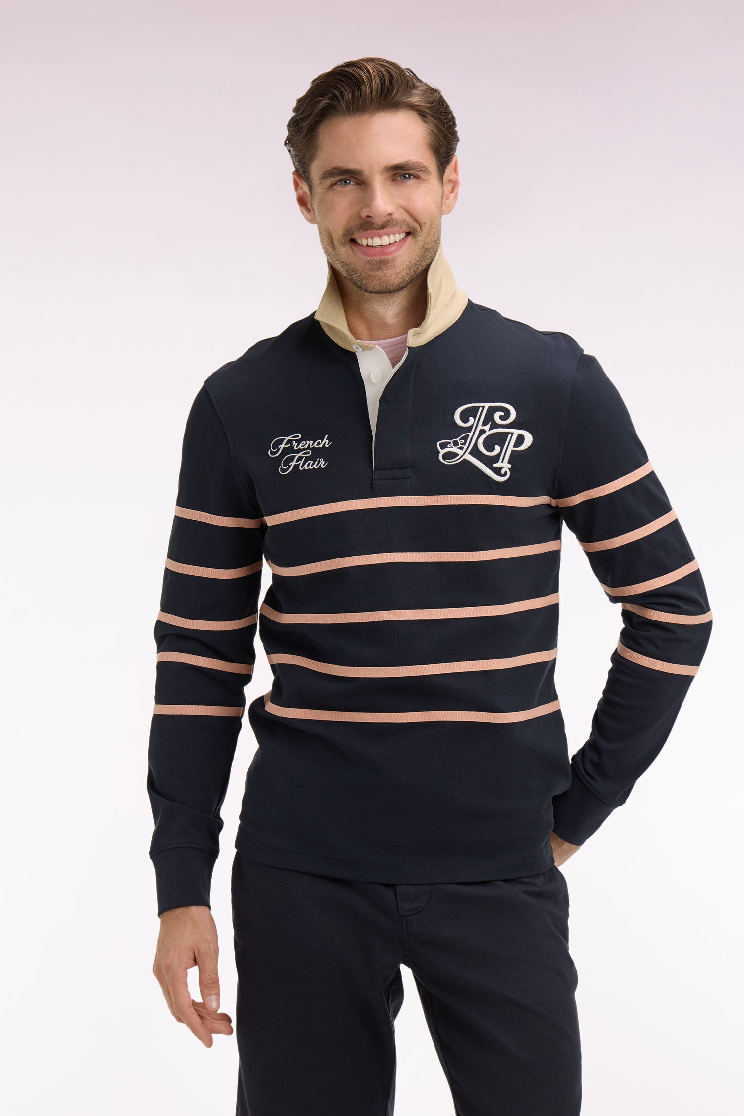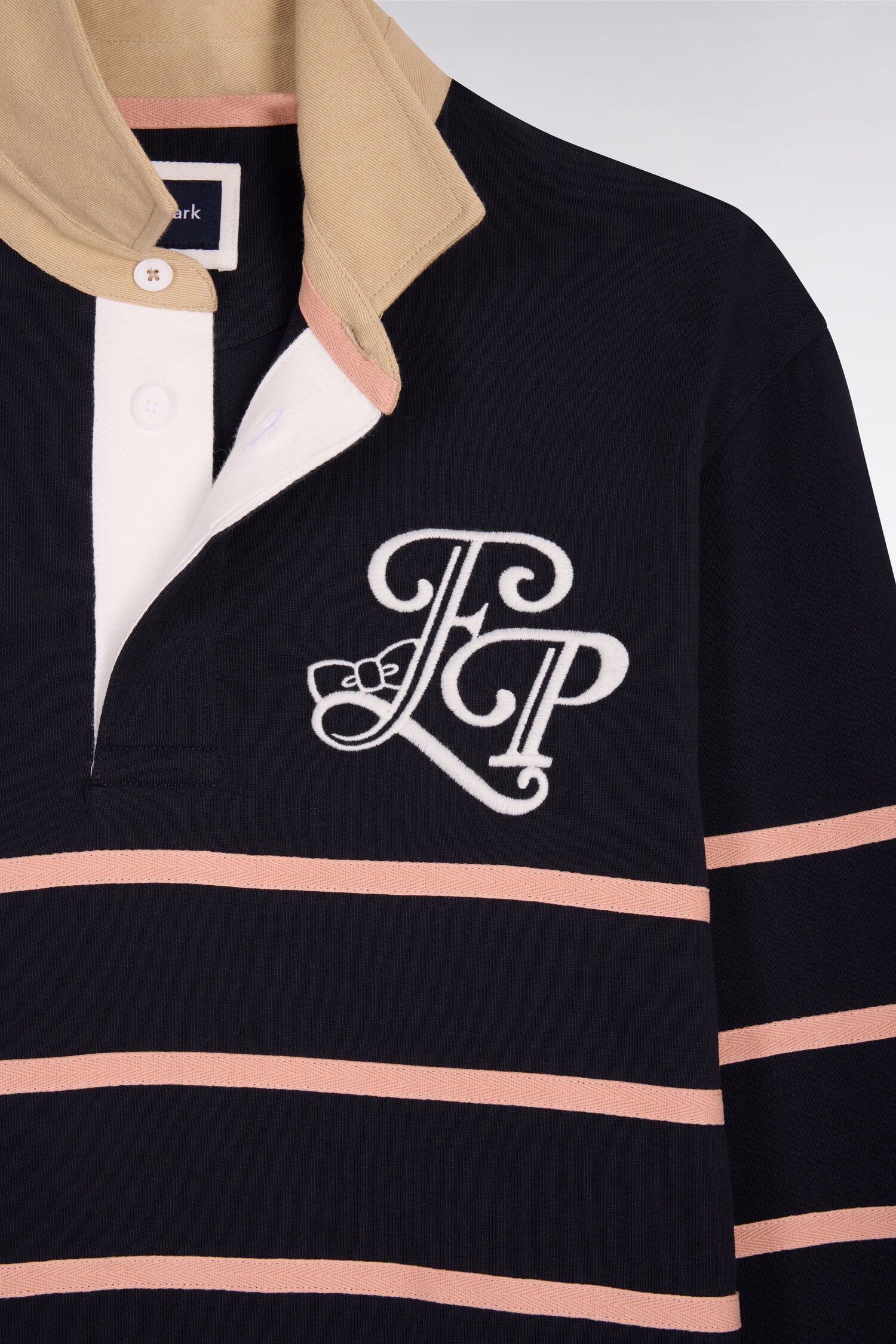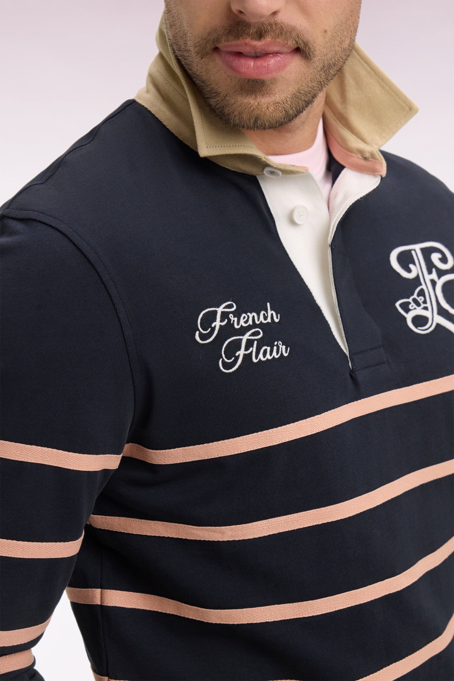 Avec ses initiales et sa devise French Flair brodées, ce maillot de rugby affirme une esthétique sport chic aux accents Ivy League. Le bleu marine est associé à un col maillot beige, rappel de ses fines rayures pour un contraste maitrisé. Une pièce emblématique d'un rugby dans une approche résolument gentleman, des gradins au quotidien.