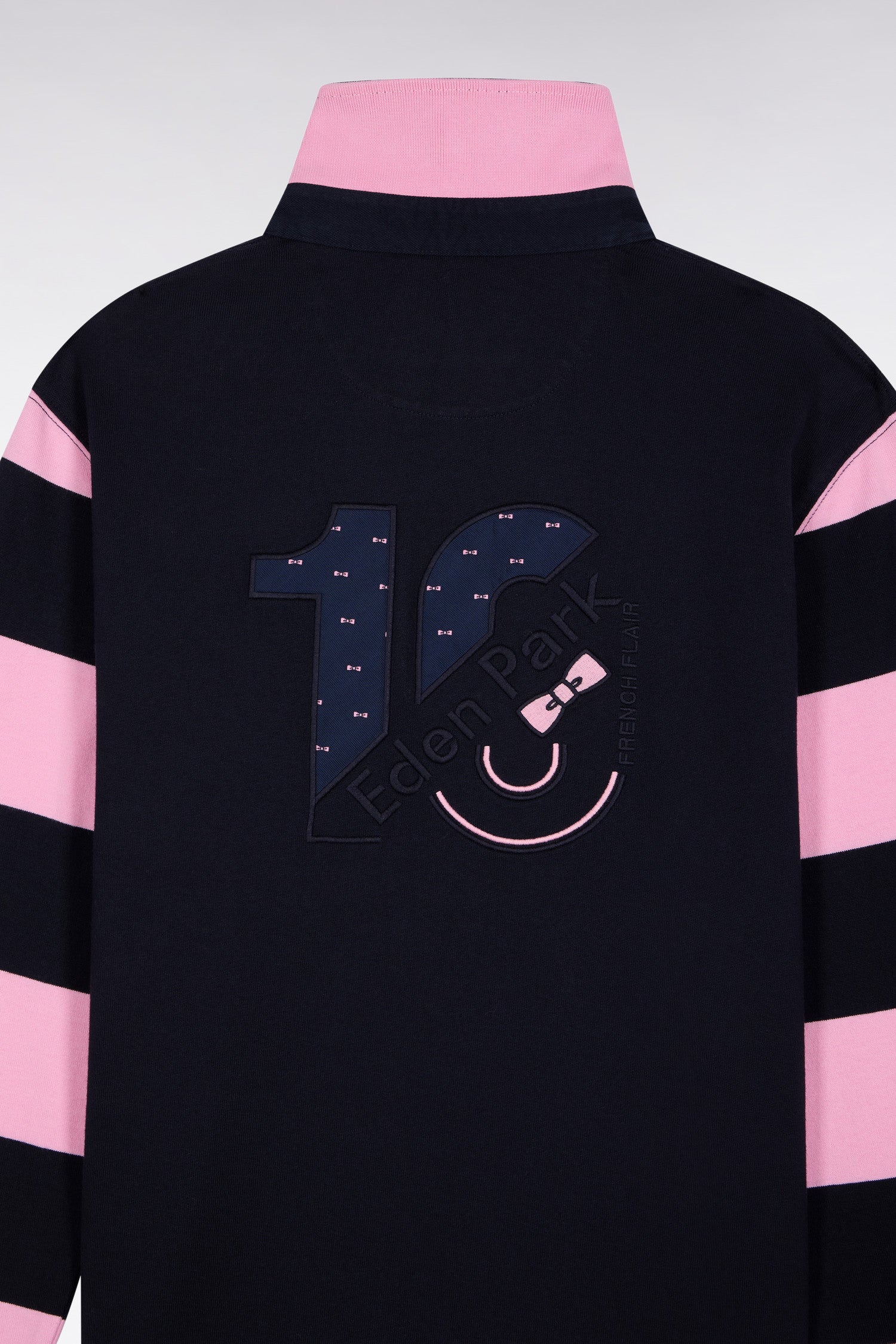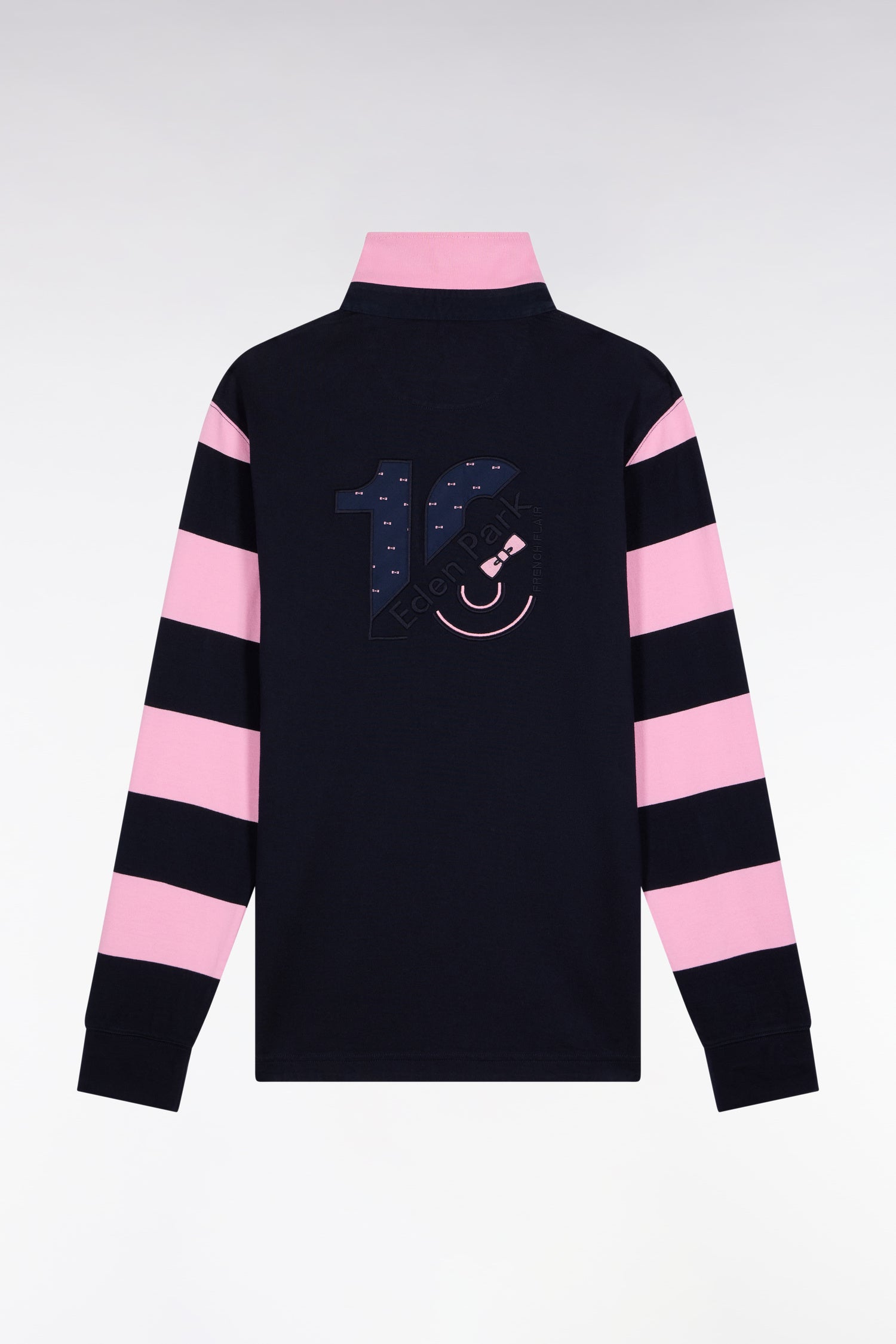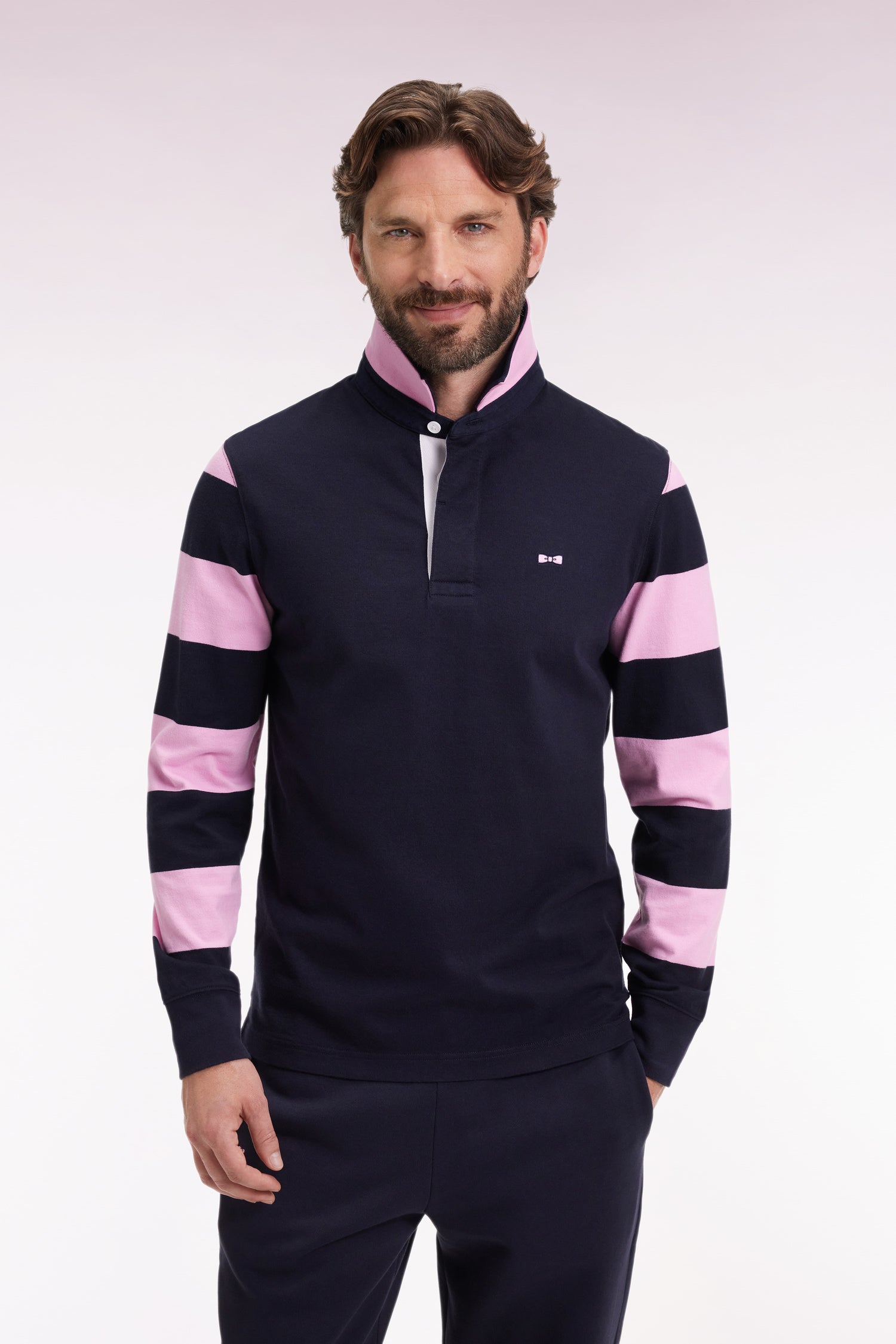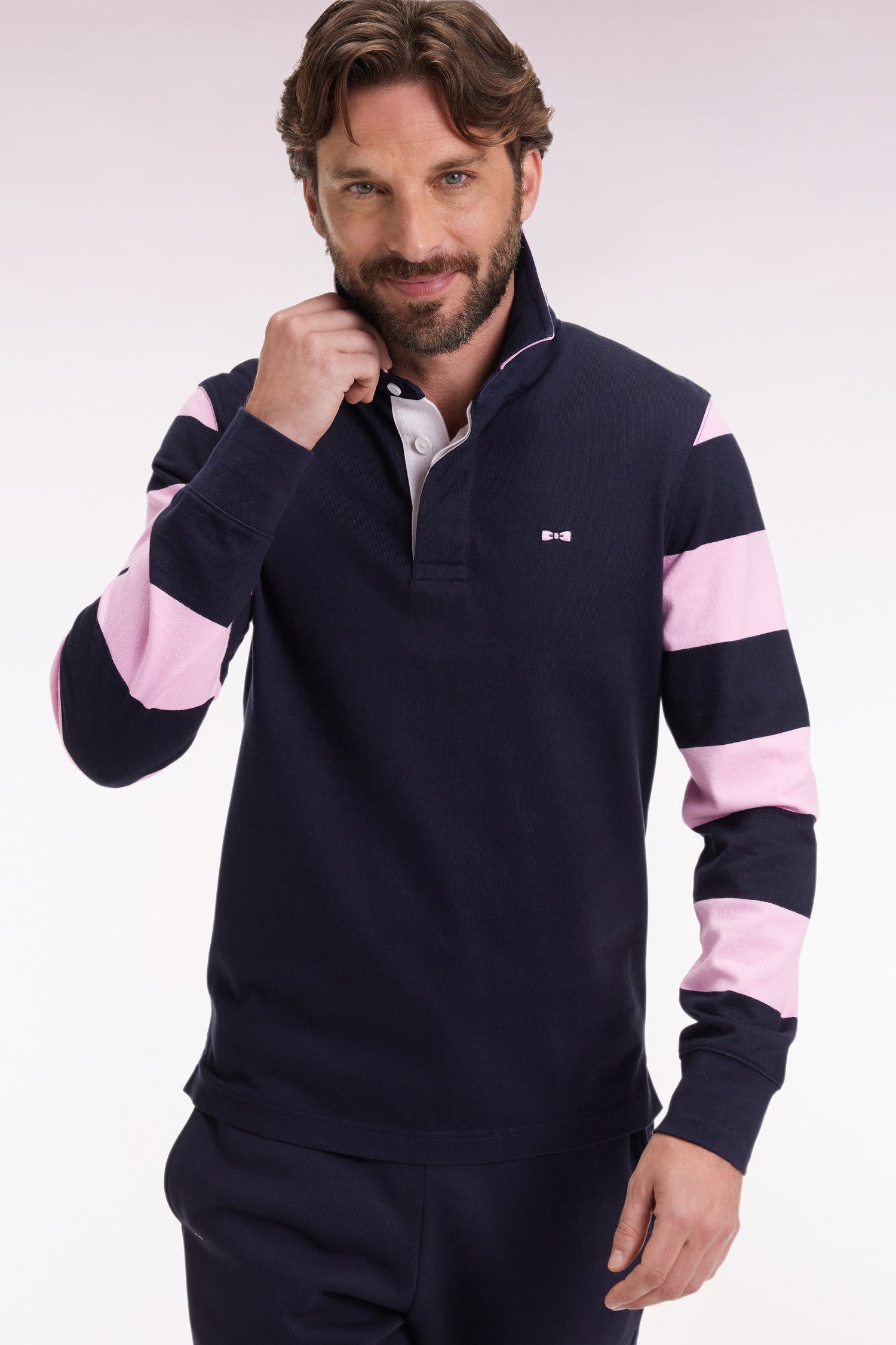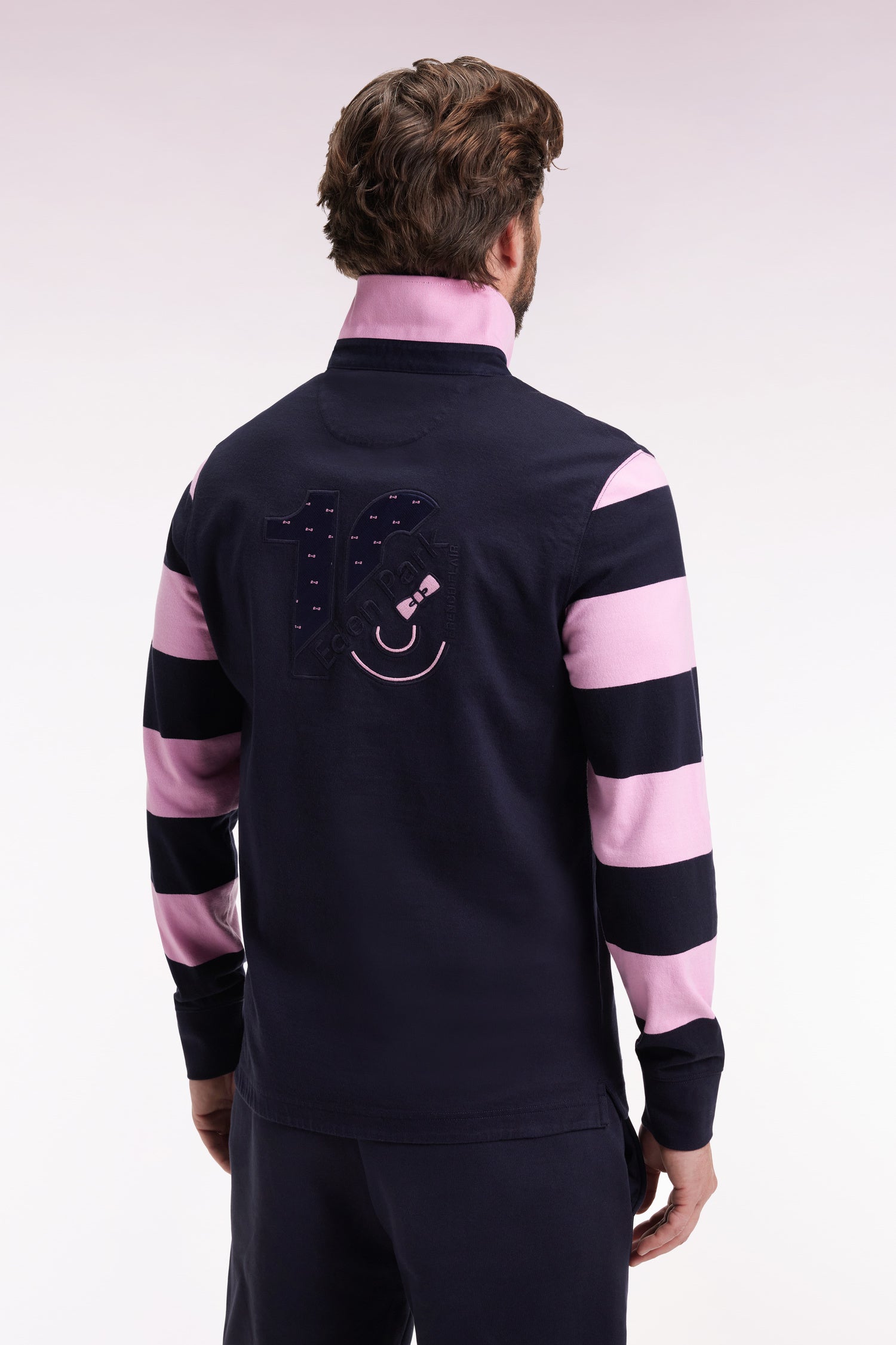 Inspiré des maillots de rugby traditionnels, ce modèle urbain à manches longues, réalisé en molleton gratté, se distingue par ses rayures contrastées sur les manches et sa broderie dos avec incrustation de tissu cravate imprimé. Une pièce forte et confortable, idéale pour un style affirmé dans vos moments de détente