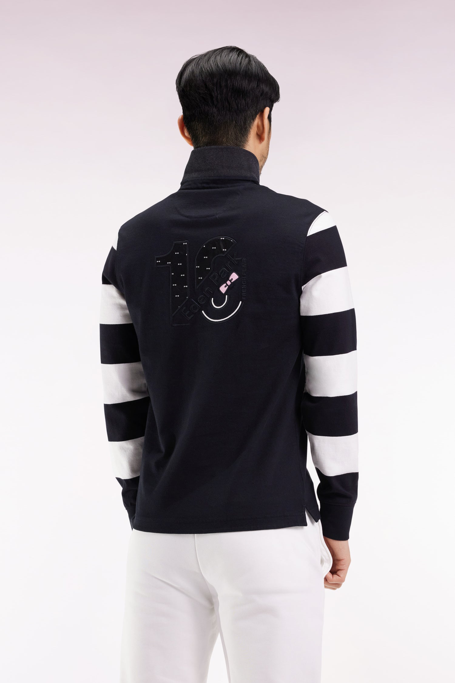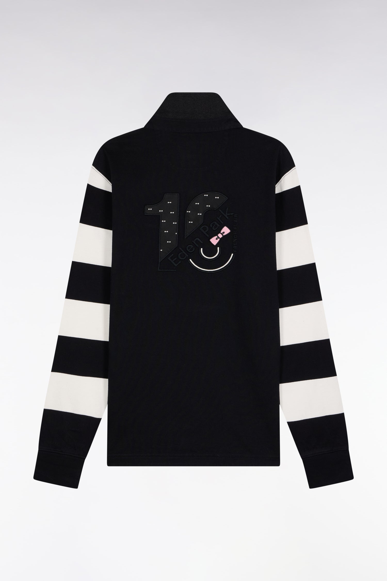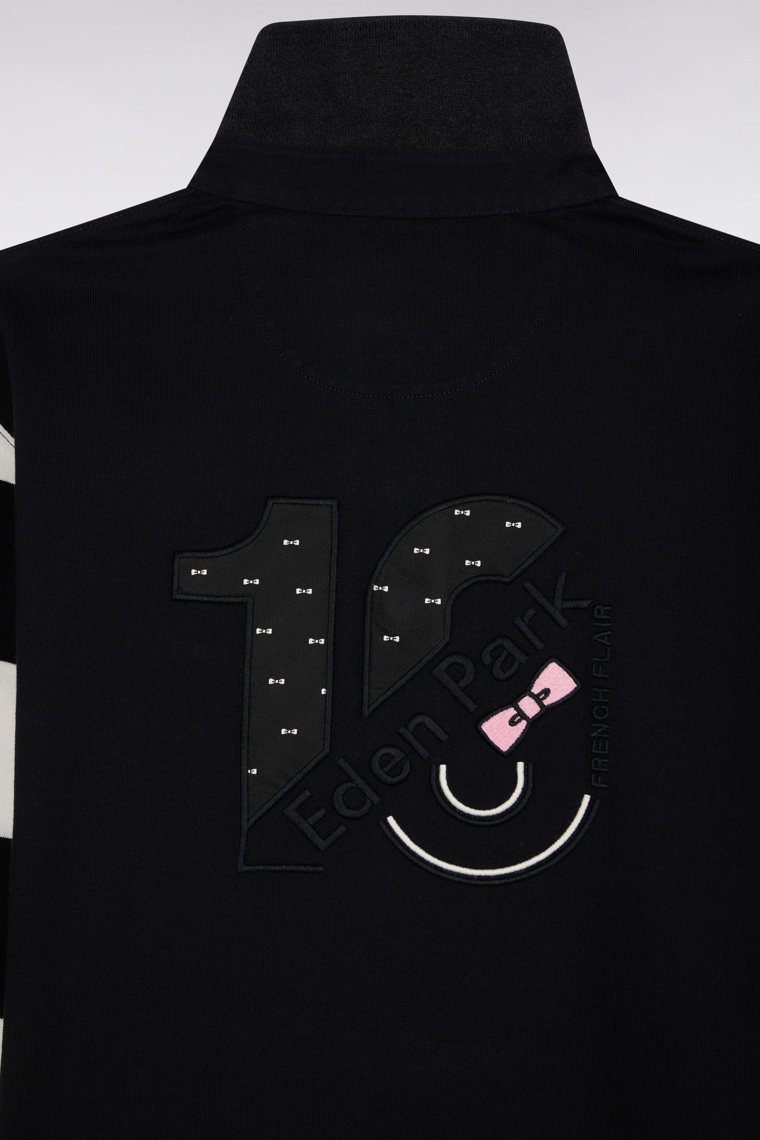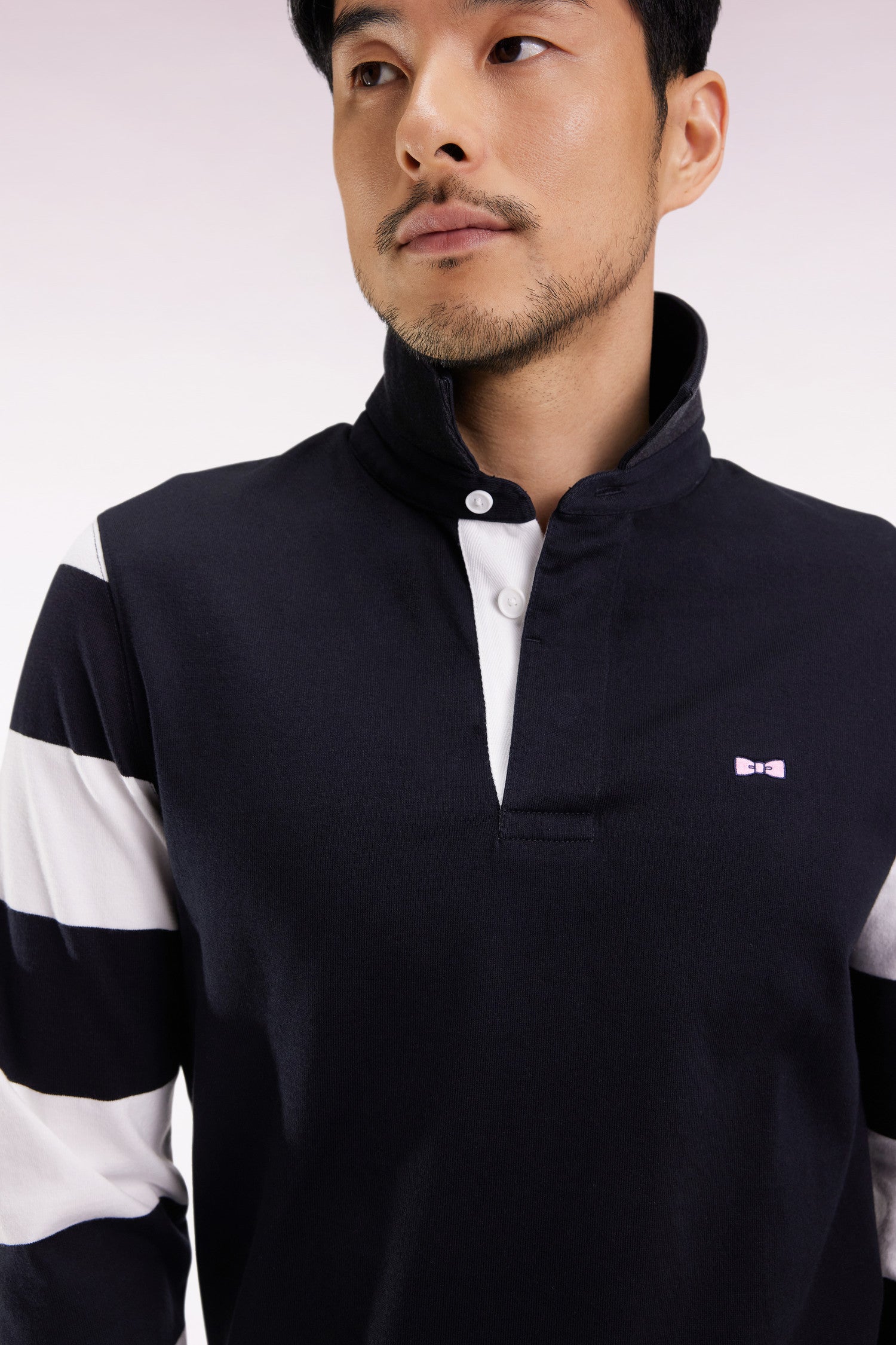 Inspiré des maillots de rugby traditionnels, ce modèle urbain à manches longues, réalisé en molleton gratté, se distingue par ses rayures contrastées sur les manches et sa broderie dos avec incrustation de tissu cravate imprimé. Une pièce forte et confortable, idéale pour un style affirmé dans vos moments de détente