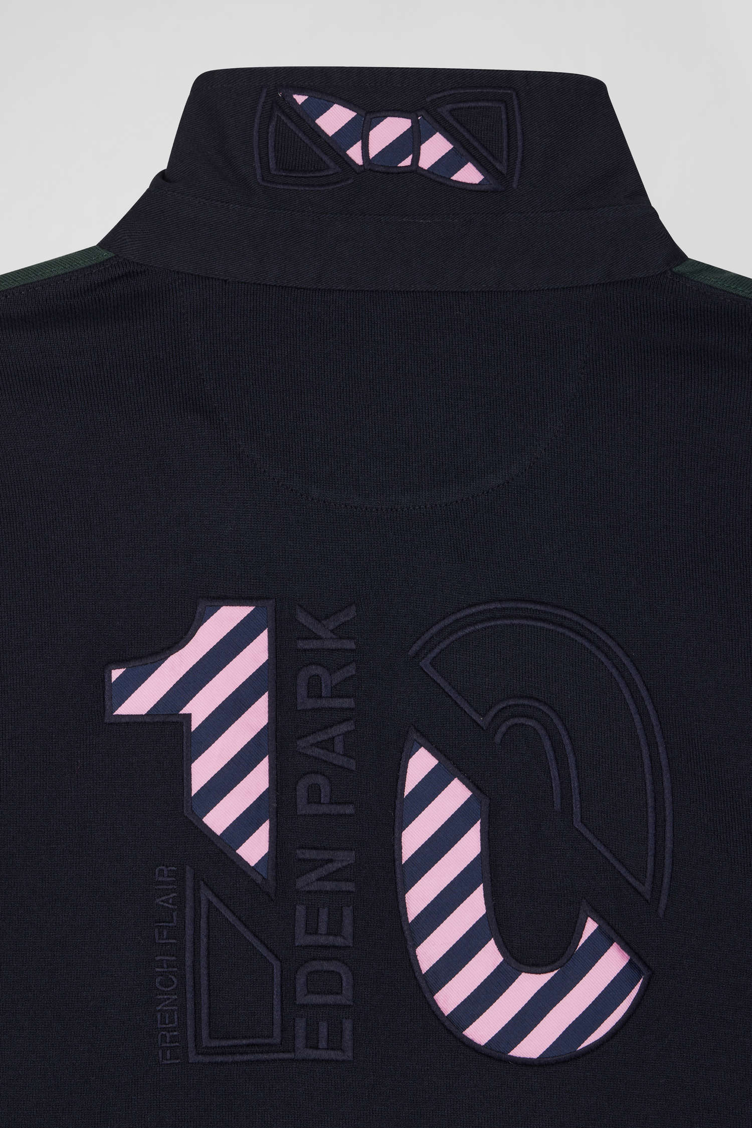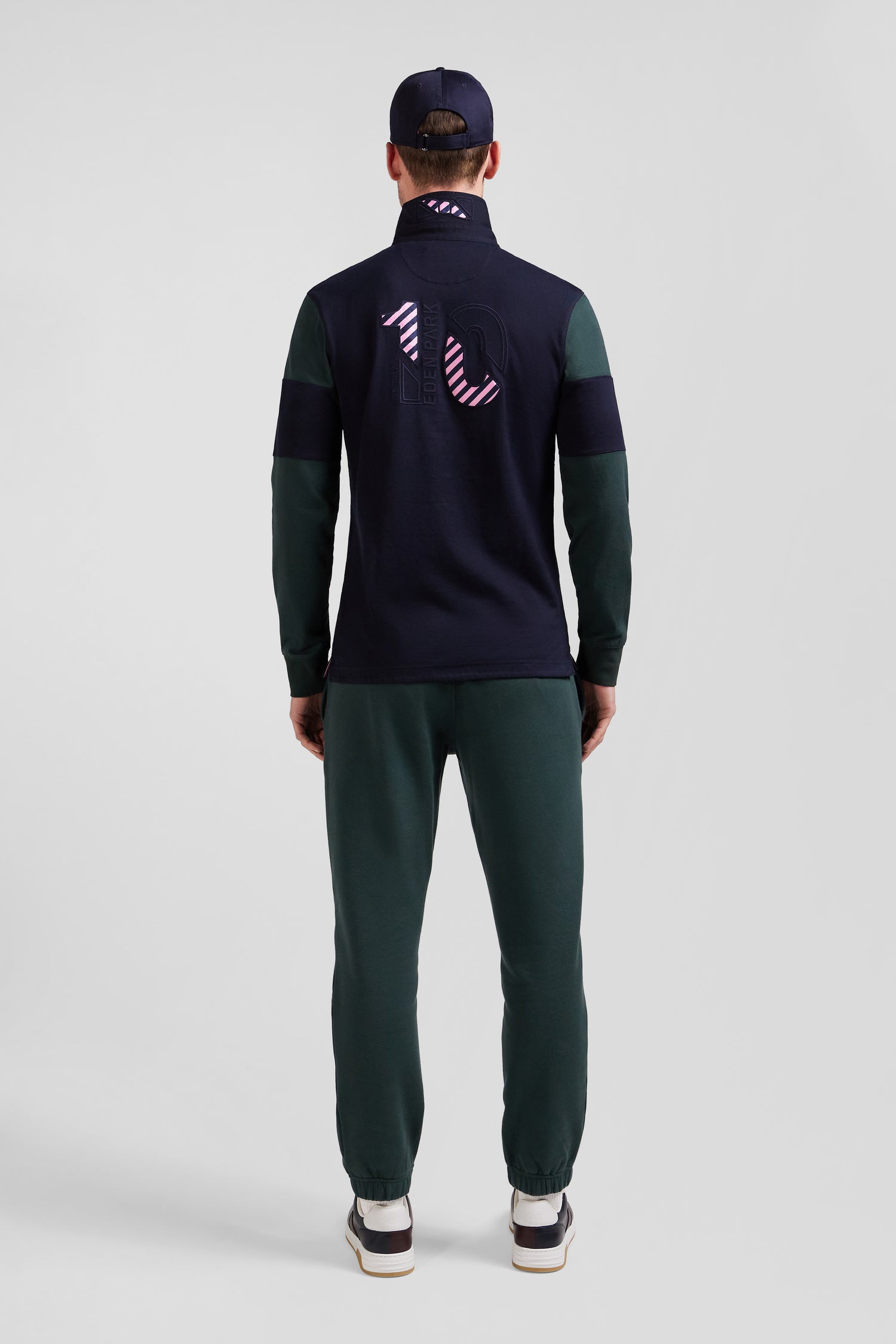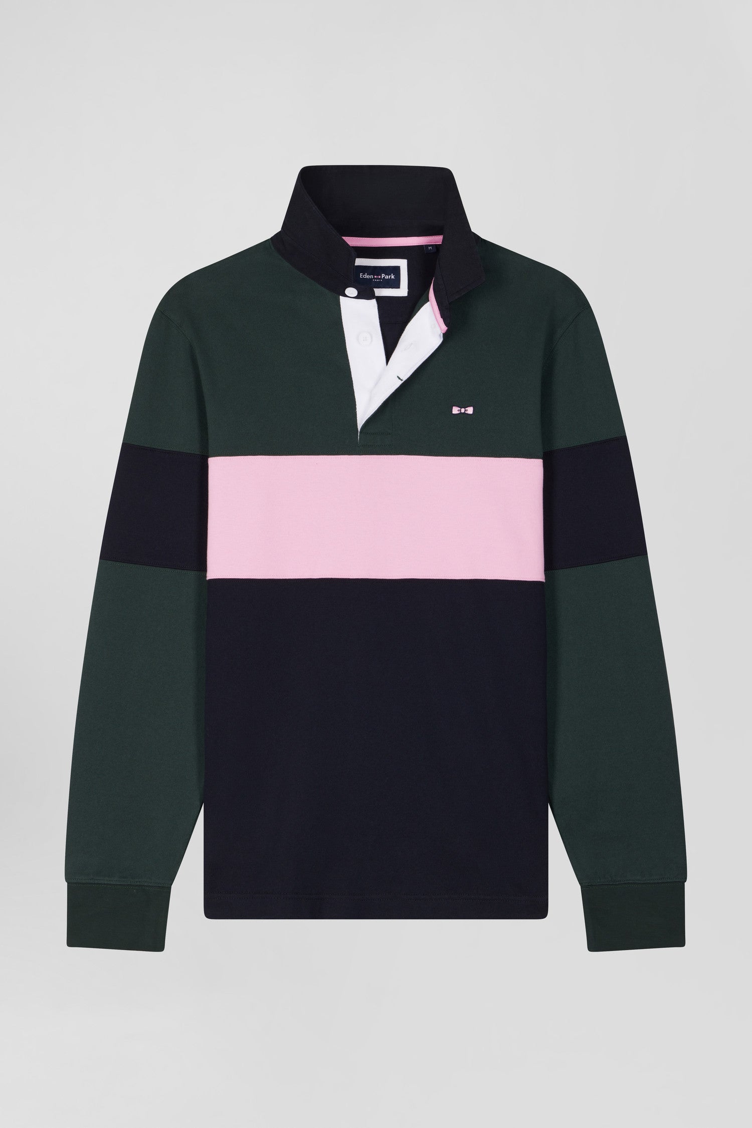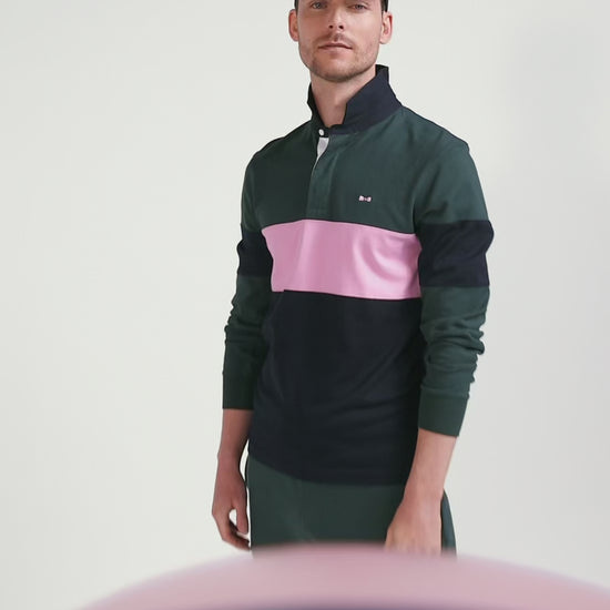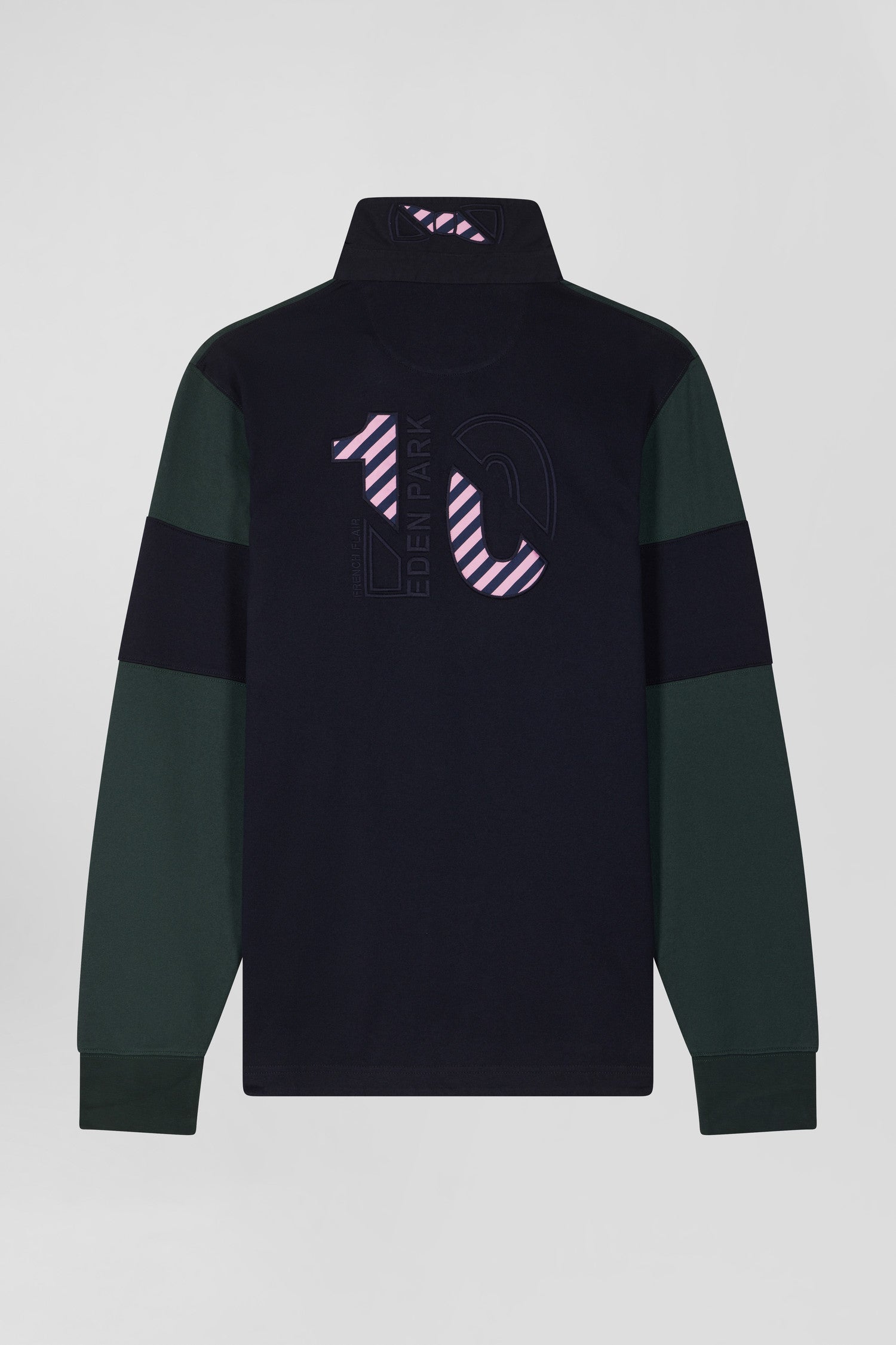 Affirmez votre style avec ce maillot homme à manches longues Eden Park. L'élégance sportive se réinvente dans un colorblock hommage aux couleurs iconiques de notre Maison. La broderie audacieuse du numéro 10 dans le dos, soulignée de tissus cravate cerclés, célèbre l'héritage rugby avec panache. Le col classique, la patte de boutonnage contrastée et l'emblématique nœud papillon brodé apportent à cette pièce de caractère une finition distinguée.