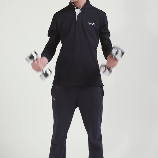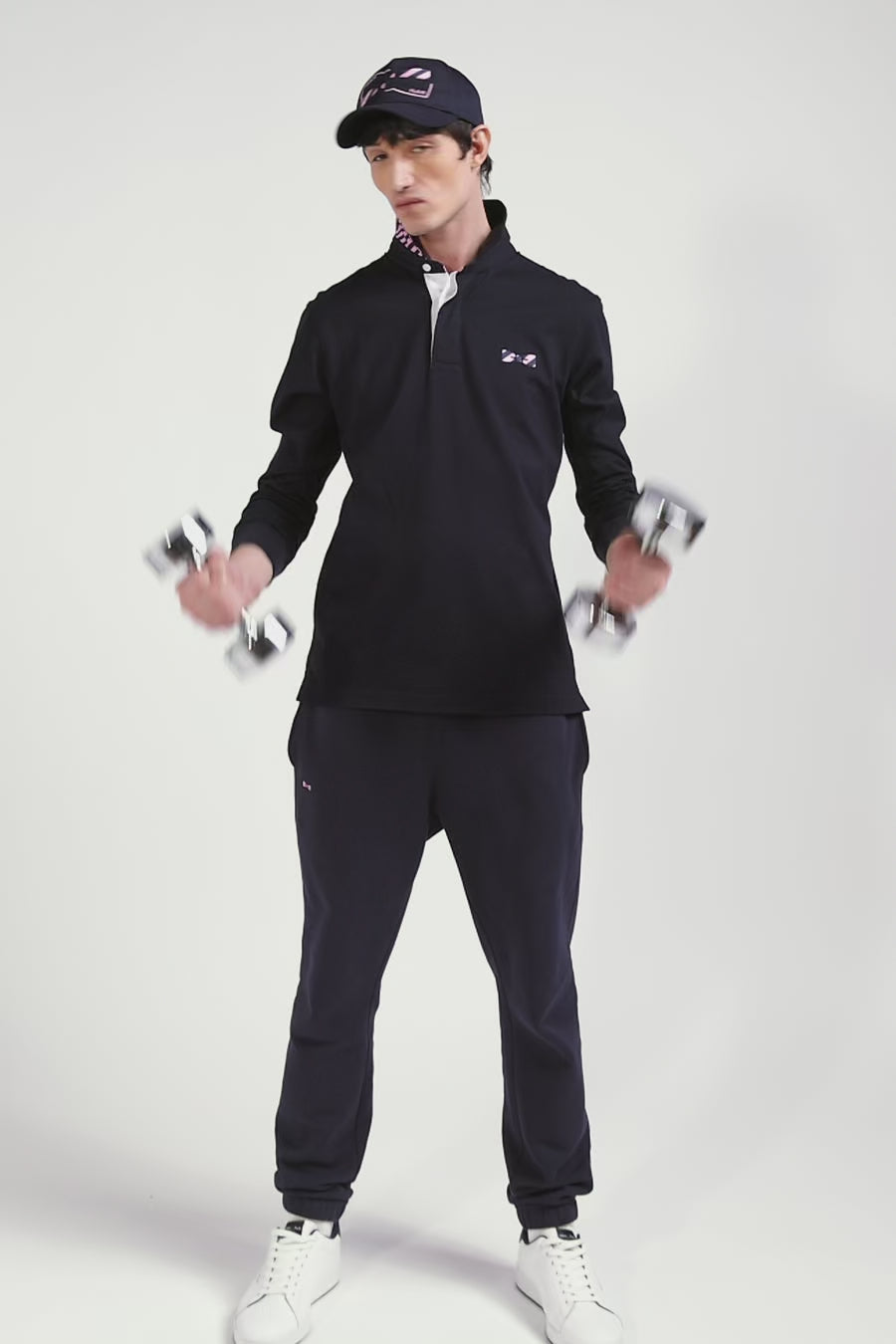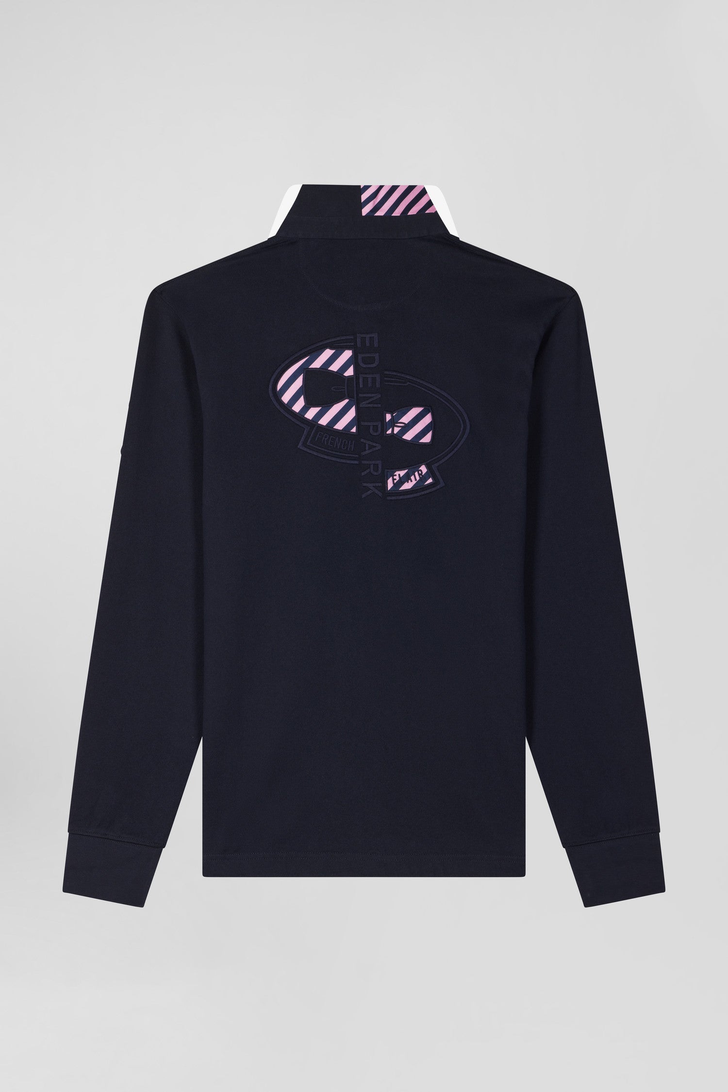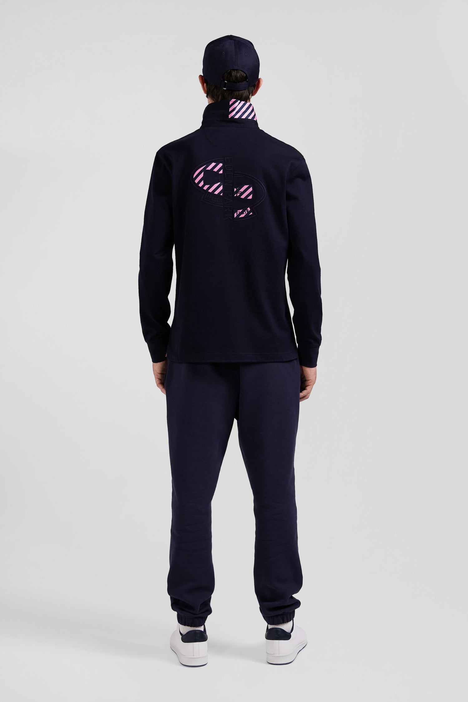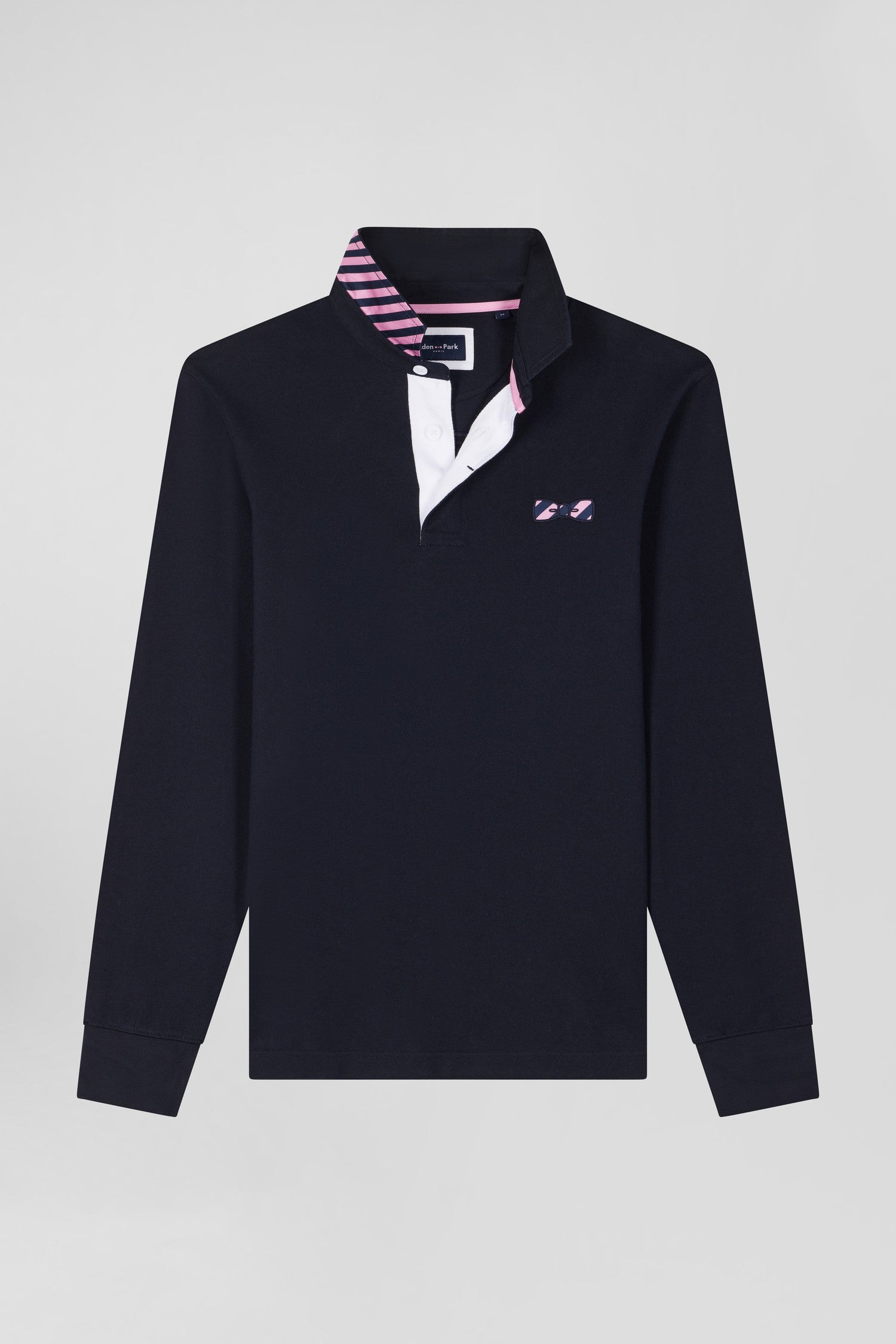 Ce maillot pour homme, aux manches longues et à la coupe Regular droite, conjugue confort et allure avec son jersey de coton doux au porté. Le col polo, dont le dessous est doublé sur sa moitié d'un tissu cravate cerclé, et sa broderie emblématique dans le dos incarnent l'ADN et la touche French Flair du vestiaire Eden Park. Rappel subtil, sa broderie nœud papillon sur la poitrine se fait légèrement plus visible et arbore elle aussi les rayures marine et roses si caractéristiques de l'esprit de nos collections.