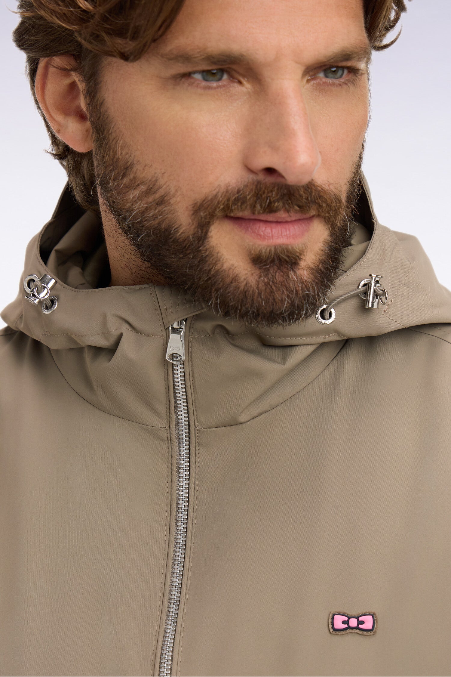 - Capuche fixe avec lien de resserrage et curseurs siglés