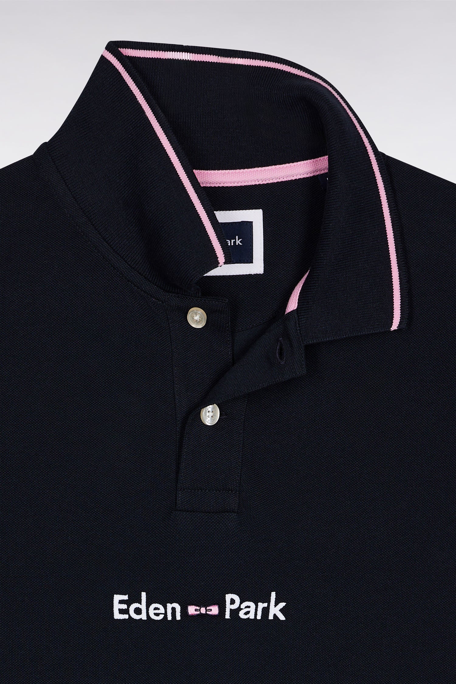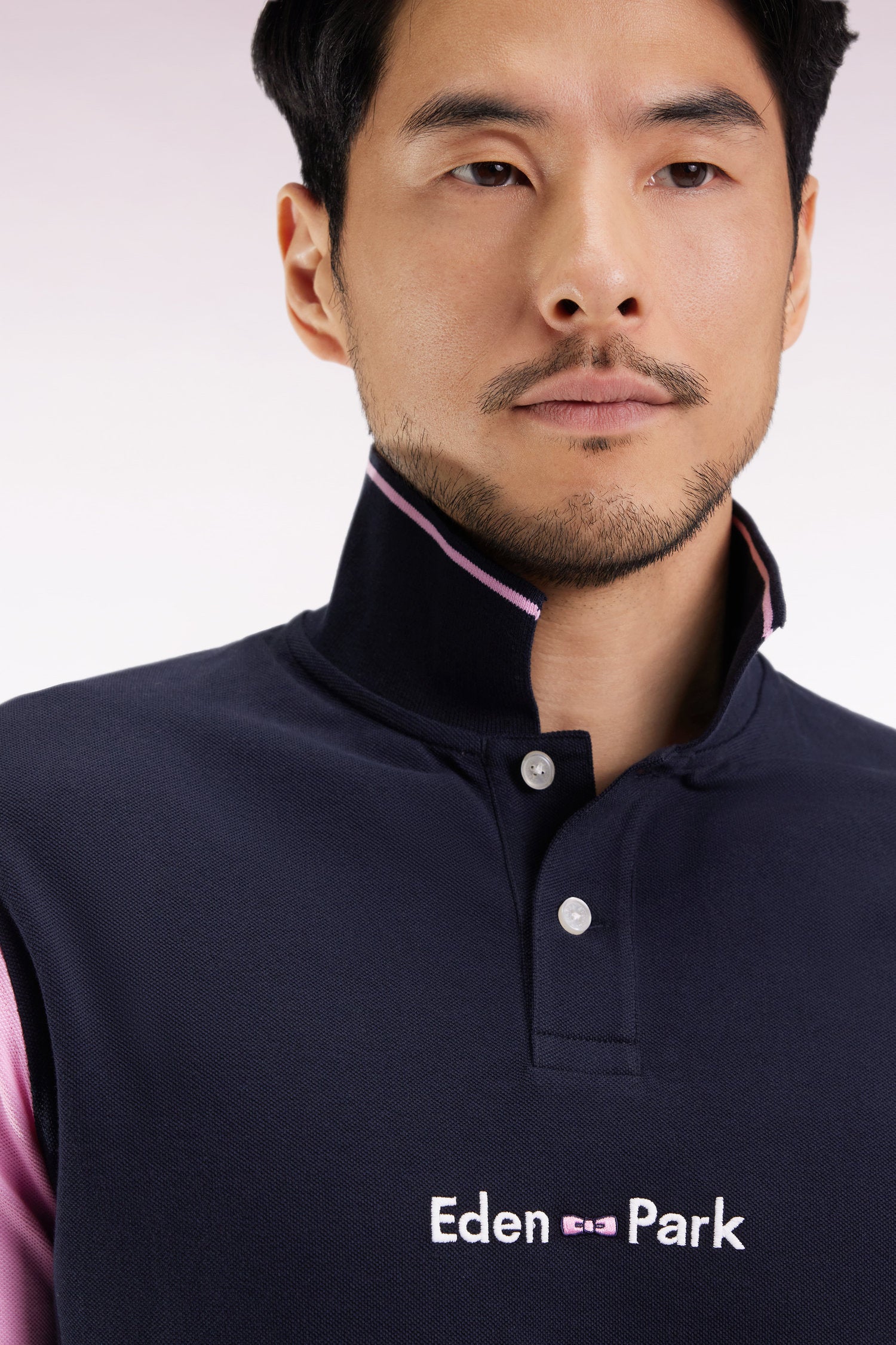 Avec ses accords bicolores et sa broderie logo frontale, ce polo est une pièce signature de l'esprit des collections Eden Park. Son piqué de coton doux et respirant et sa coupe droite en font une pièce confortable au quotidien. Une fine rayure colorée habille les bords-côtes tricotés à plat en bordure de manches et de col