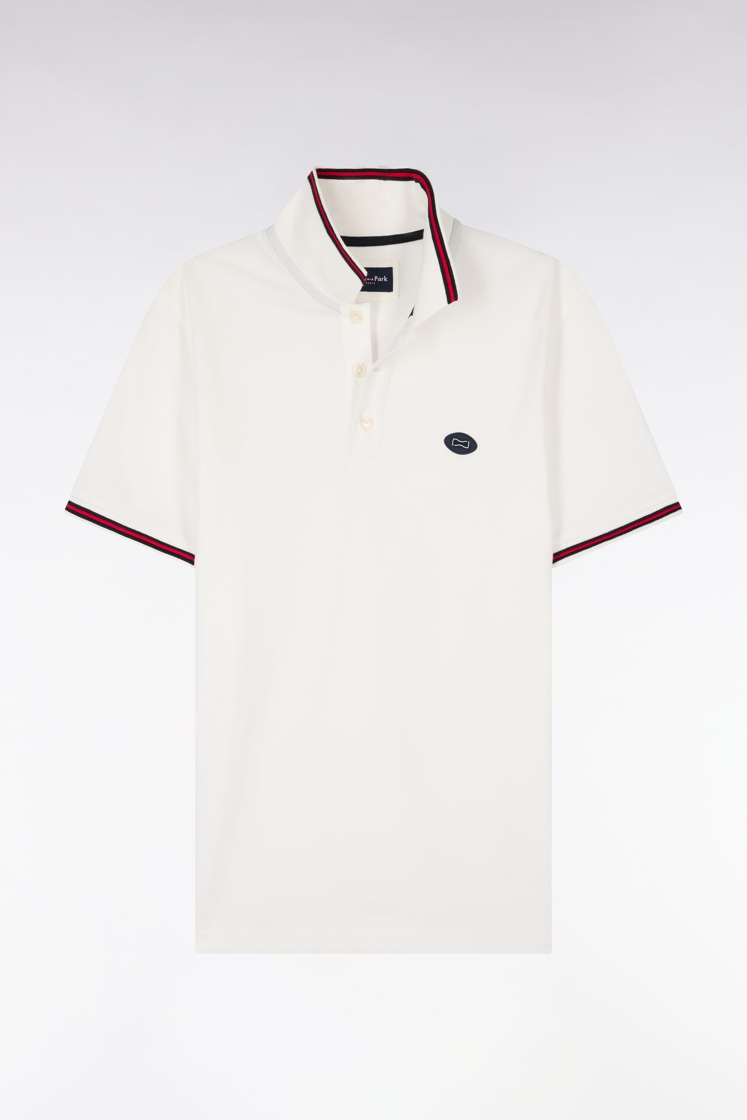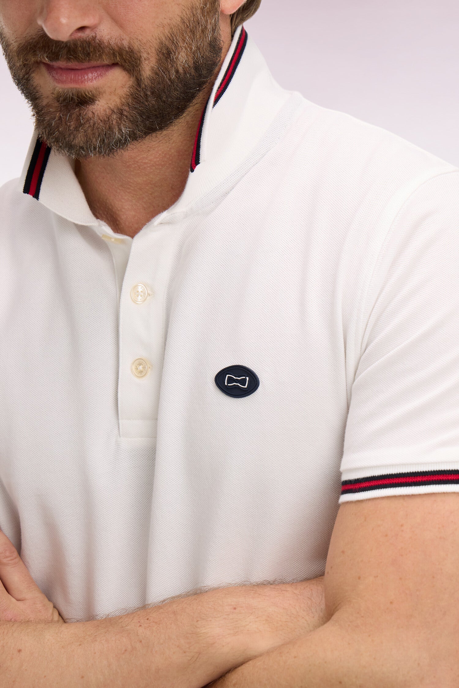- Col polo et bas de manches à finition rayée