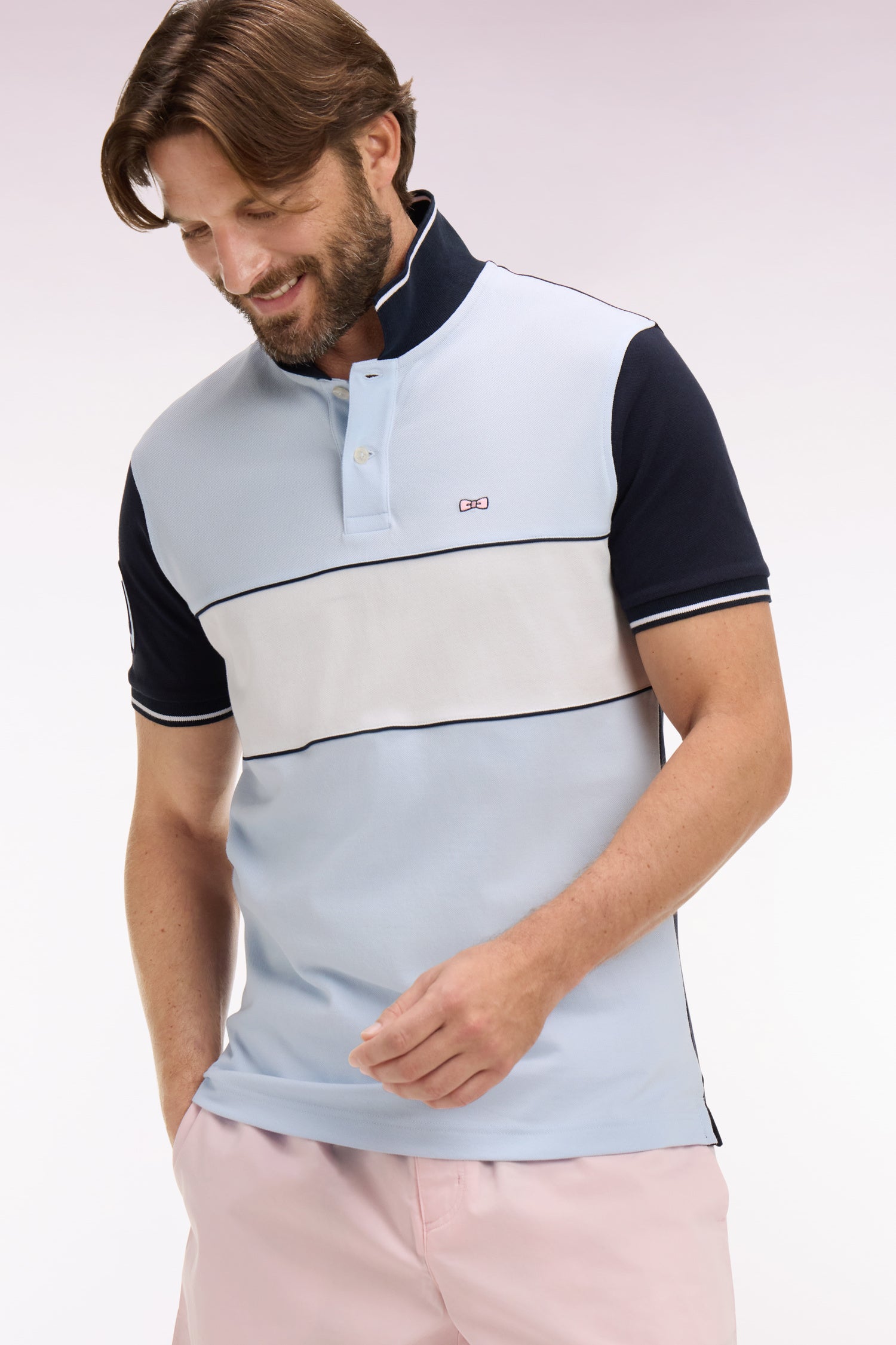 Ce polo masculin en piqué de coton coupe regular célèbre l’ADN rugby de la Maison grâce à sa large bande poitrine blanche, soulignée de passepoils marine qui structurent la silhouette. Le nœud papillon brodé et la broderie 10, enrichie d’une application en tissu cravate, renforcent son caractère identitaire. Son col et ses bas de manches en bords-côtes tricotés sont rehaussés d’un liseré contrasté, pour une touche élégante et sportive. Décliné dans les 4 coloris pastel signature de la saison, toujours associé à l'intemporel marine, ce polo à manches courtes incarne la modernité et la polyvalence du vestiaire sport chic Eden Park.