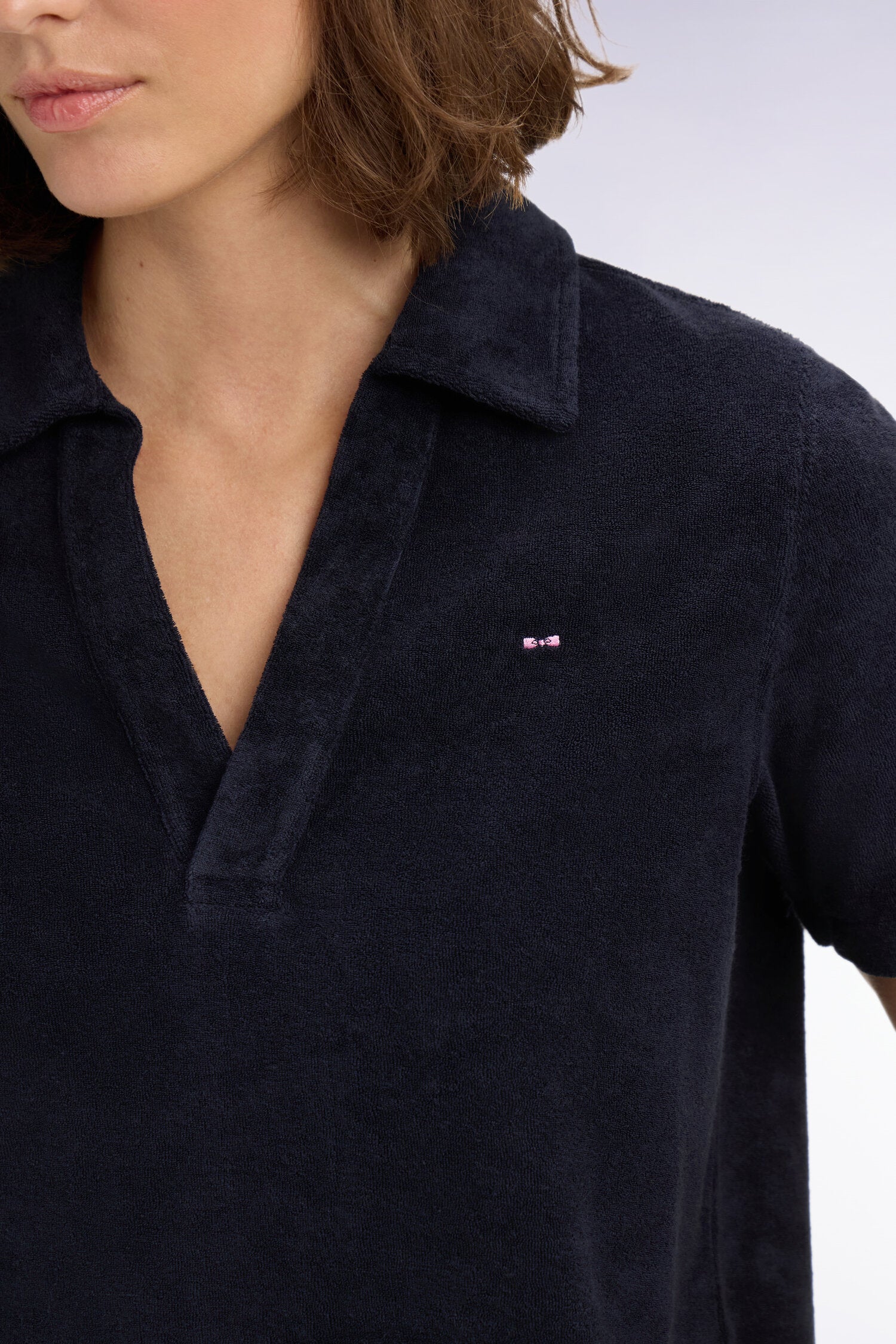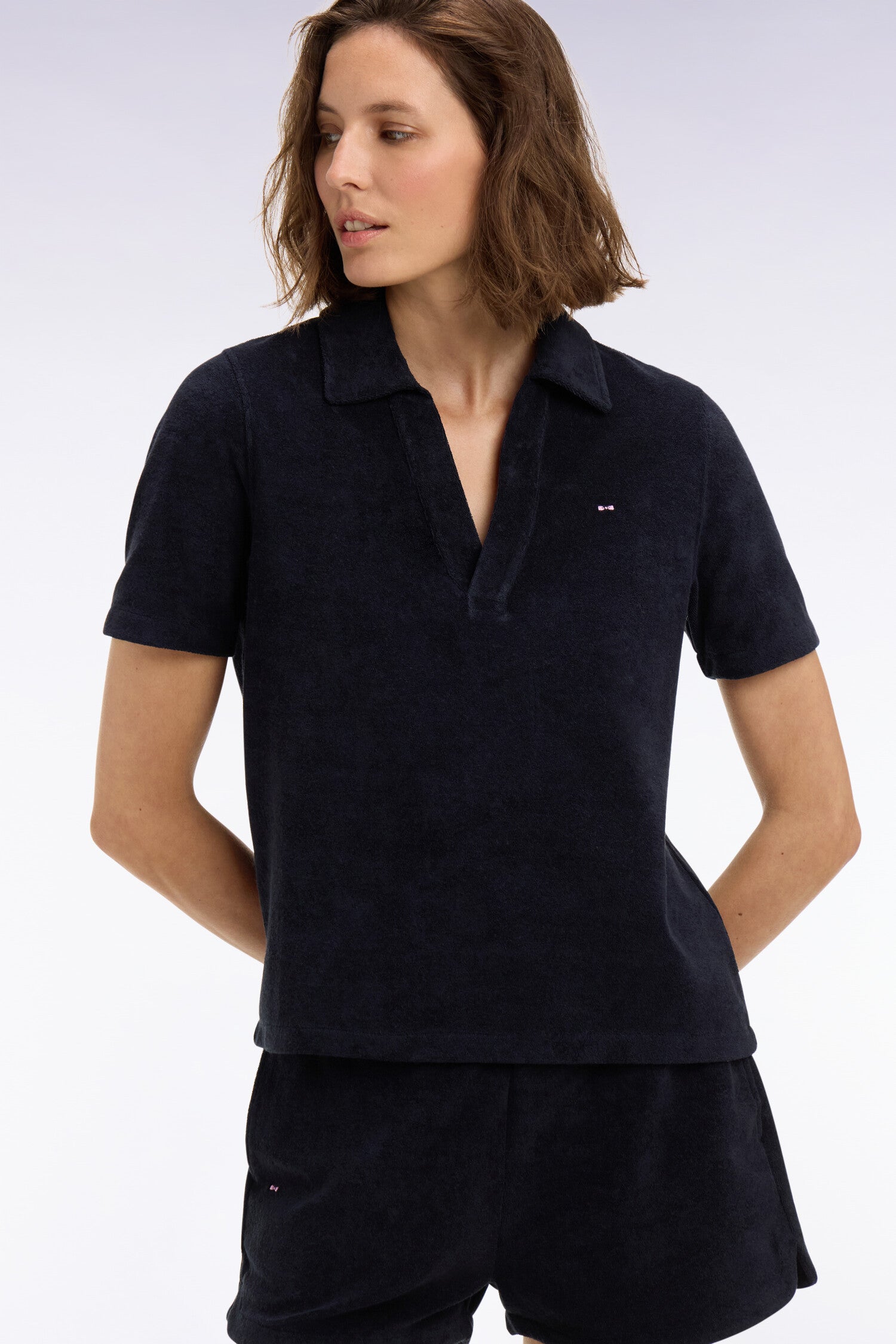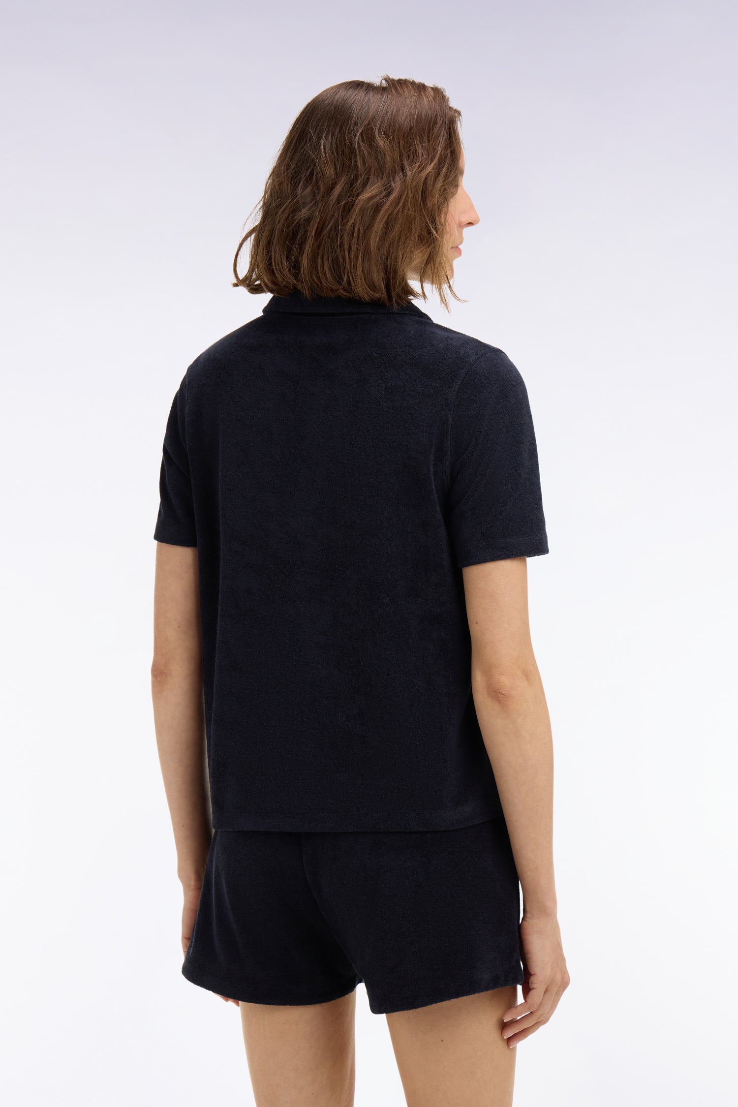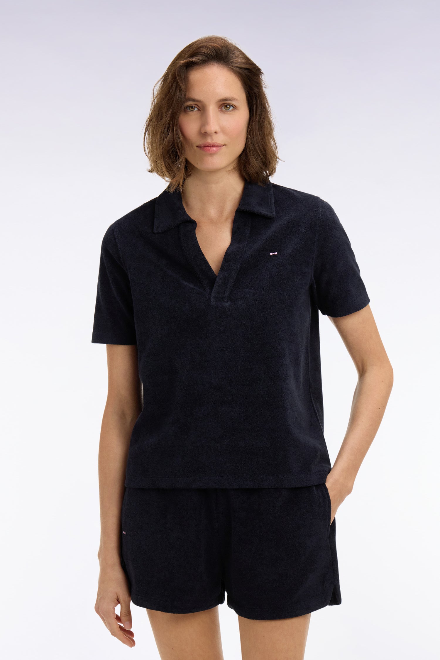 Ce polo féminin à manches courtes en coton éponge, proposé en blanc ou en marine, allie douceur estivale et style sport chic. Son toucher moelleux et sa coupe confortable en font une pièce idéale pour les journées ensoleillées passées de la ville à la plage. À porter avec le short assorti pour un ensemble coordonné et résolument moderne aux accents balnéaires.