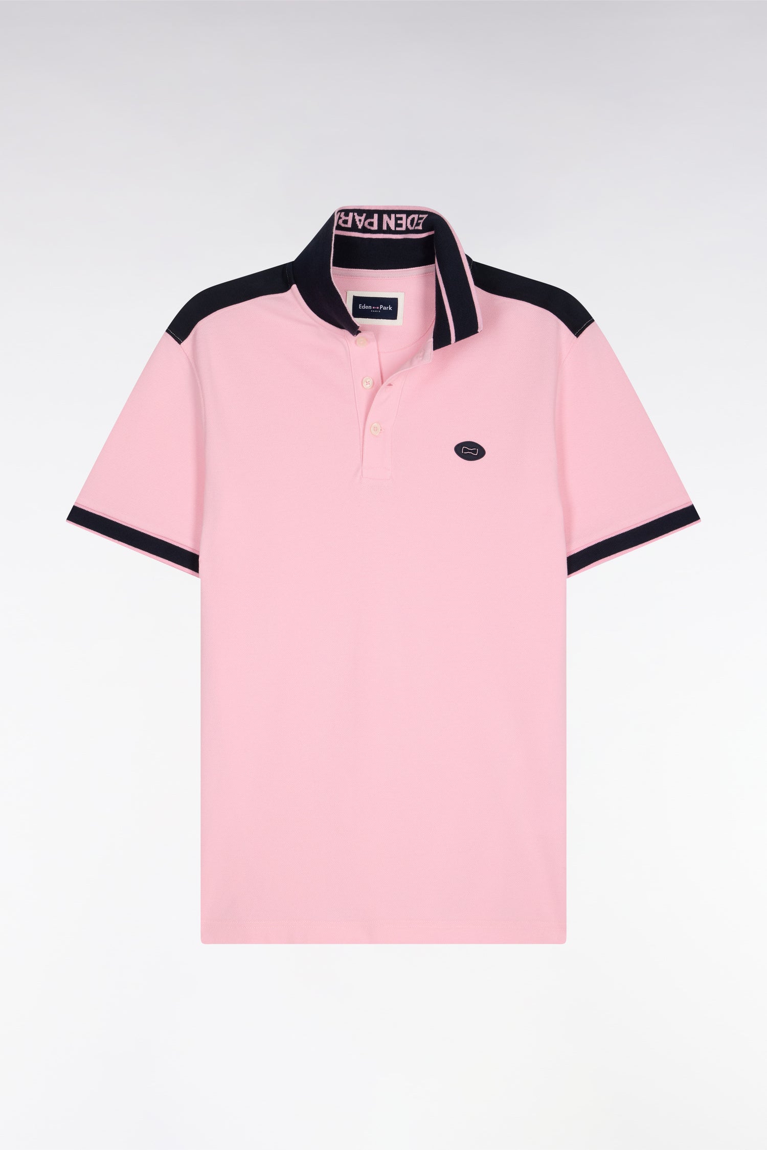 Ce polo masculin en piqué de coton façonné dans une coupe regular affirme une allure sport chic grâce à son badge poitrine et ses finitions bords-côtes rayées au col et aux manches. Le jacquard Eden Park au dos du col et la découpe sur les épaules, héritage coupé cousu de nos ateliers, renforcent son caractère graphique. Décliné en noir, ciel ou rose, ce polo à manches courtes incarne l'élégance moderne et assumée de l'homme Eden Park.