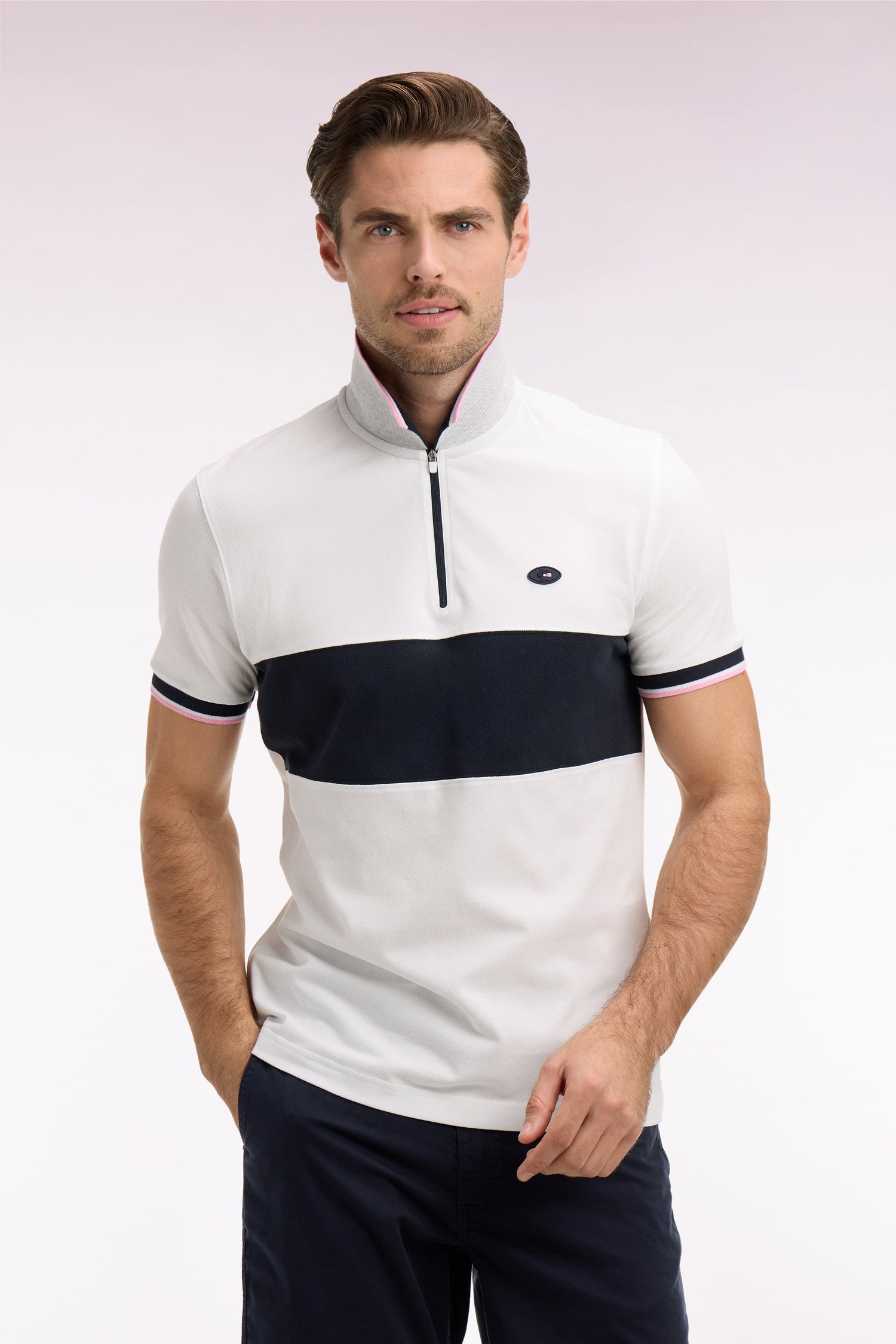 Craquez pour ce polo XV de France disponible en marine ou en blanc. Avec ses bordures de manches et de col tricolores marine, blanche et rose, son dessous de col chiné et sa large bande contrastée sur la poitrine, ce modèle allie élégance sport chic et dynamisme. Détail unique : ce polo ne s'agrémente pas d'une patte de boutonnage mais d'un zip soigné pour une allure plus urbaine.