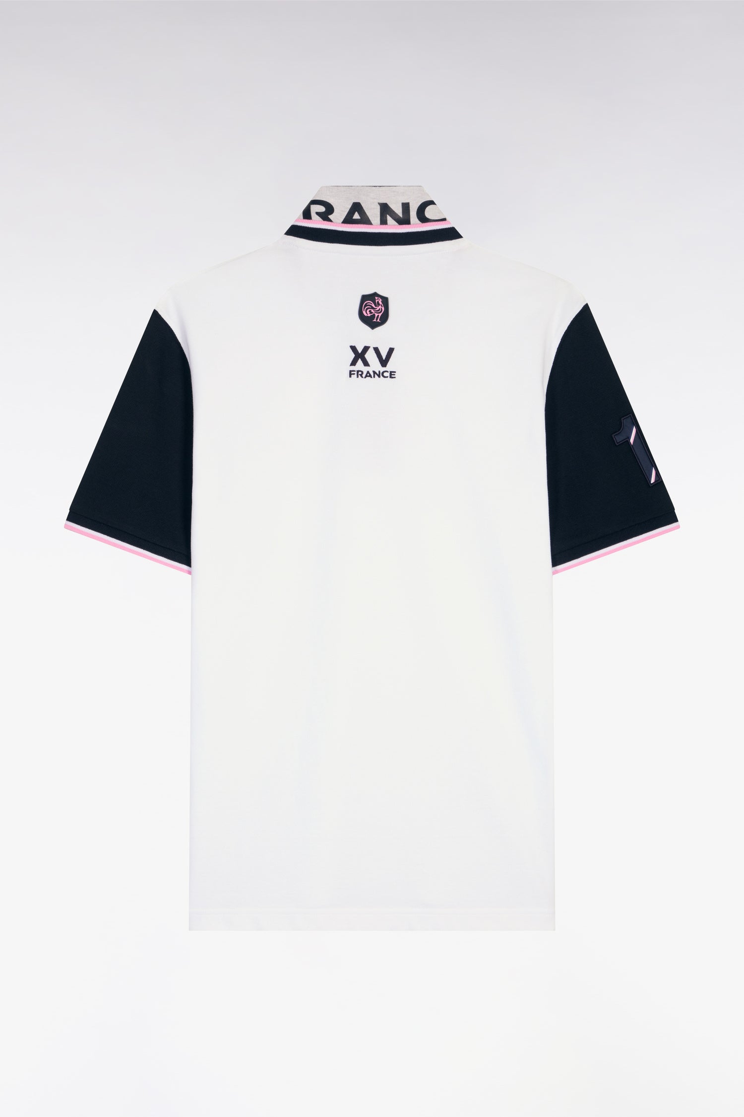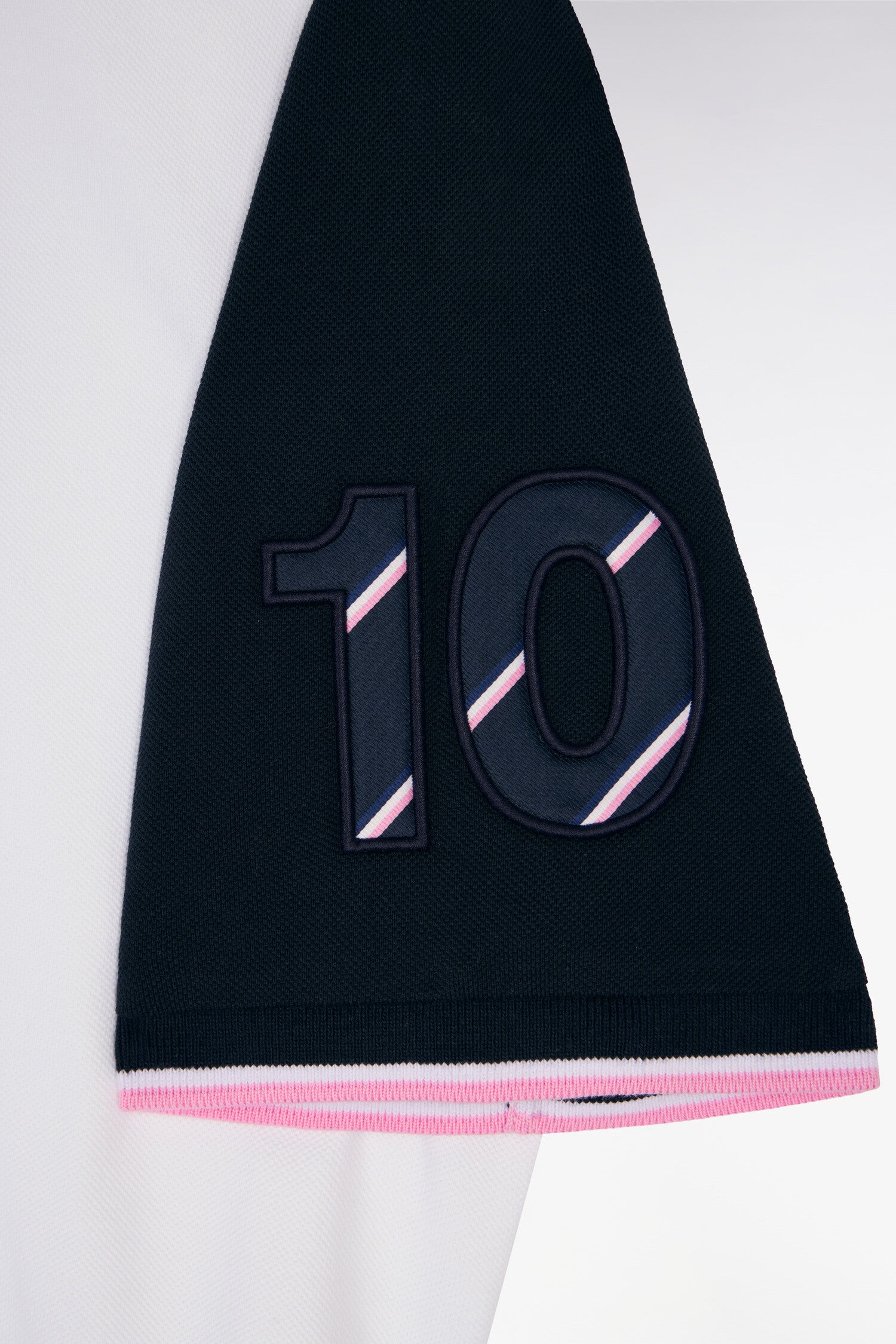 Ce polo en piqué de coton affirme un style résolument rugby grâce à son col sur lequel un tricotage jacquard affirme fièrement son attachement à la France, clin d’œil direct au XV de France. Ses manches contrastées, agrémentées d'une broderie rehaussée de notre iconique tissus cravate, et son écusson officiel FFR en font une pièce forte, pensée pour accompagner les supporters de cette équipe mythique du stade à la ville. Allure dynamique, détails identitaires et esprit sport chic se conjuguent dans ce trio de polos à manches courtes emblématiques de nos collections de mode. À associer avec un jean, un short ou pourquoi pas un chino pour une allure sport-chic.