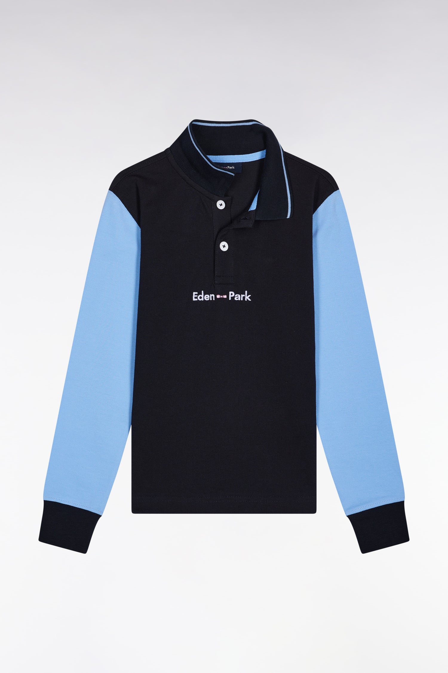 Inspiré de l’univers rugby, ce polo marine à manches longues en coton piqué affirme un look sport-chic avec ses manches contrastées ciel et sa rayure discrète sur le pourtour du col polo. La large broderie Eden Park sur la poitrine signe ce modèle iconique, à la fois dynamique et confortable pour accompagner les enfants dans tous leurs mouvements