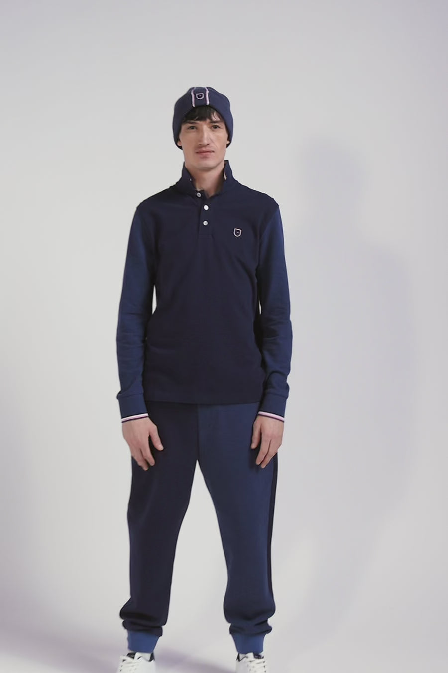Polo manches longues en piqué coton bleu marine col jacquard écusson gomme coupe Regular