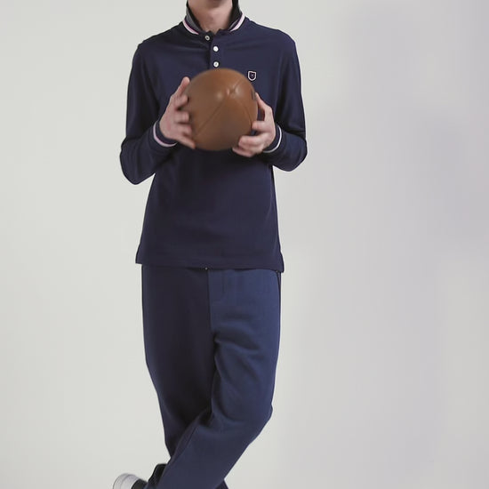 Confectionné en coton piqué doux, ce polo manches longues est orné d'un col tricolore pour une touche preppy. À l'arrière, le tricotage jacquard permet de signer ce polo du nom de notre maison pour un style sportif et travaillé à la fois. Retravaillée sous la forme d'un écusson en gomme, notre emblématique nœud papillon s'ajoute à cet intemporel.