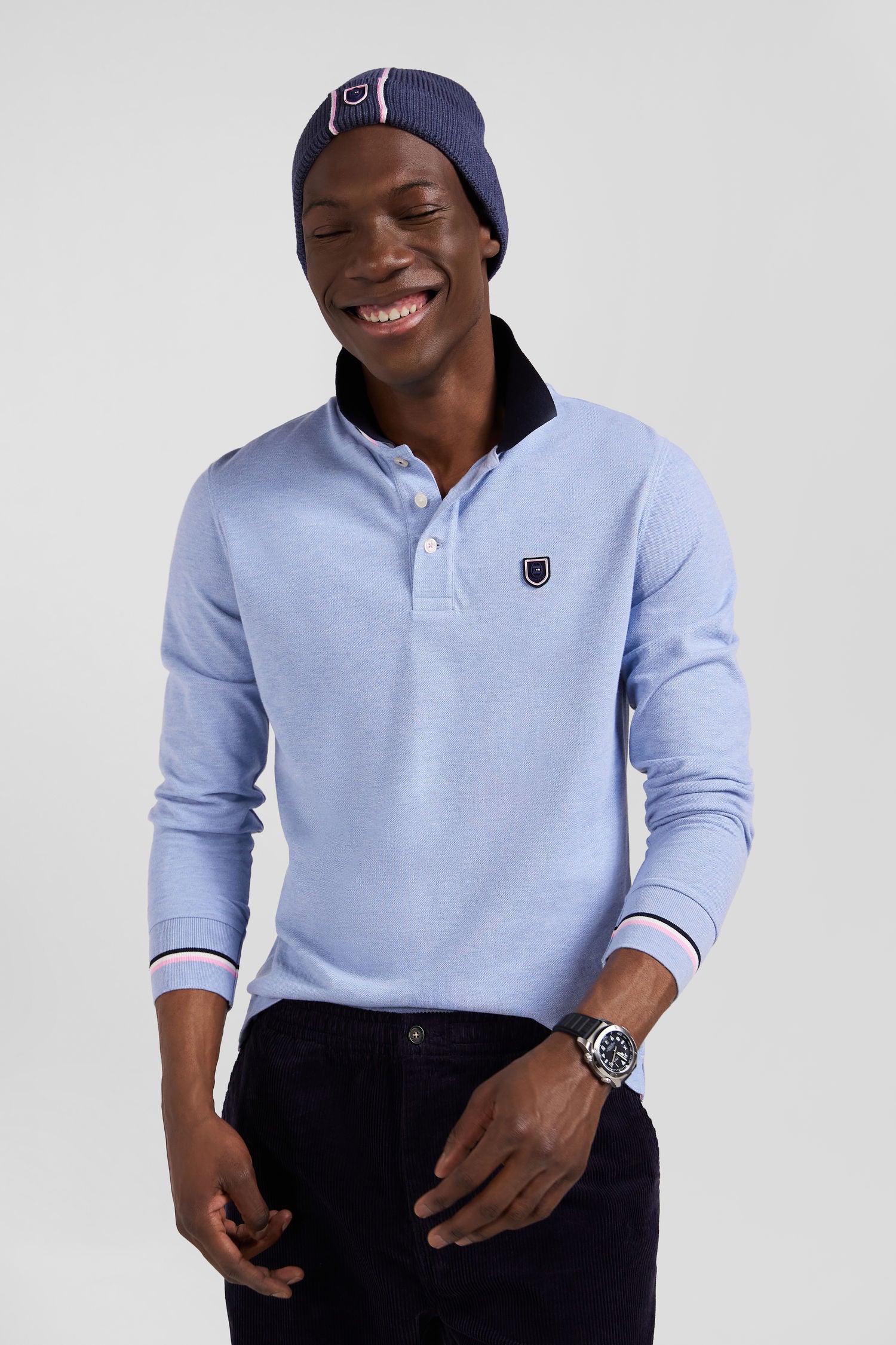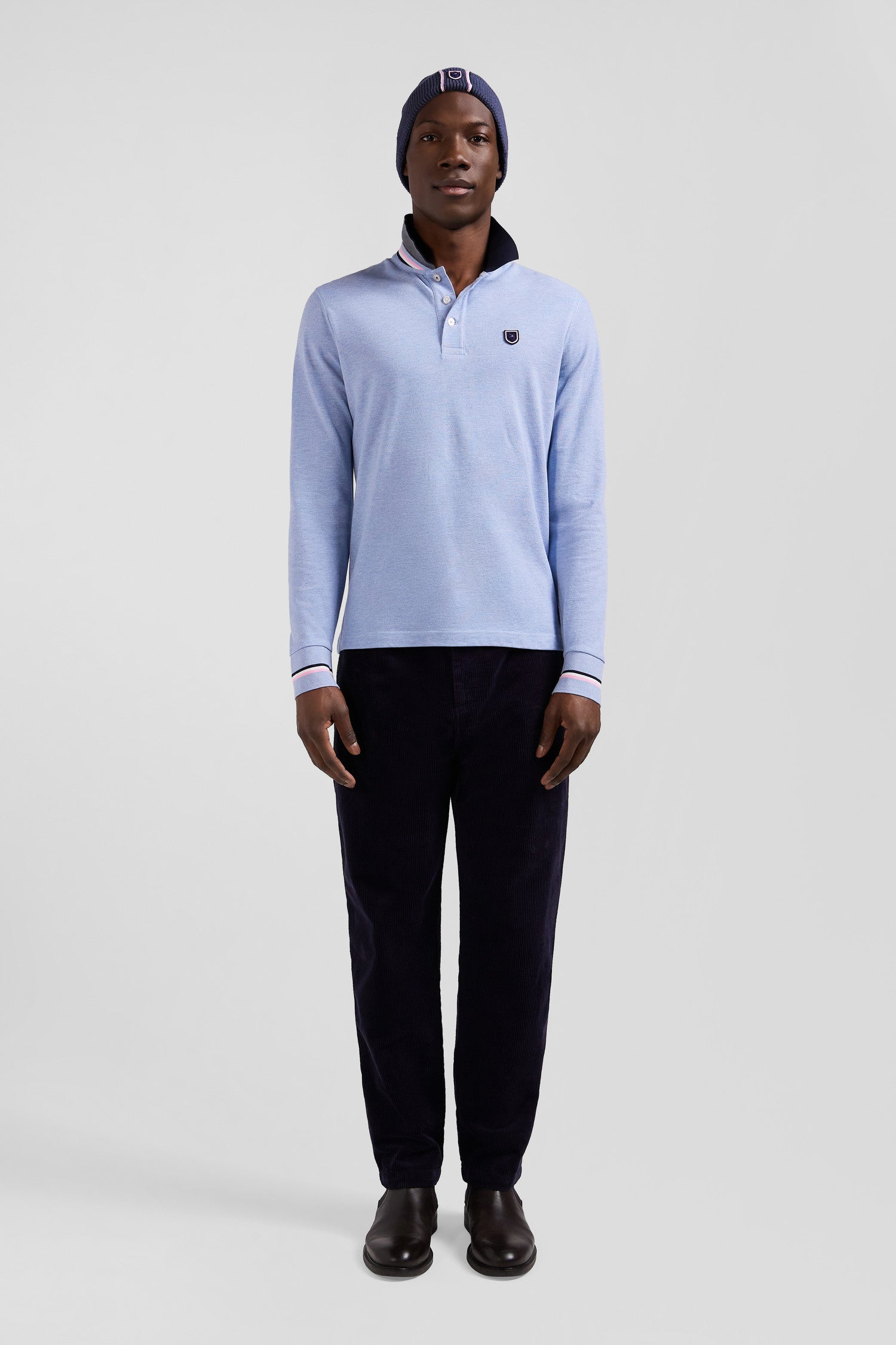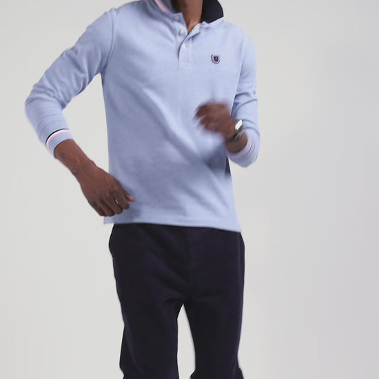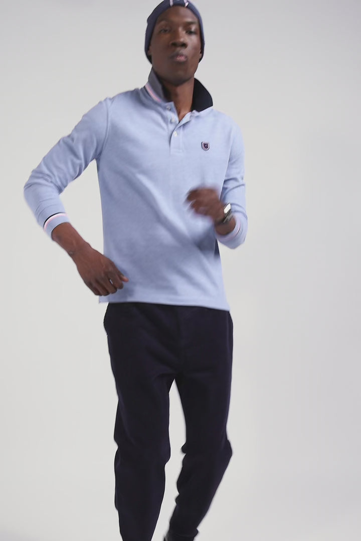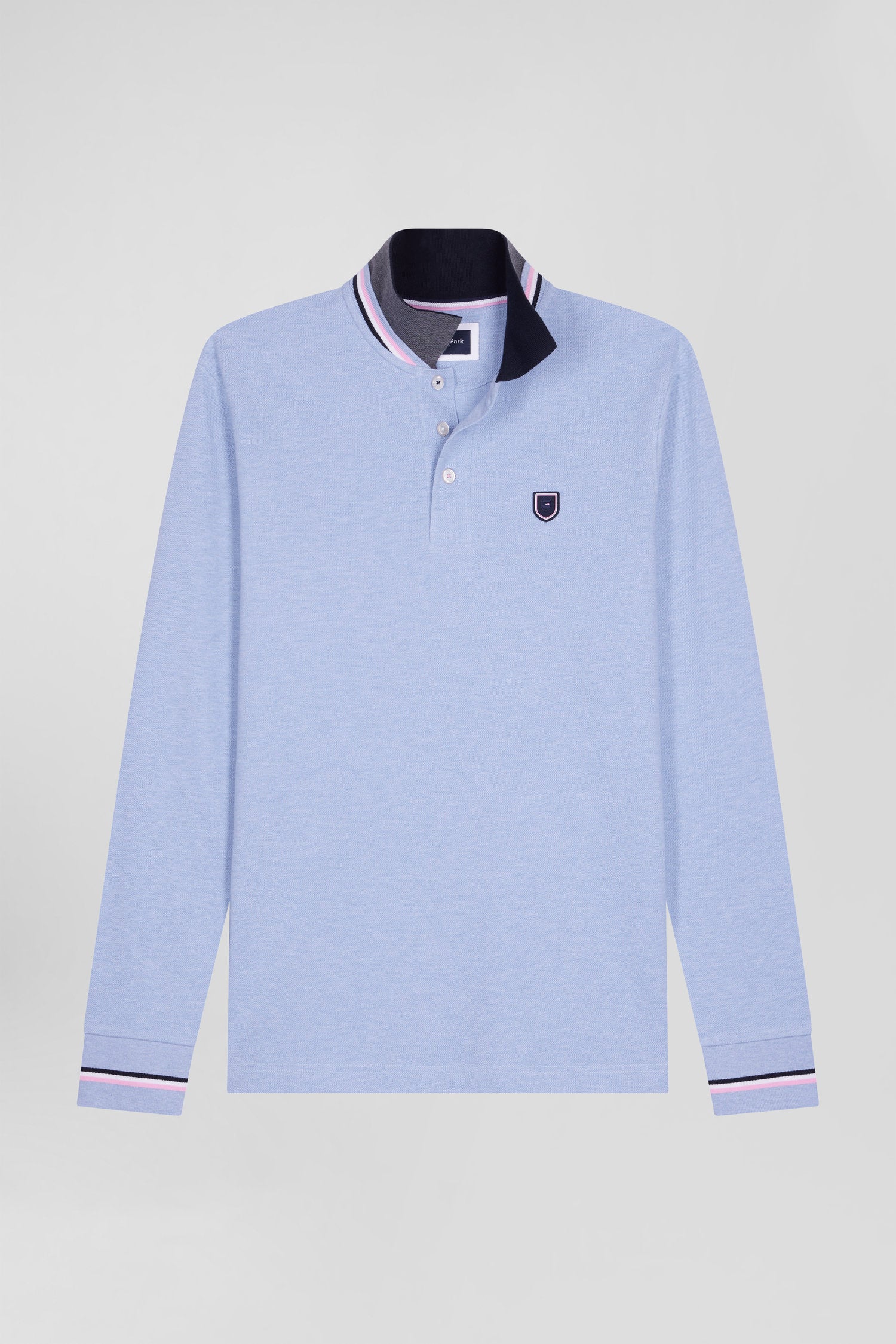 Polo manches longues en piqué coton ciel écusson gomme coupe Regular