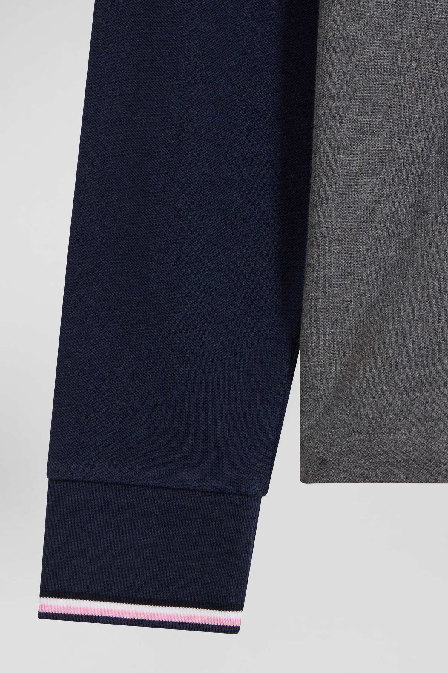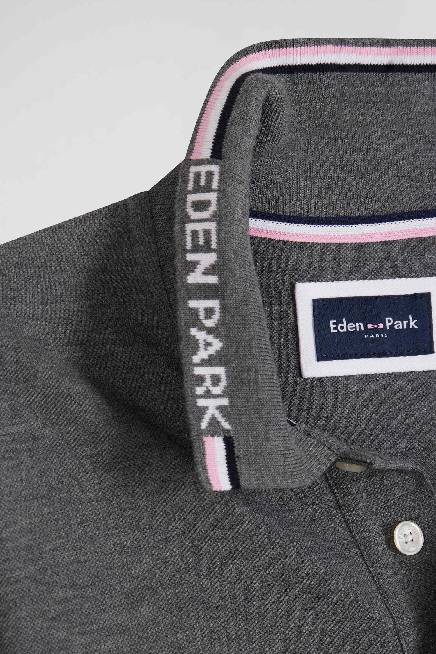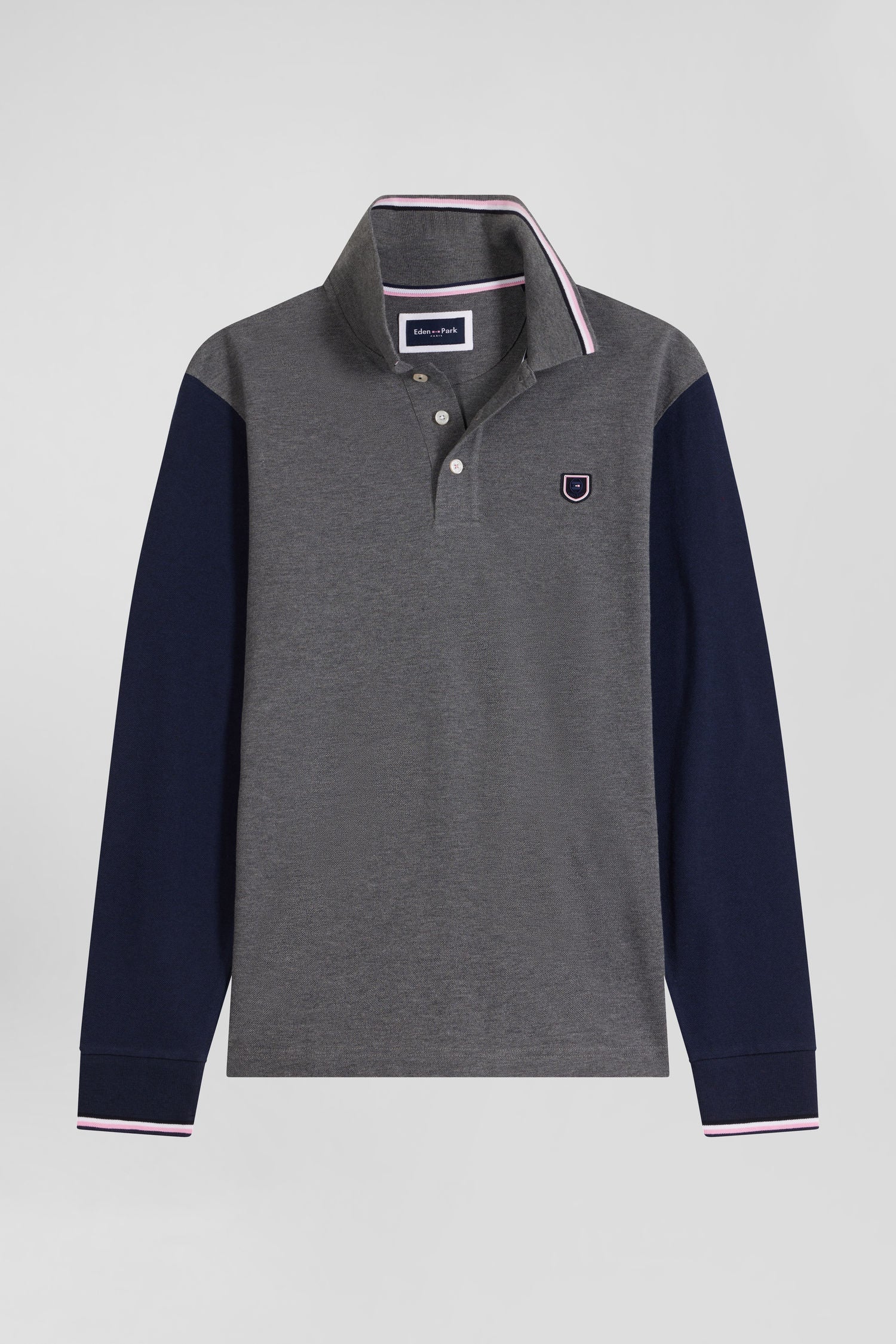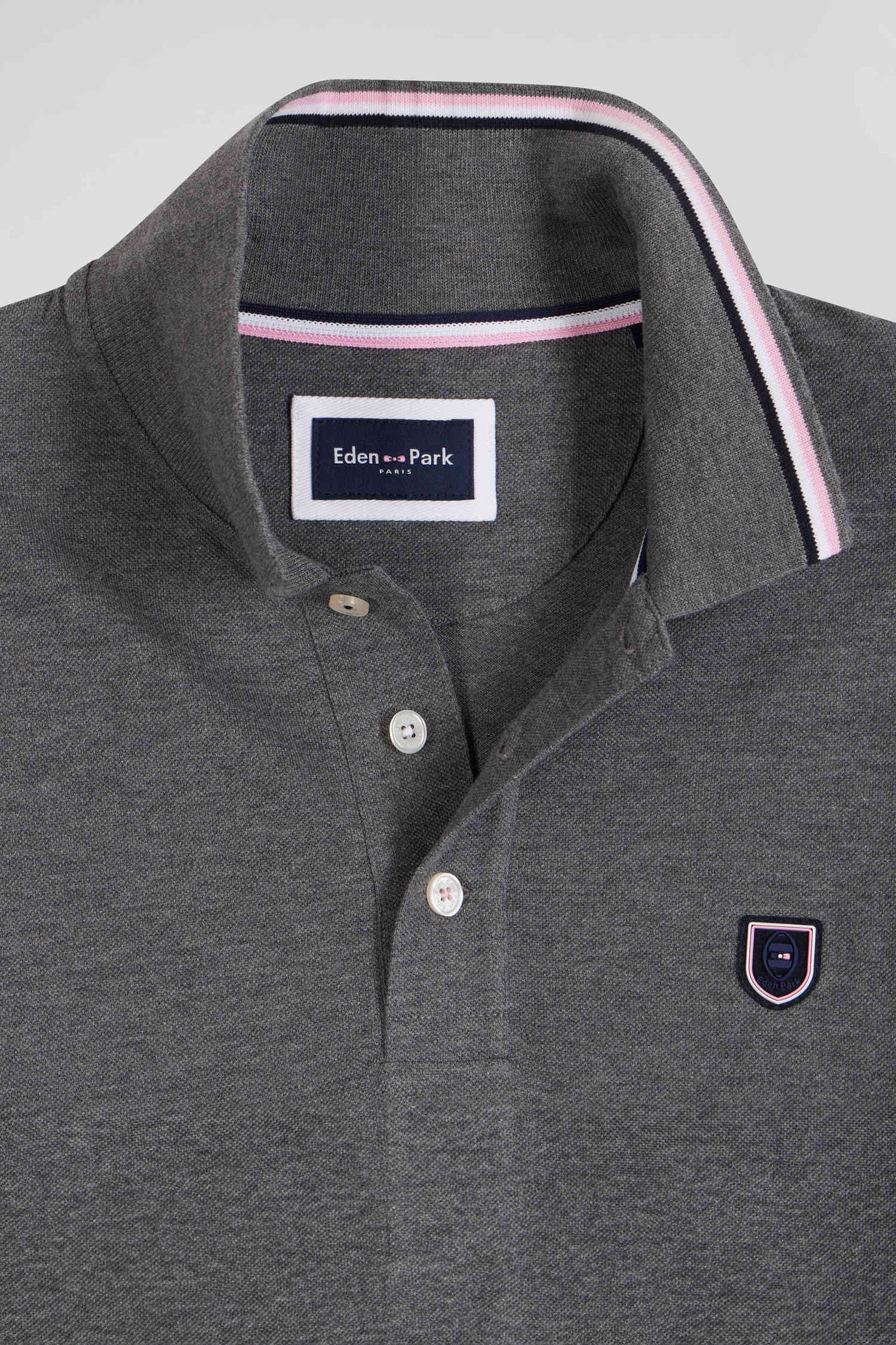 Polo manches longues en piqué coton gris col jacquard écusson gomme coupe Regular