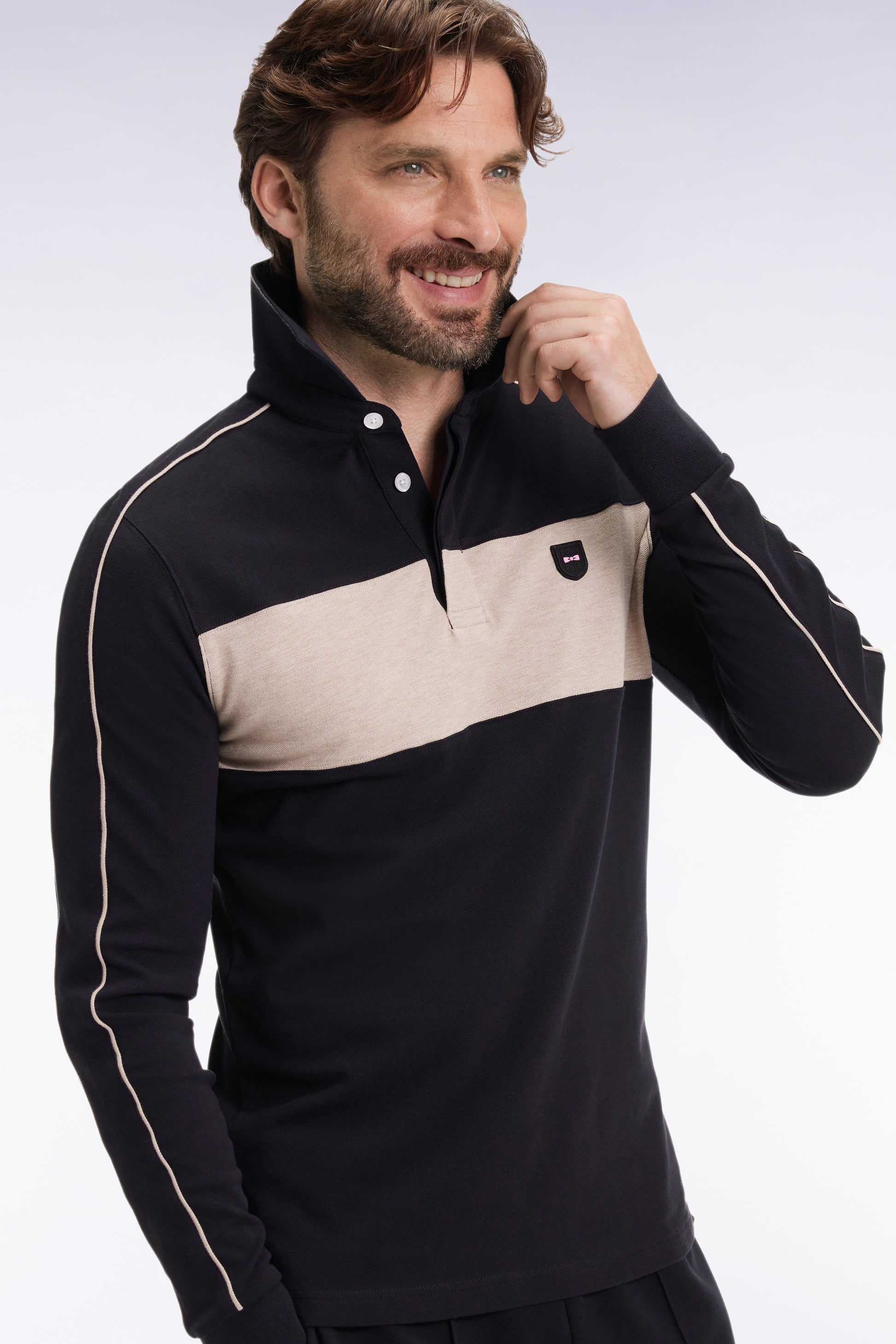Polo tricolore à manches longues en coton stretch noir coupe slim