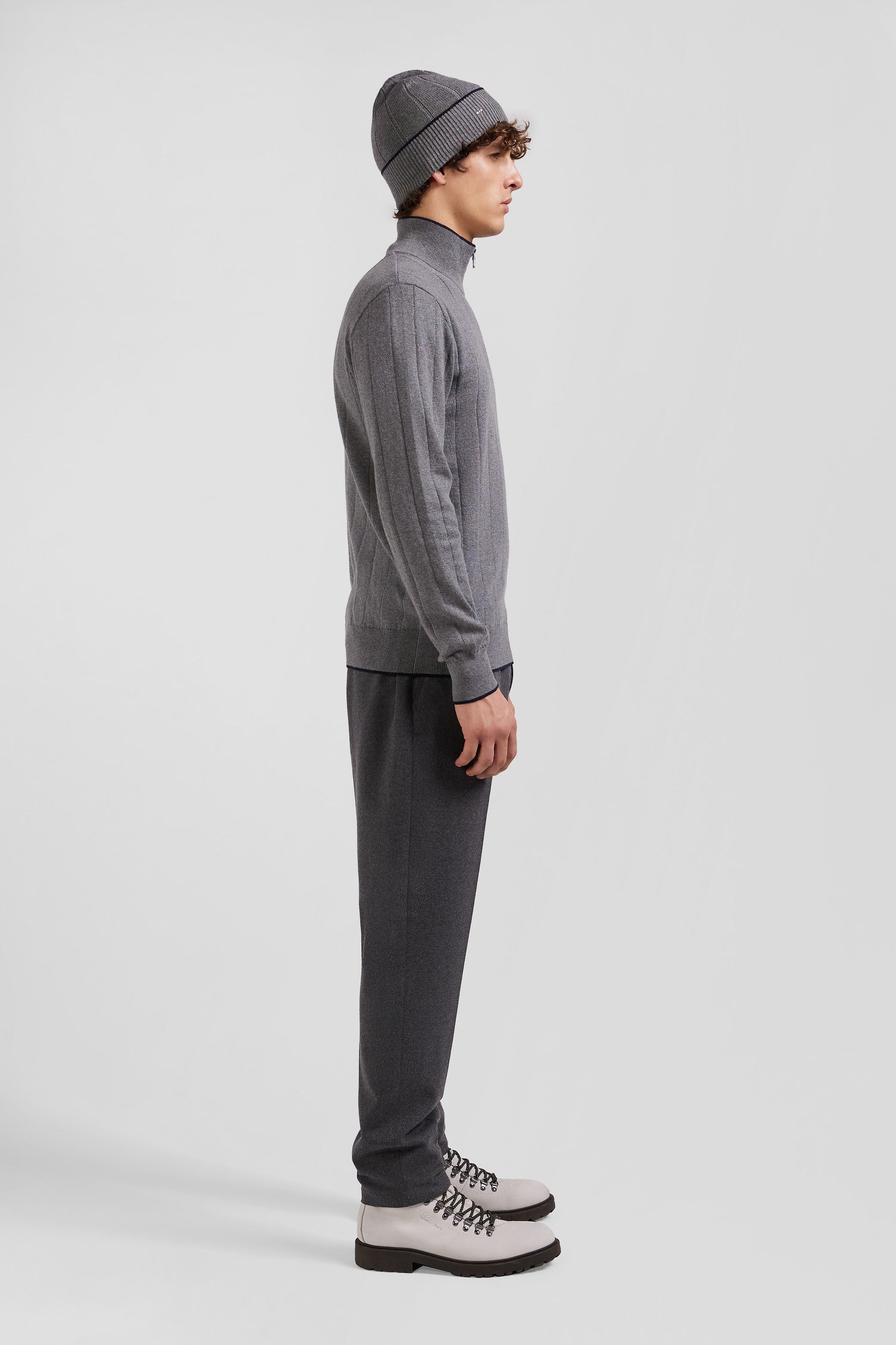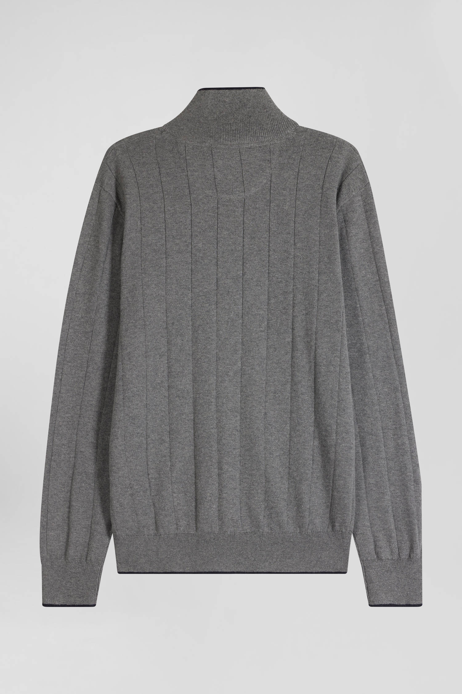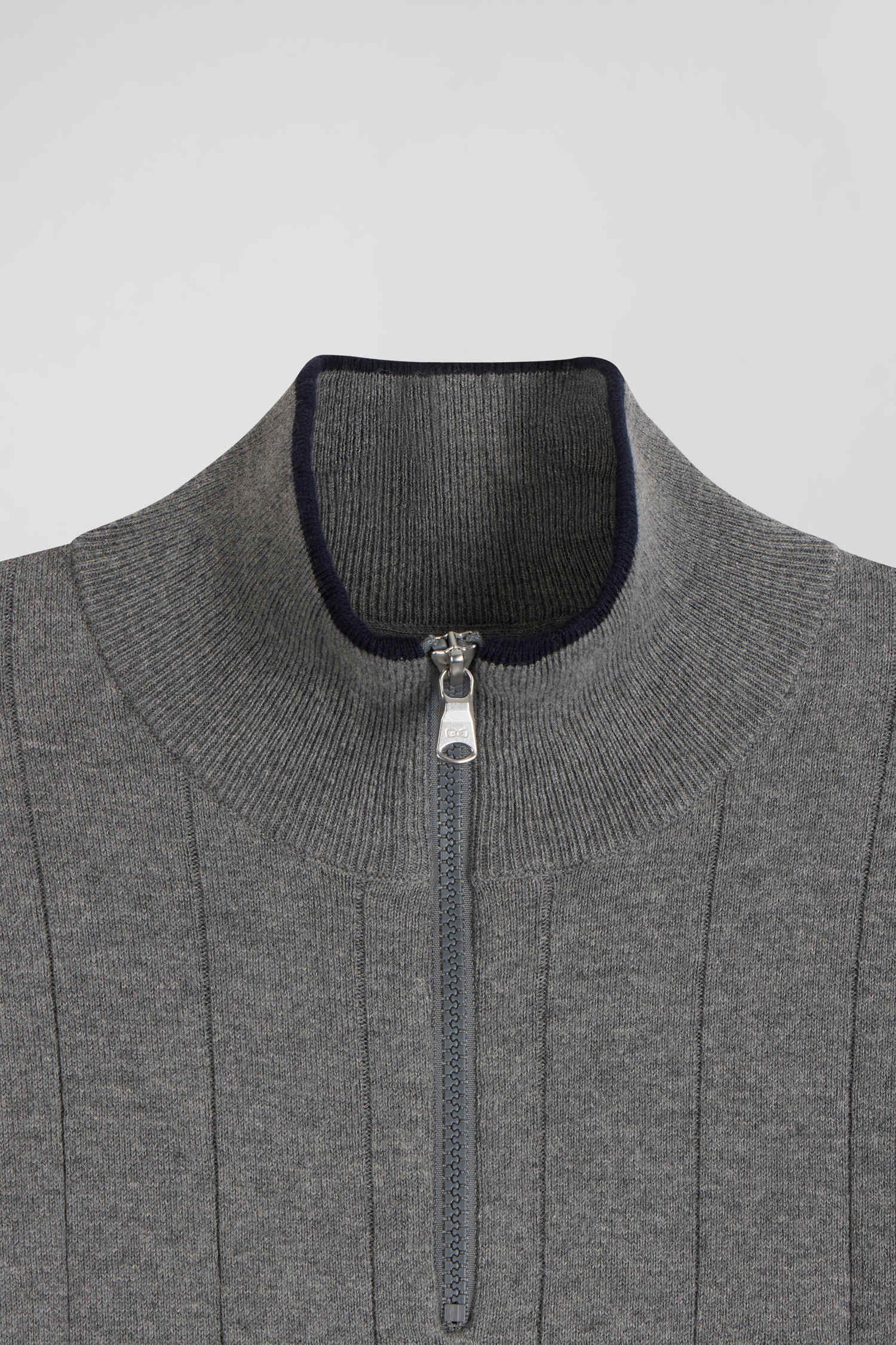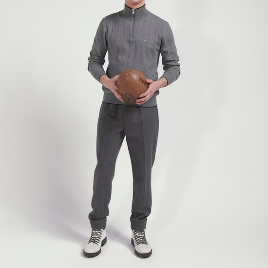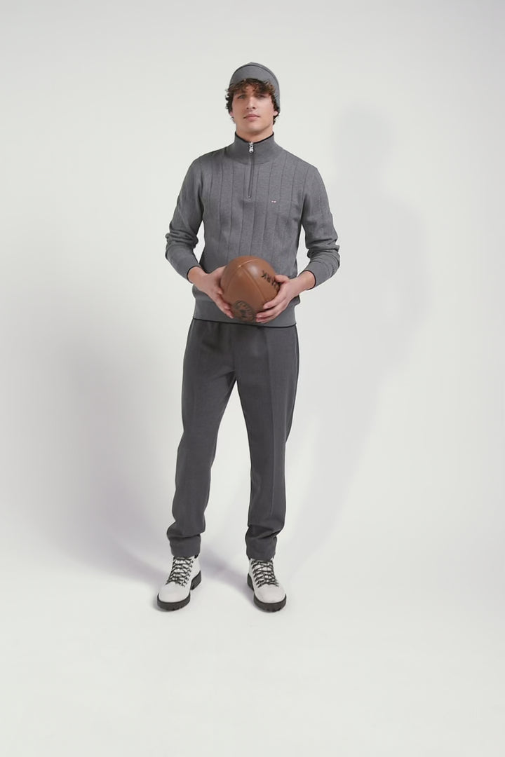 Notre pull pour homme en jersey de coton et cachemire présente un col camionneur zippé rehaussé d'un fin liseré contrasté. Tricoté en côtes plates, ce pull masculin rend hommage à la rayure cerclée emblématique du rugby, savamment retravaillée de manière verticale pour une touche moderne. Ses finitions soignées, comme son ruban tricoté à l'intérieur du col font de ce pull disponible en coloris marine ou gris, la pièce parfaite pour ajouter une touche de sophistication décontractée à votre vestiaire.