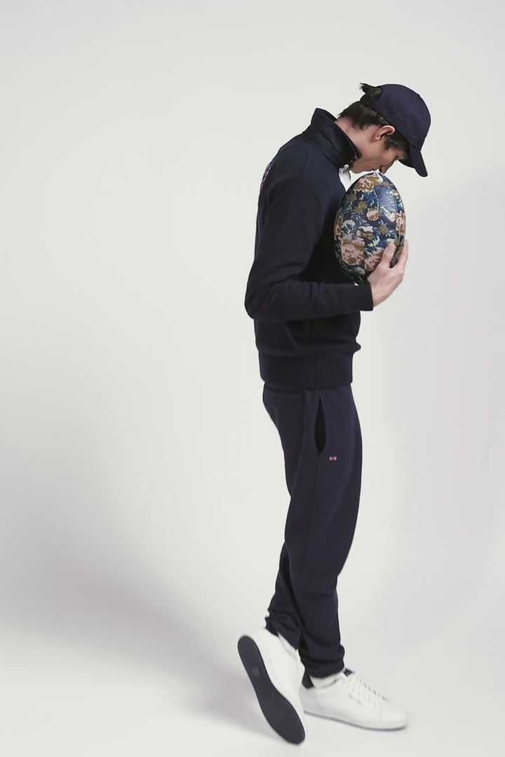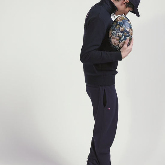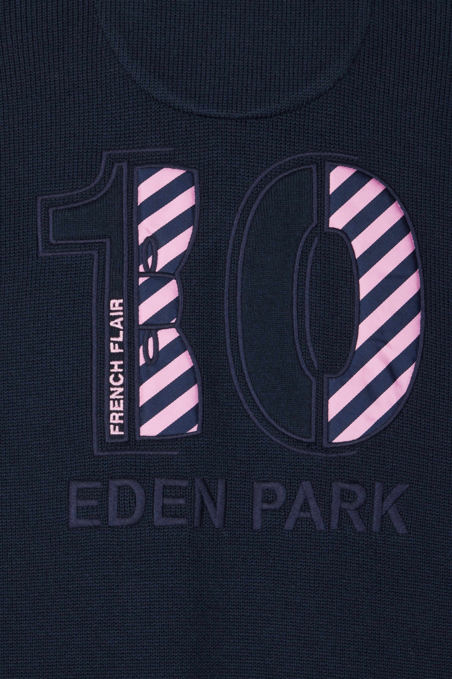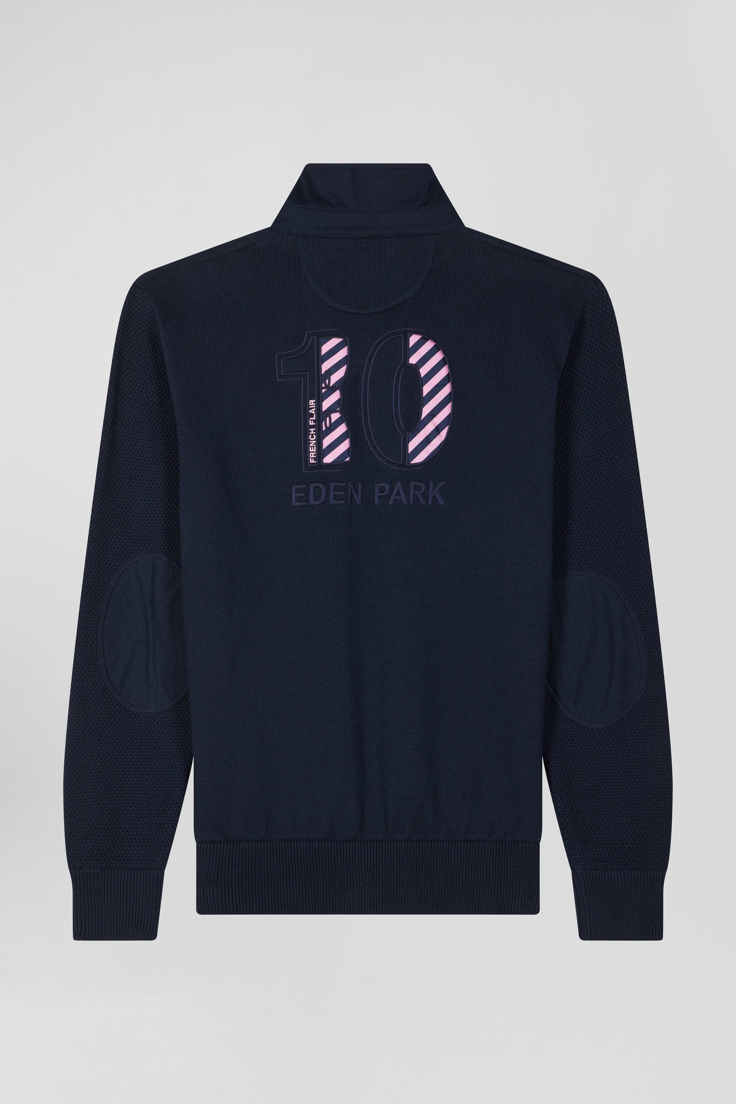 Ce pull homme marine en coton affiche une élégance sportive avec son col maillot en twill et un ruban de propreté intérieur de col contrasté. Le contraste des textures est mis en avant par un tricotage distinct : jersey envers pour le corps et point piqué pour les manches, complété par des coudières en point jersey envers. Le montage soigné de cette pièce assure une finition impeccable. À l'arrière, une broderie du numéro 10, rappelant le maillot de Franck Mesnel, est rehaussée par un tissu cravate cerclé.